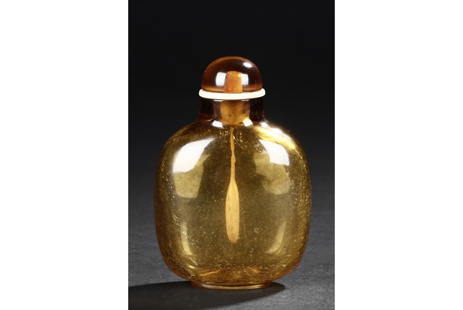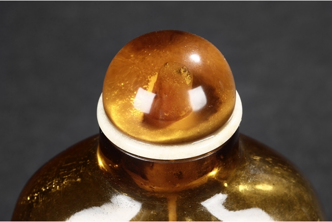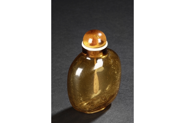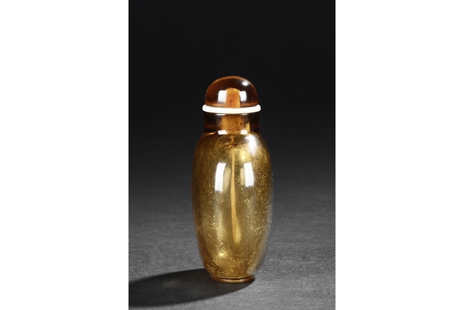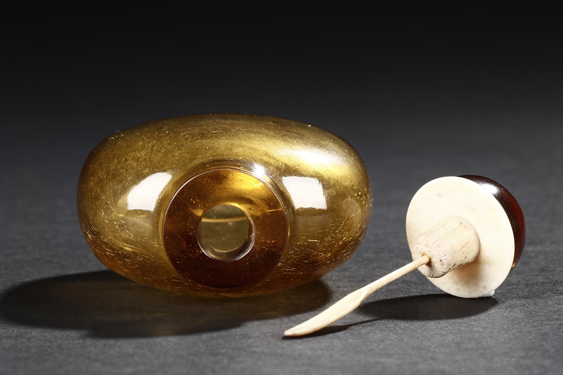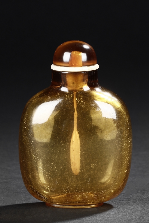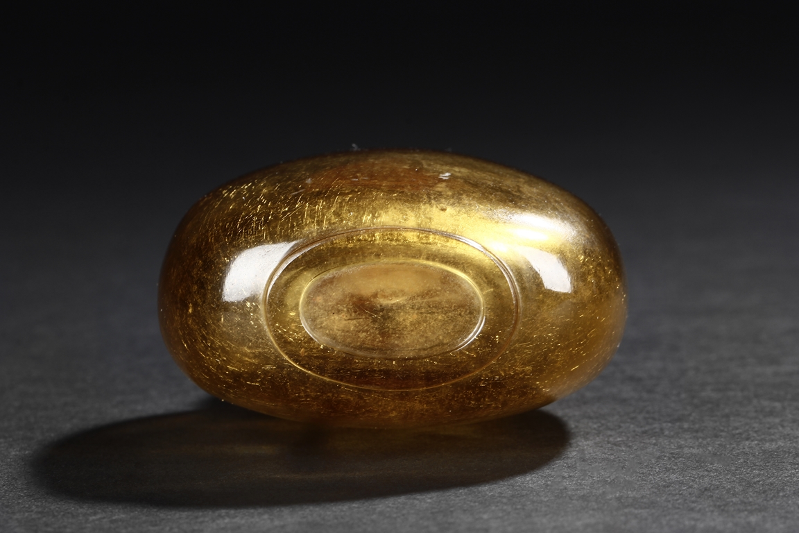 Of flattened ovoid form with smooth shoulders and bottom, the snuff bottle with transparent golden color, visible thin golden lines within the snuff bottle, complete with domed golden stopper. Qing Dynasty Period.