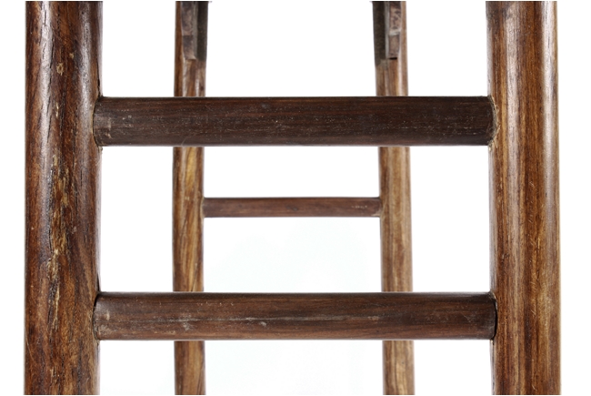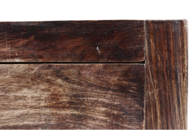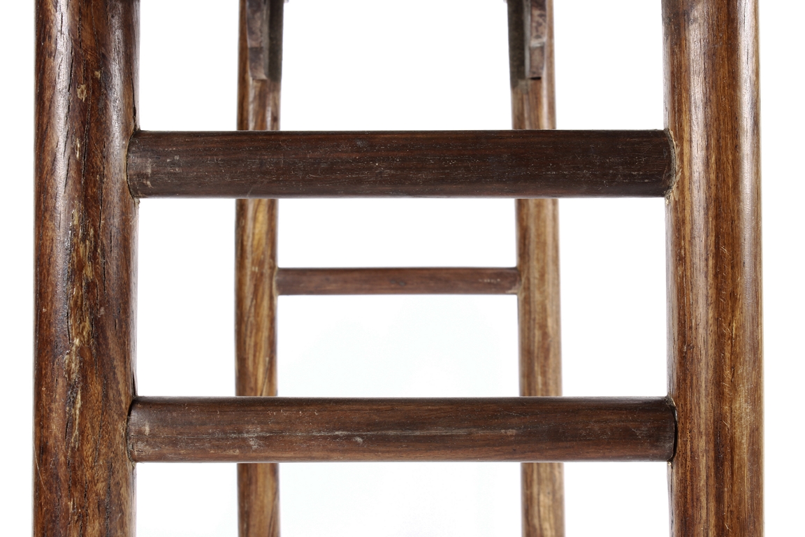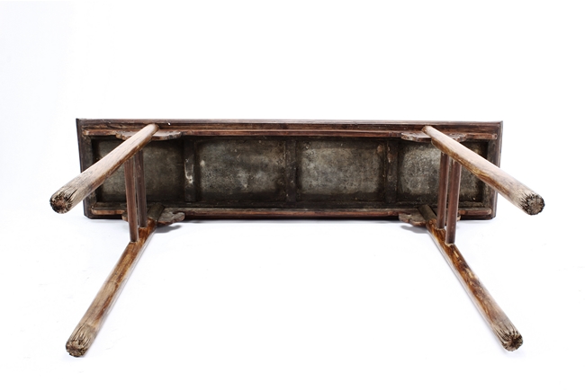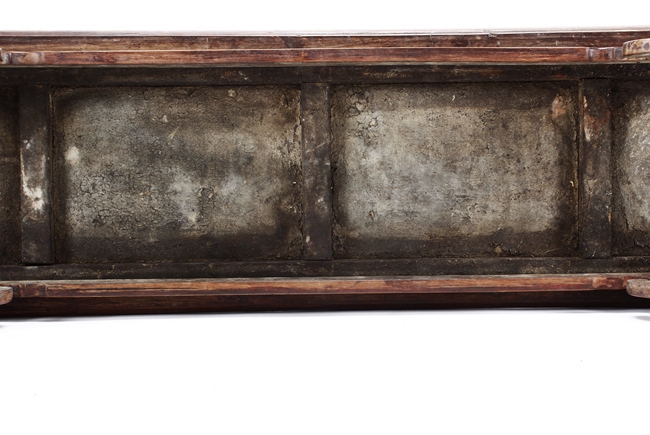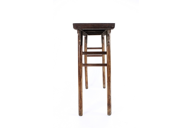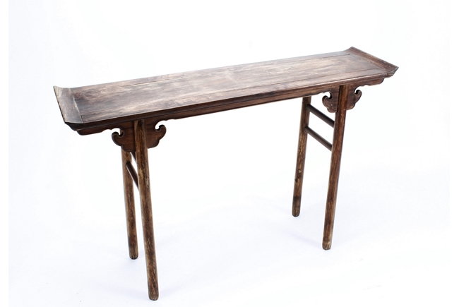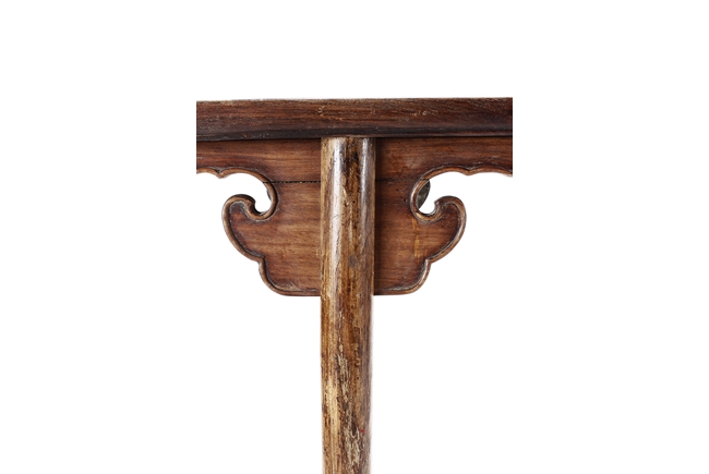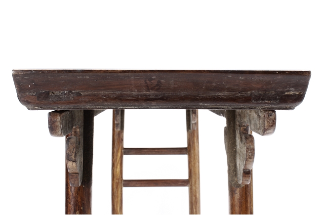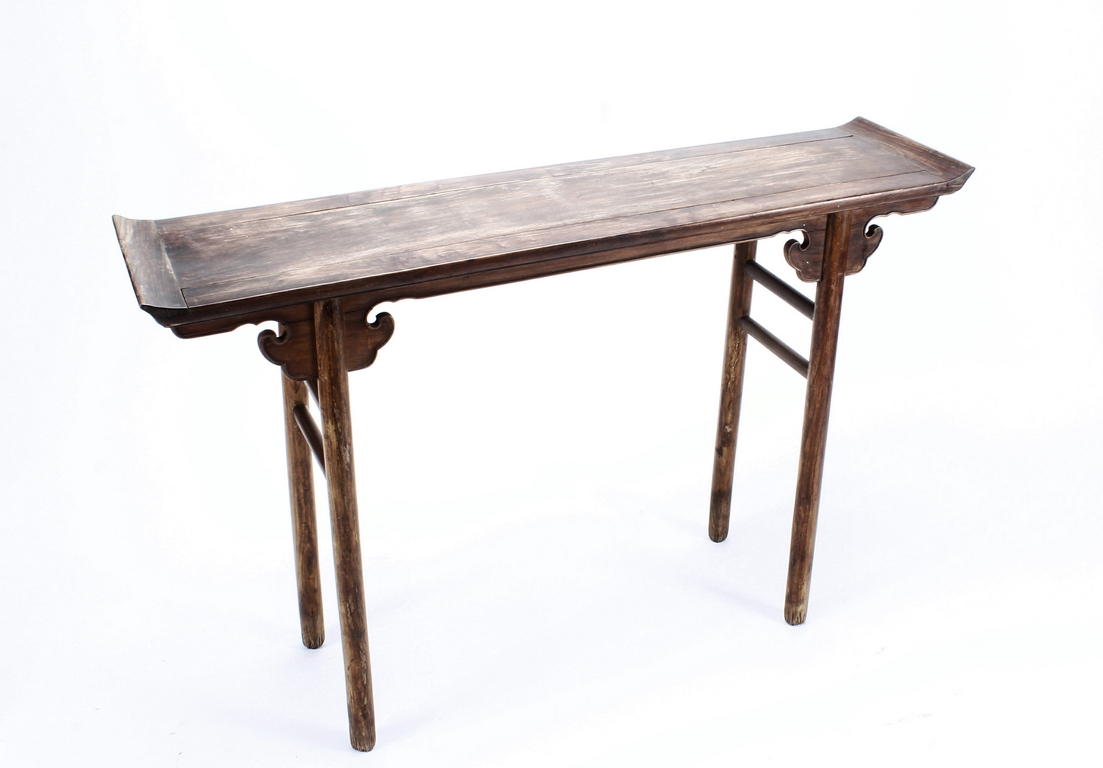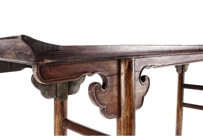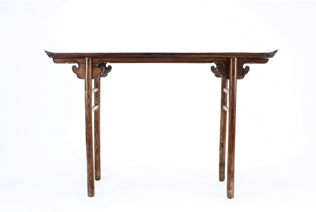 The side table is of rectangular form, the top with a central wood piece surrounded by four strips of smaller wood pieces, the ends raised upwards, the apron slim and carved in ruyi shape at the columnar legs, two additional wooden bars attached to each pair of legs, the wood of natural orange-brown color and grains, made from Huanghuali wood. Qing Dynasty period.