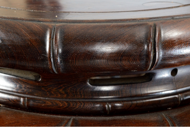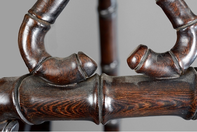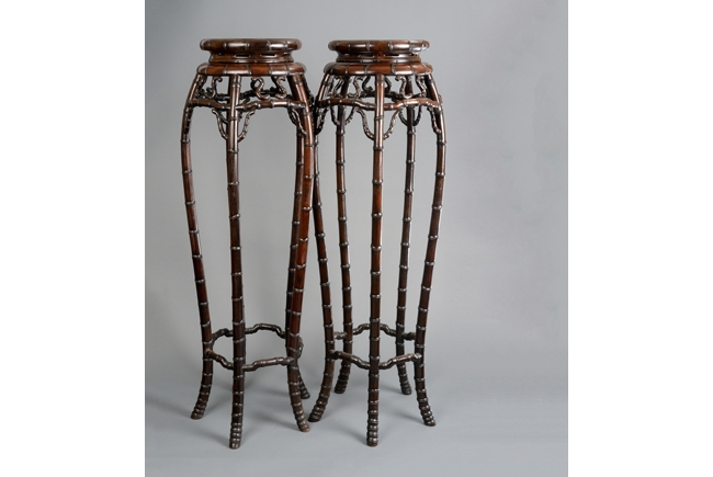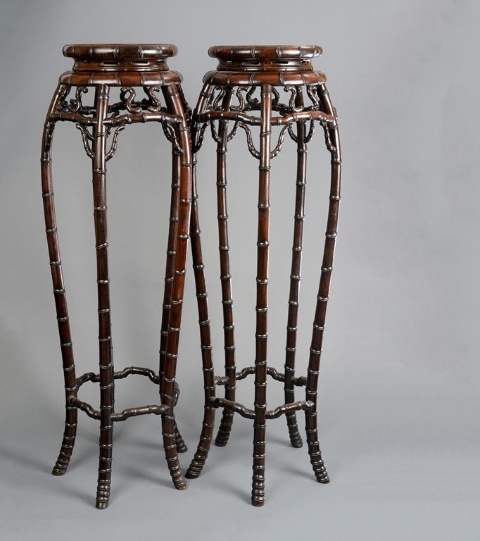 A pair of flower stands in the style of faux bamboo, and is constructed of Jichimu, inset with burlwood panel, the long cabriole legs with raised stretchers near bottom.