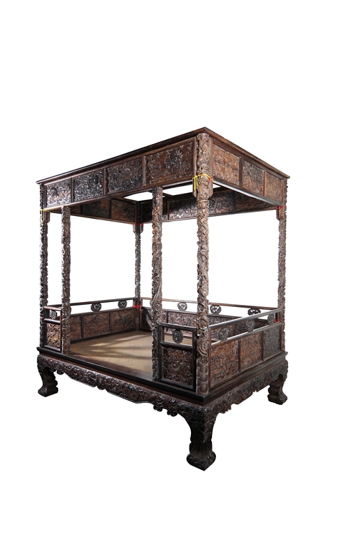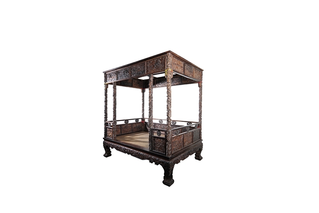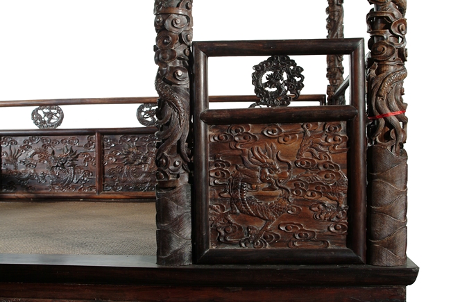 此紫檀木大床雕工精細複雜,用料大方,層次分明,原汁原味,為收藏者所愛
