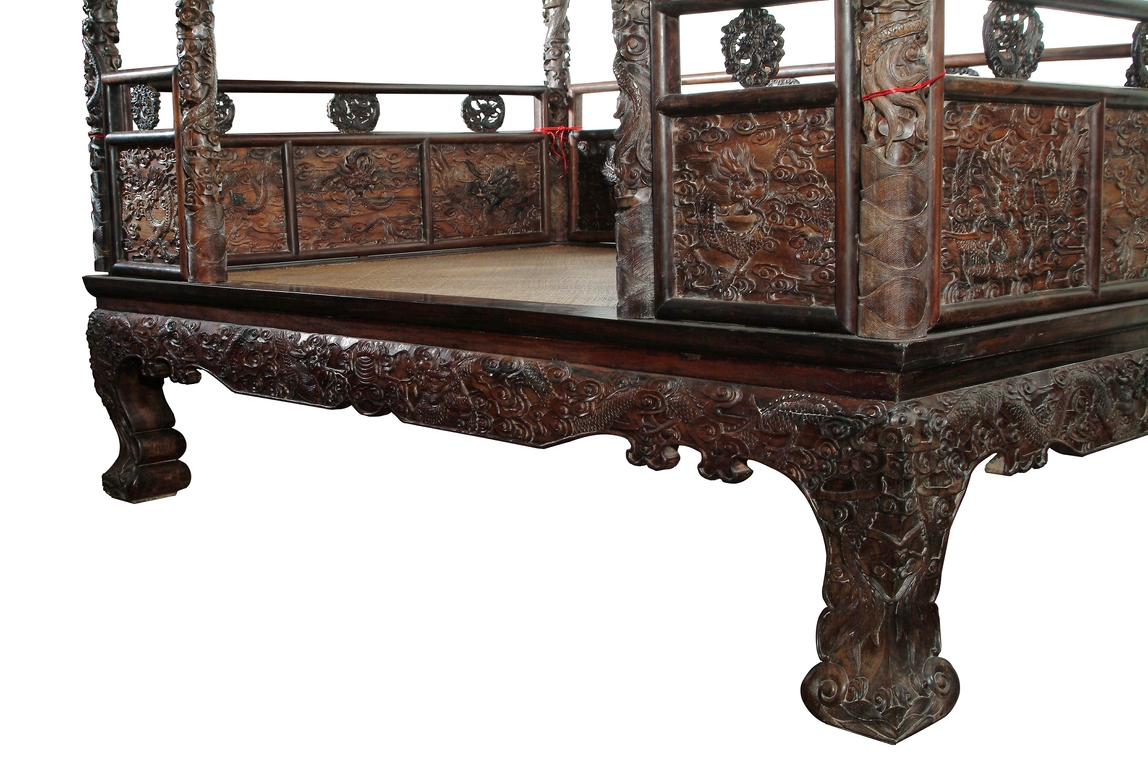 The soft matted sleeping platform within a rectangular, mitered frame, molded with a waisted apron and raised on corner legs of square section ending in hoof feet, the front, back and side railings in low relief dragon carvings, joined by six baluster form upright carved dragons posts, joined to five similarly carved dragon panels along the sides and surmounted by a carved dragon canopy. 19th century.