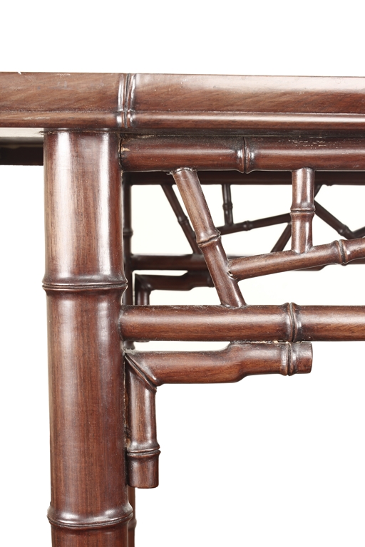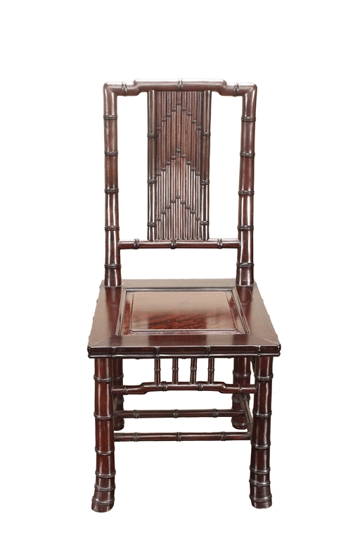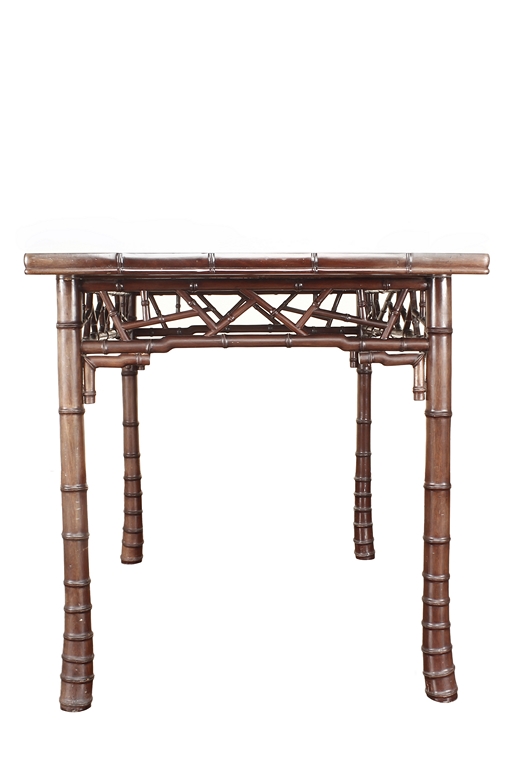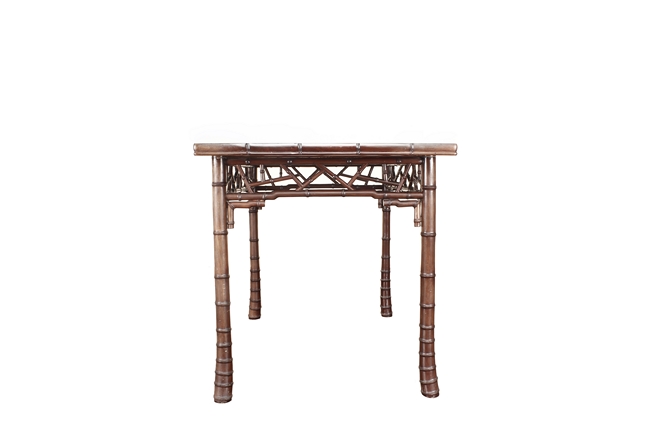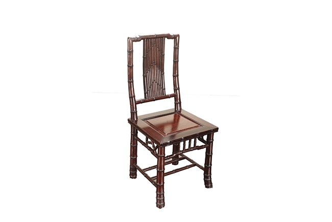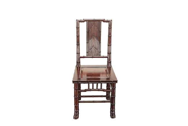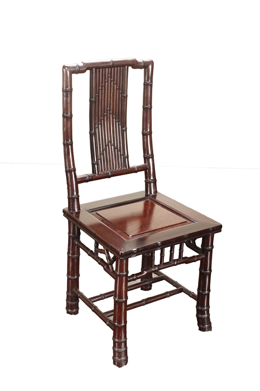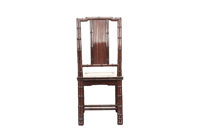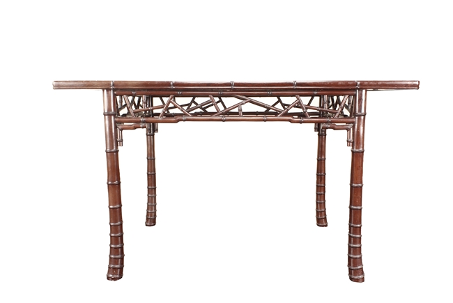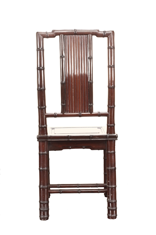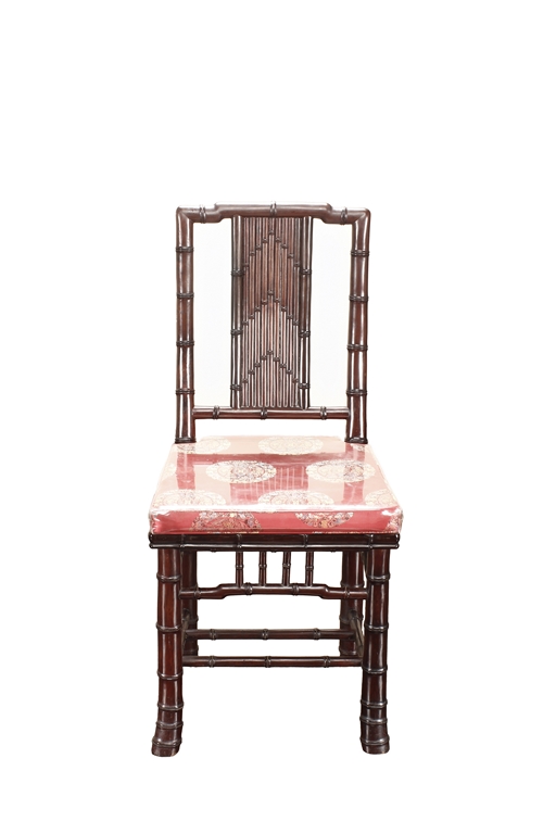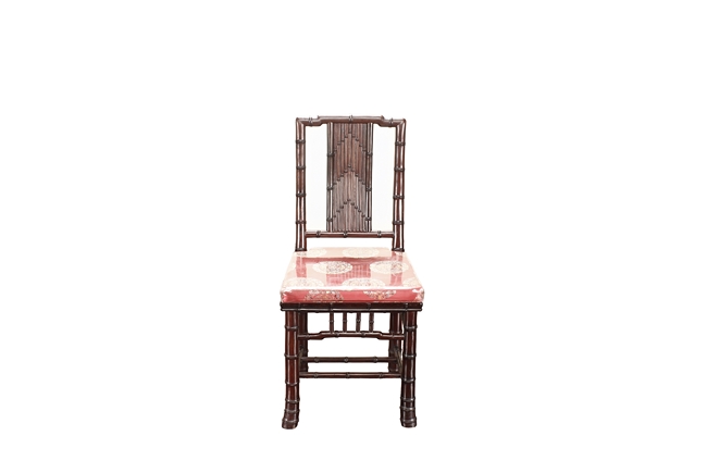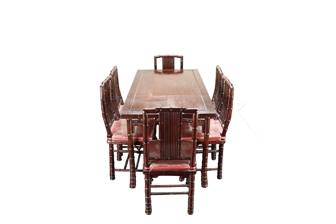 This dining suite comprises a set of six chairs and a table. The legs and spindle-formed back framework are modeled as bamboo trunk. Each chair includes a cushion.