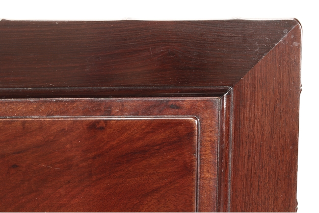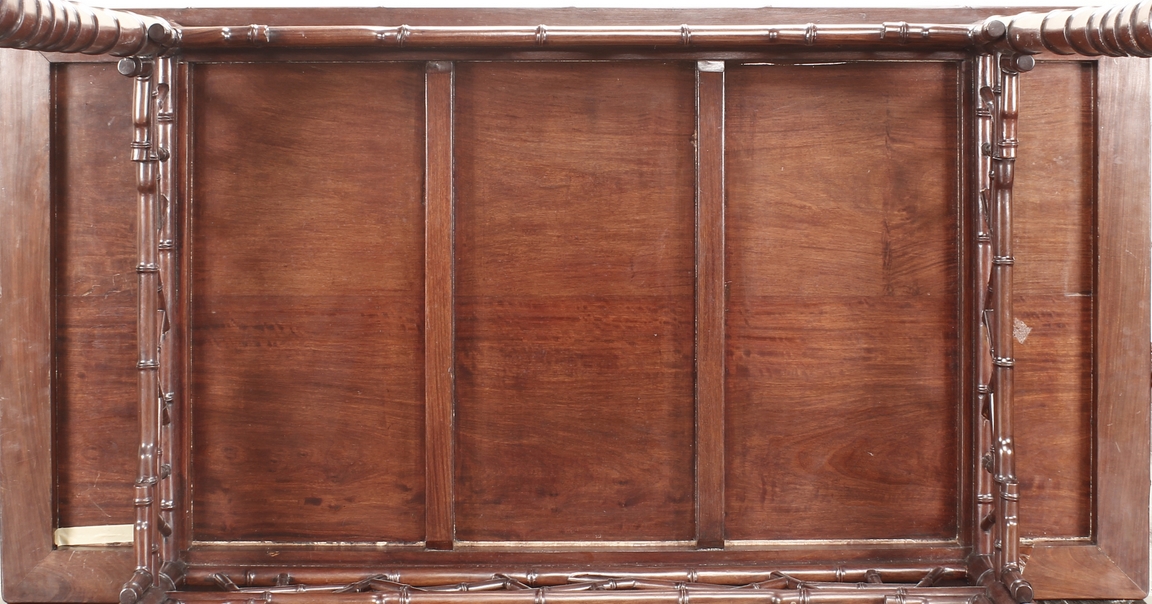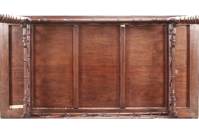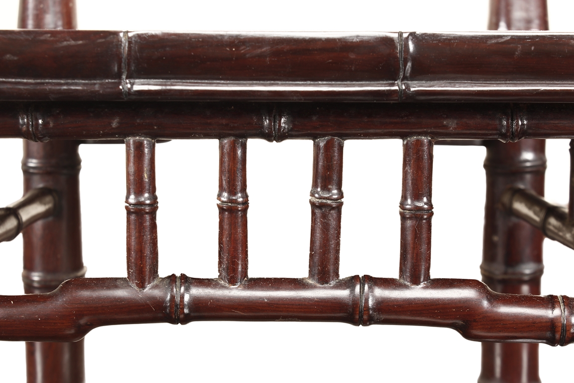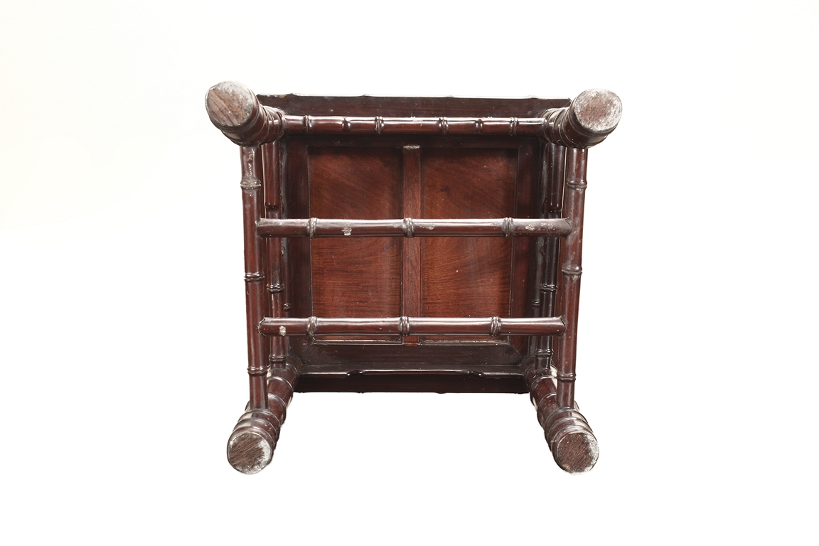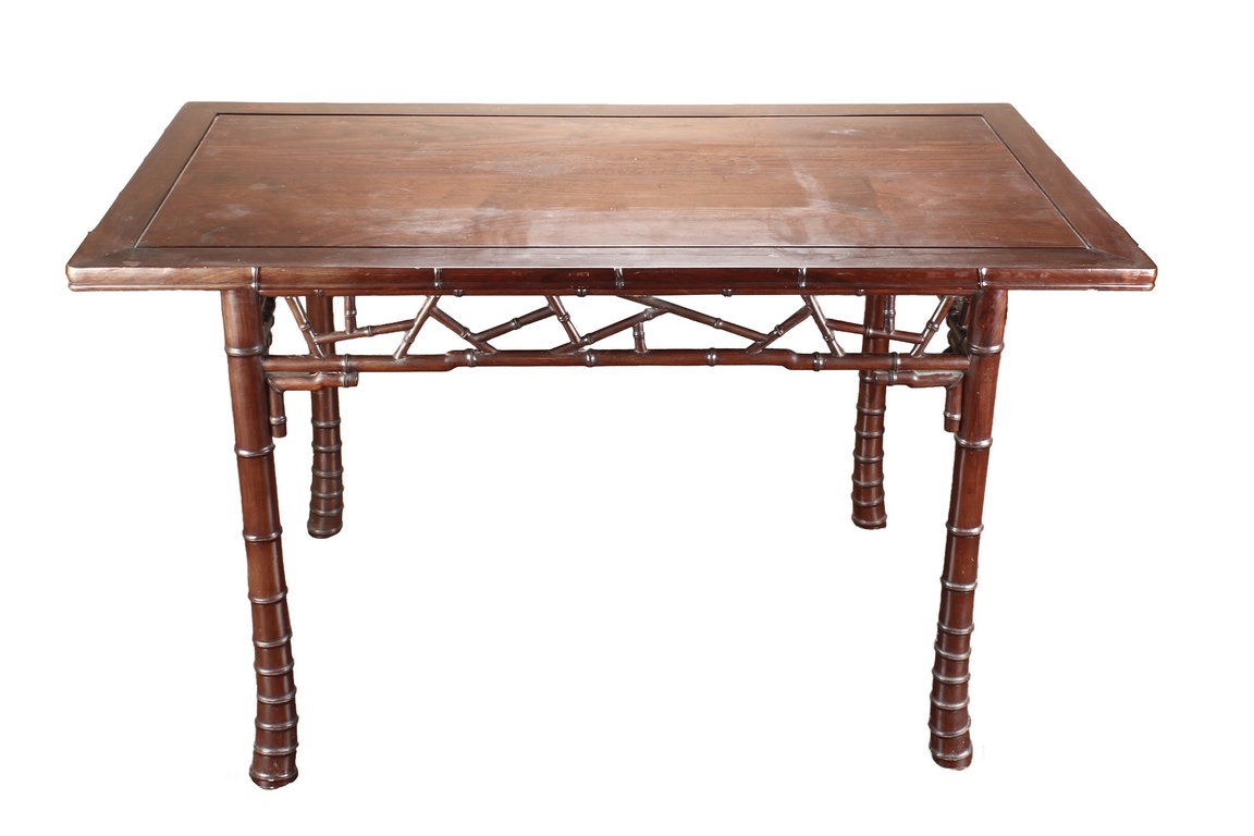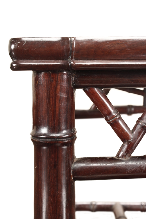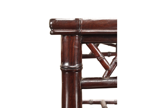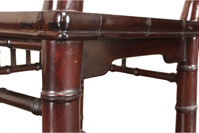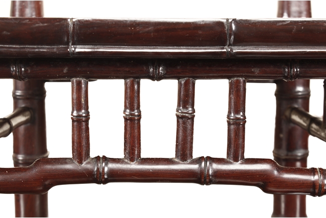 This dining suite comprises a set of six chairs and a table. The legs and spindle-formed back framework are modeled as bamboo trunk. Each chair includes a cushion.