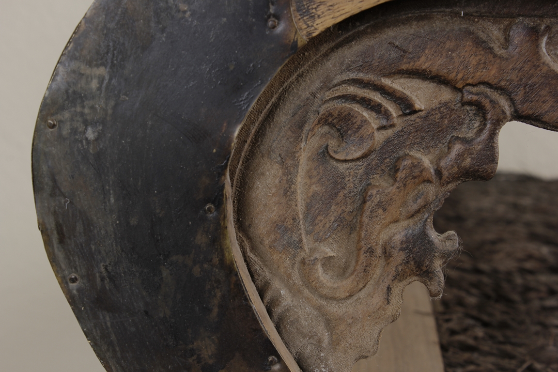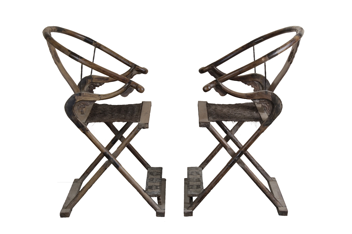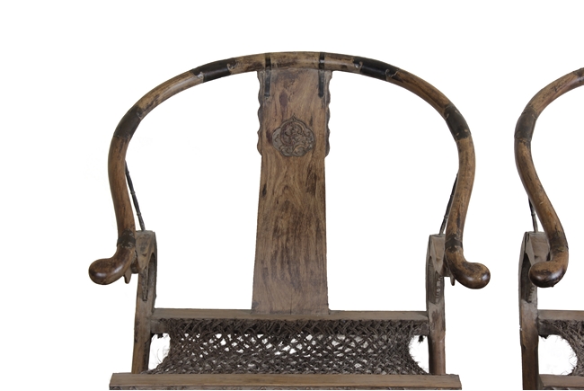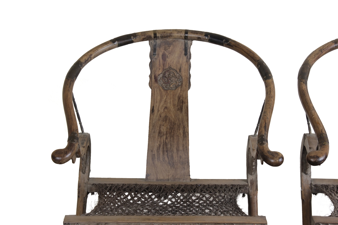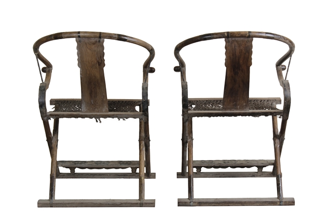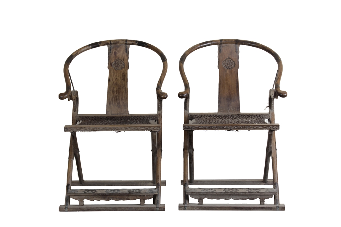 The 'S'-shaped back splats delicately carved with a dragon and a mythical beast design, the curving top-rail supported on the front and back of side posts, the horseshoe terminating in rounded outward hooks, the threaded seat on rounded legs designed for easy folding, with stretchers on the front and back legs. The wood may be Huanghuali. Qing Dynasty period.Collector Mr. Tian, Thailand.