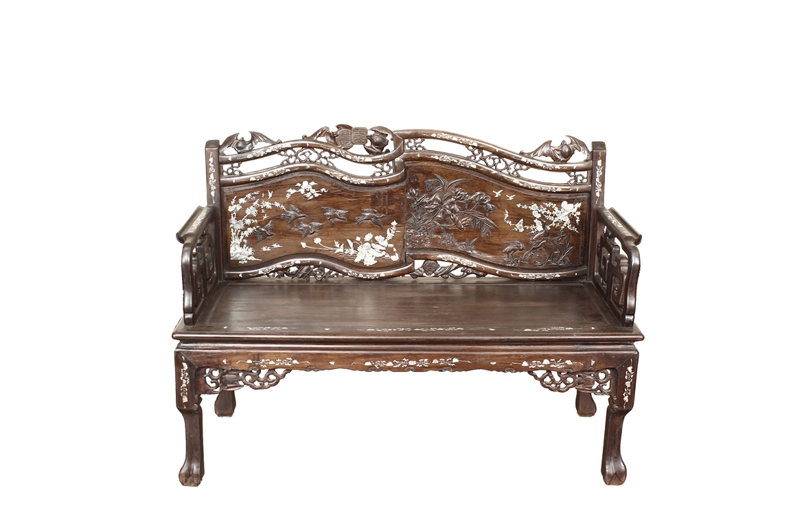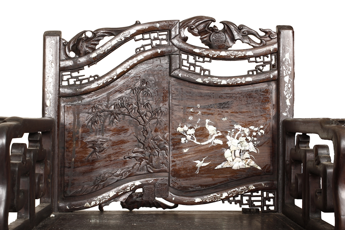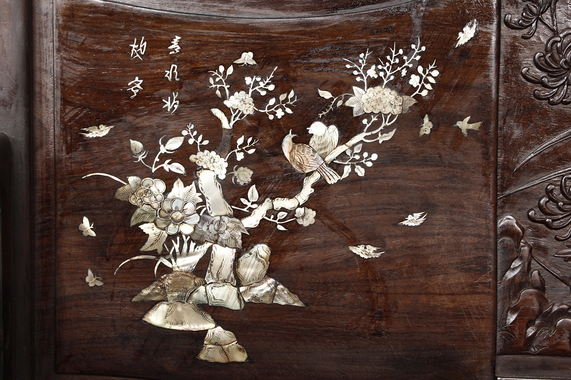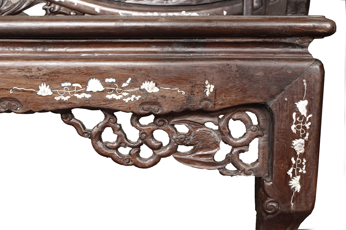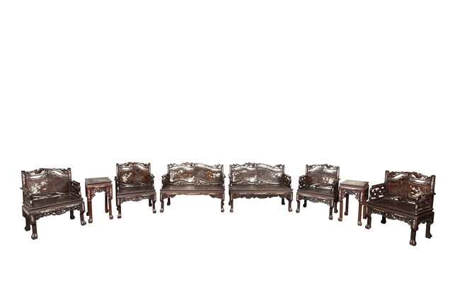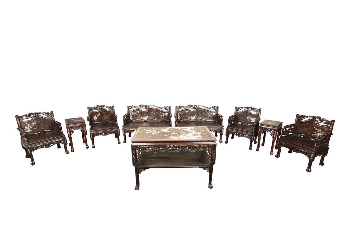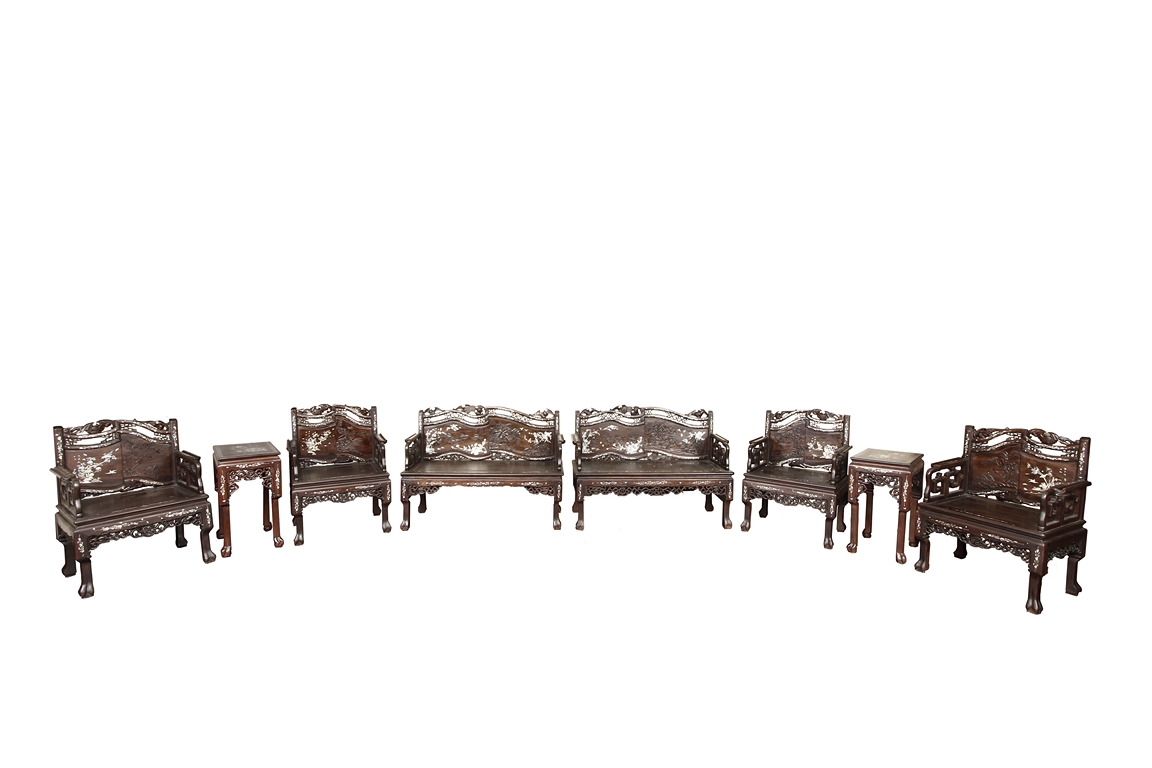 The furniture set includes four long seats, two chairs, two stands, and one table. The single piece wood table surface inset with mother-of-pearls, depicting butterflies and swallows flying near a large tree next to blossoming flowers, within a rectangular pattern, the apron pierce carved in ruyi cloud, bats, and coin shapes, another supporting board below, attached to four feet, with additional carved aprons at the corners, all stands on tapered in beast legs. The stand exhibits similar design and motif as the table, but without the supporting wooden board. The long seats and chairs have slightly differing design, the front with stylistically carved and embellished back rest depicting either cranes flying past lotus flowers and bamboo trees, between five pierce carved bats and floral patterns, the apron carved with bats and ruyi clouds, attached to beast legs. Includes Certificates of Antiquity issued from Kin Fat Antiques Curios & Woodenware Co., dated 1987. Qing Dynasty Period.