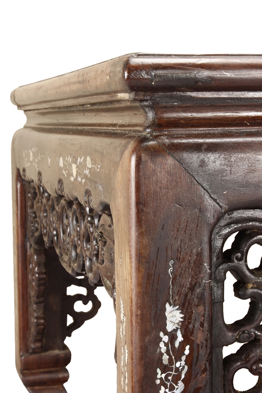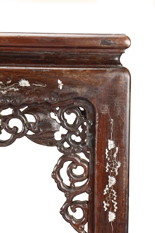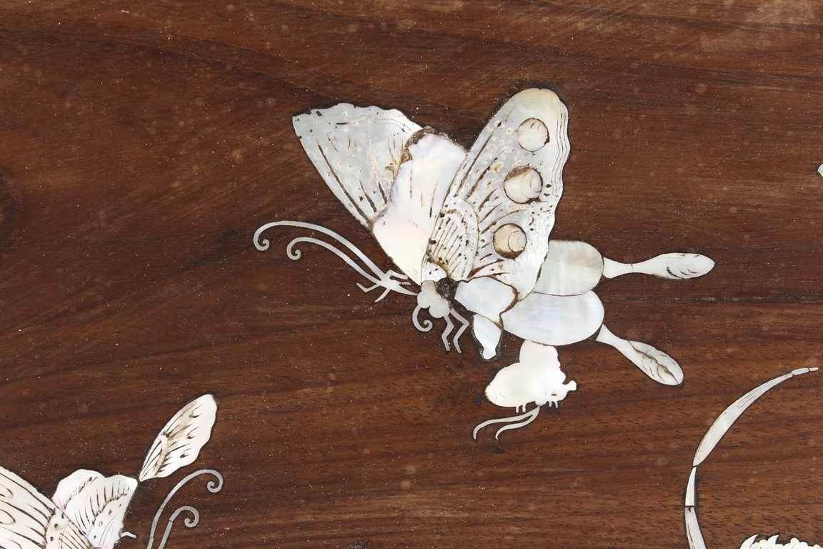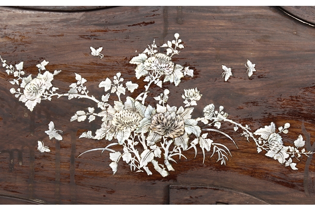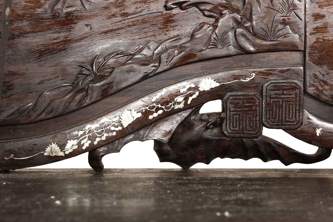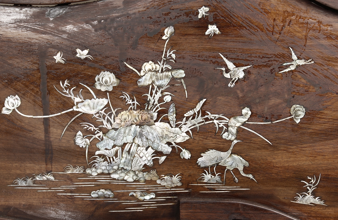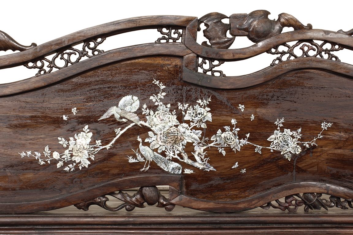 The furniture set includes four long seats, two chairs, two stands, and one table. The single piece wood table surface inset with mother-of-pearls, depicting butterflies and swallows flying near a large tree next to blossoming flowers, within a rectangular pattern, the apron pierce carved in ruyi cloud, bats, and coin shapes, another supporting board below, attached to four feet, with additional carved aprons at the corners, all stands on tapered in beast legs. The stand exhibits similar design and motif as the table, but without the supporting wooden board. The long seats and chairs have slightly differing design, the front with stylistically carved and embellished back rest depicting either cranes flying past lotus flowers and bamboo trees, between five pierce carved bats and floral patterns, the apron carved with bats and ruyi clouds, attached to beast legs. Includes Certificates of Antiquity issued from Kin Fat Antiques Curios & Woodenware Co., dated 1987. Qing Dynasty Period.
