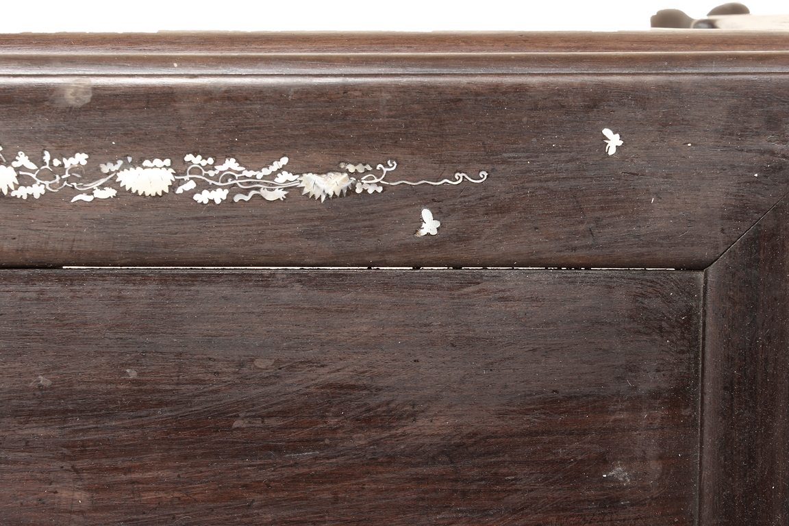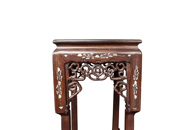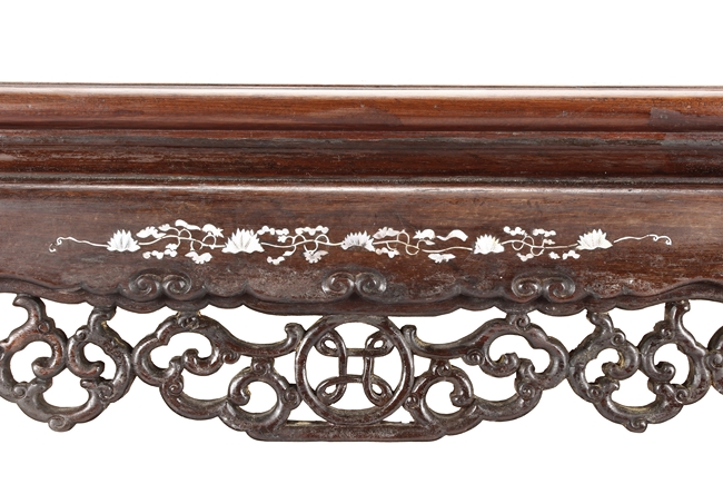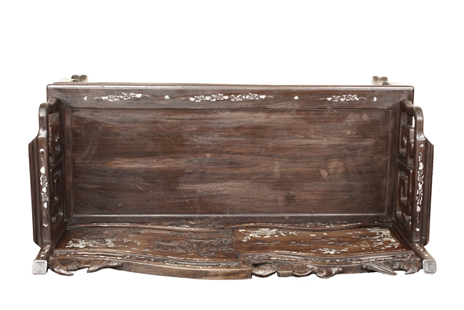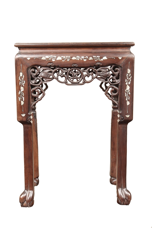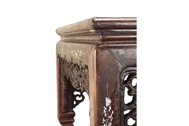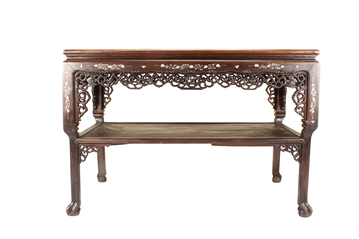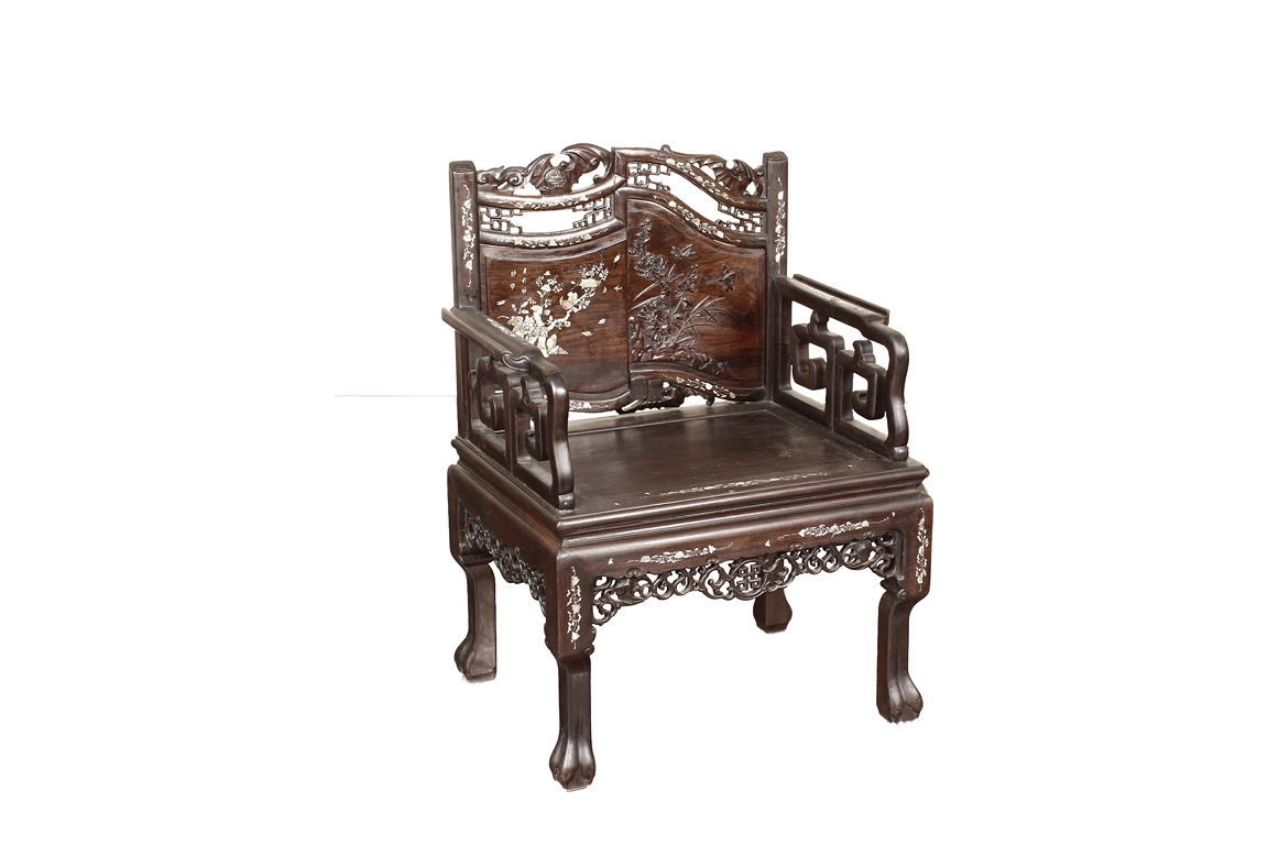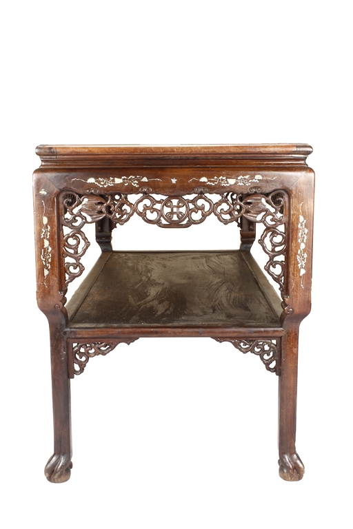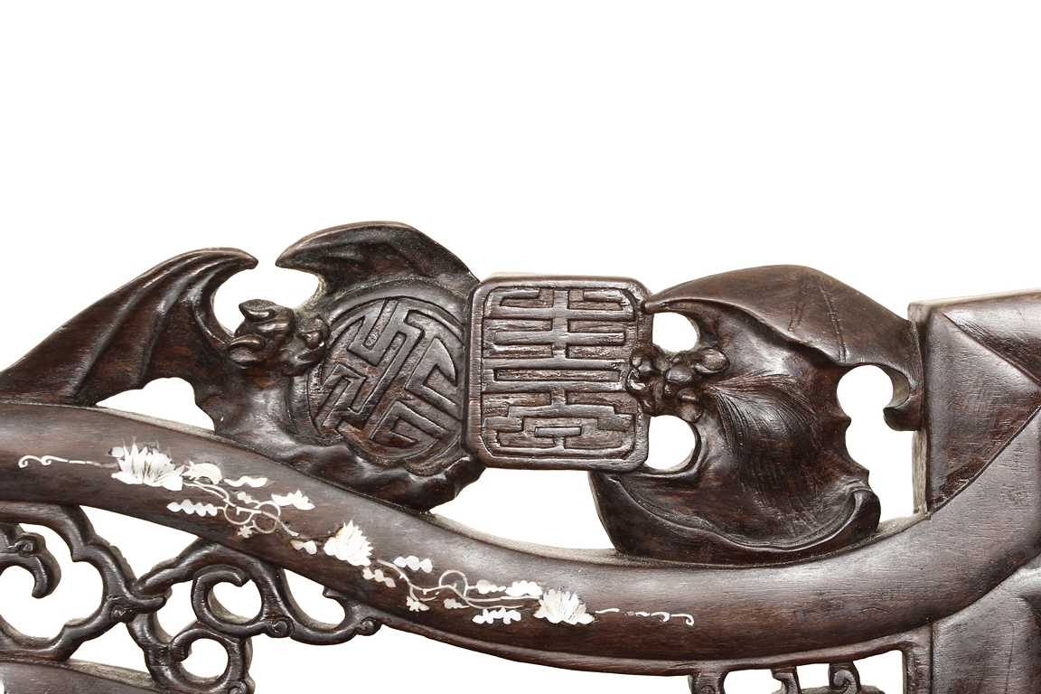 The furniture set includes four long seats, two chairs, two stands, and one table. The single piece wood table surface inset with mother-of-pearls, depicting butterflies and swallows flying near a large tree next to blossoming flowers, within a rectangular pattern, the apron pierce carved in ruyi cloud, bats, and coin shapes, another supporting board below, attached to four feet, with additional carved aprons at the corners, all stands on tapered in beast legs. The stand exhibits similar design and motif as the table, but without the supporting wooden board. The long seats and chairs have slightly differing design, the front with stylistically carved and embellished back rest depicting either cranes flying past lotus flowers and bamboo trees, between five pierce carved bats and floral patterns, the apron carved with bats and ruyi clouds, attached to beast legs. Includes Certificates of Antiquity issued from Kin Fat Antiques Curios & Woodenware Co., dated 1987. Qing Dynasty Period.