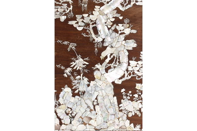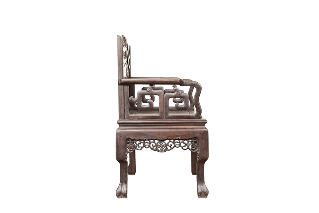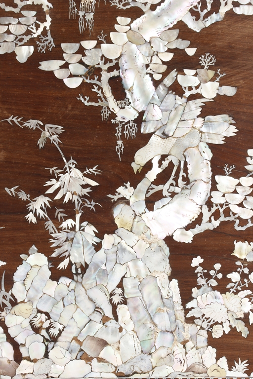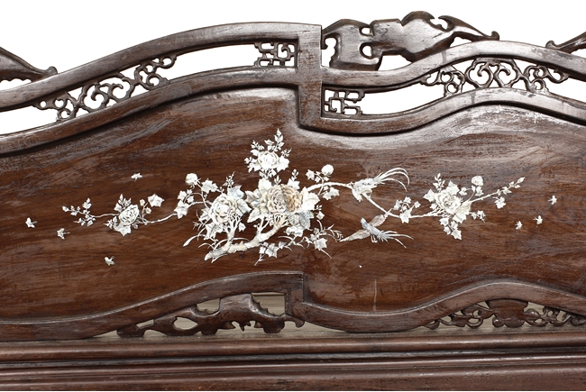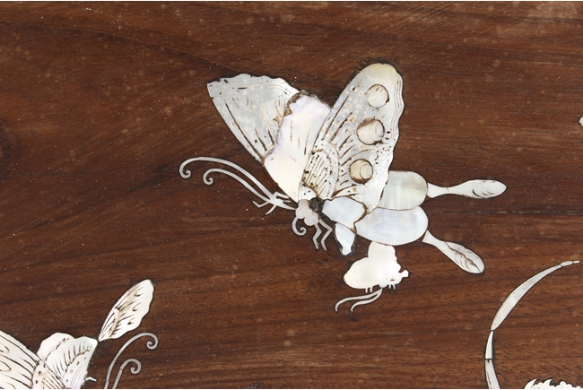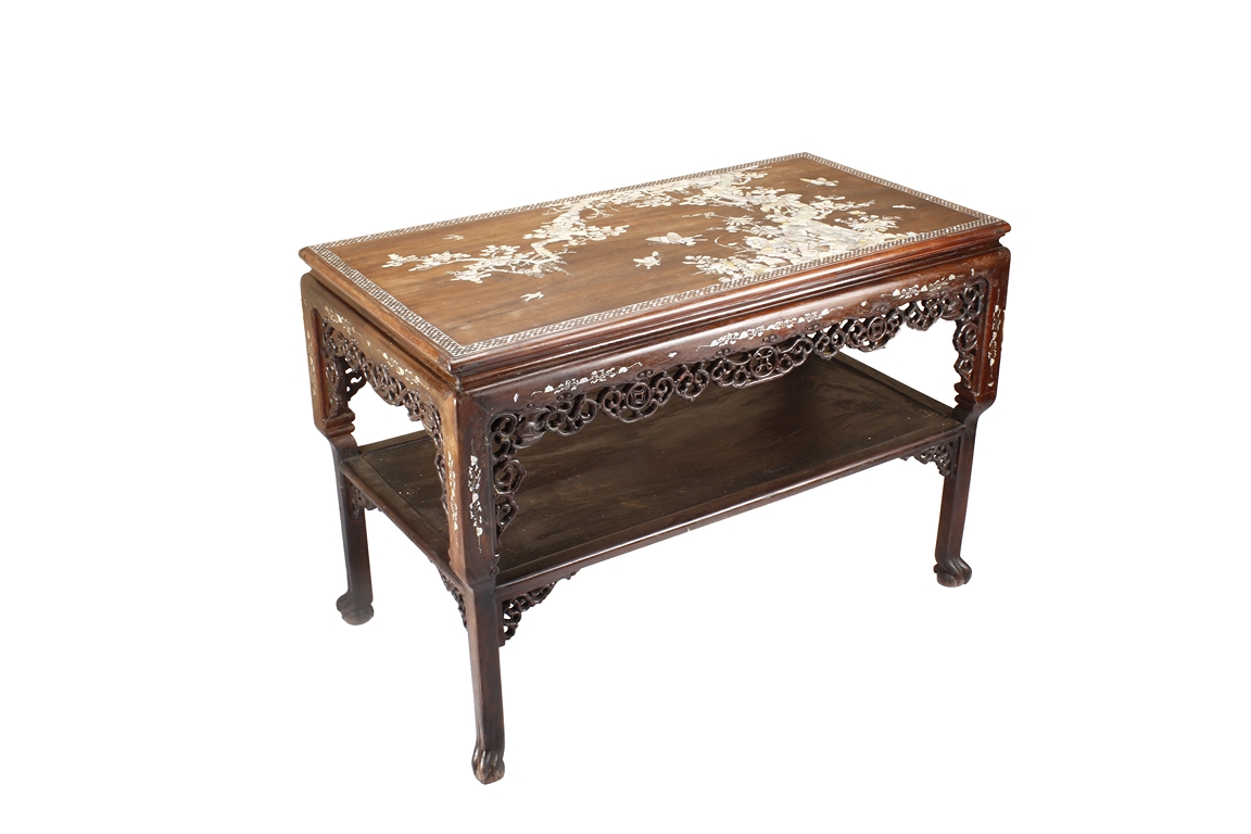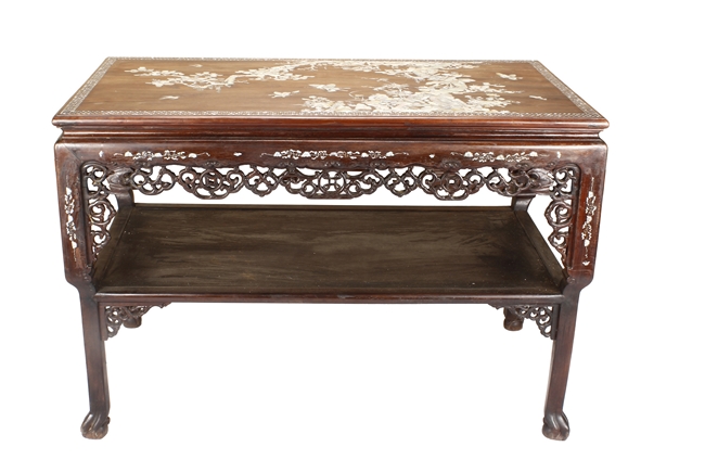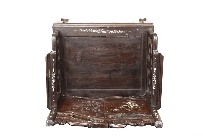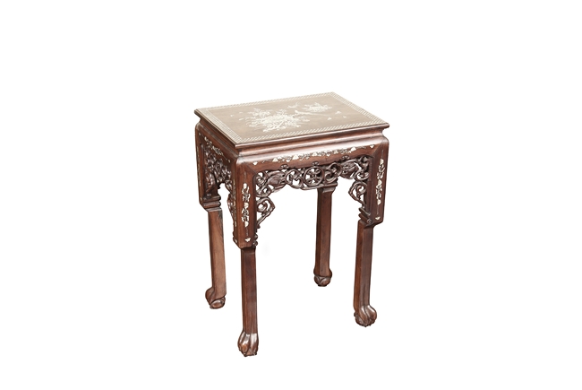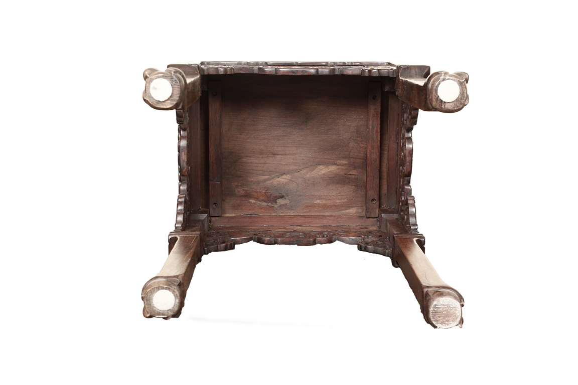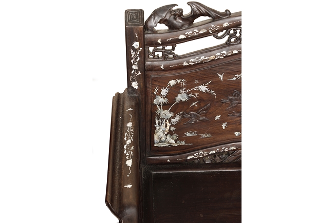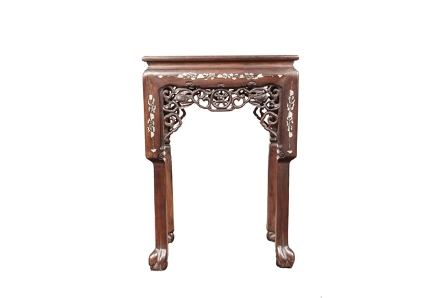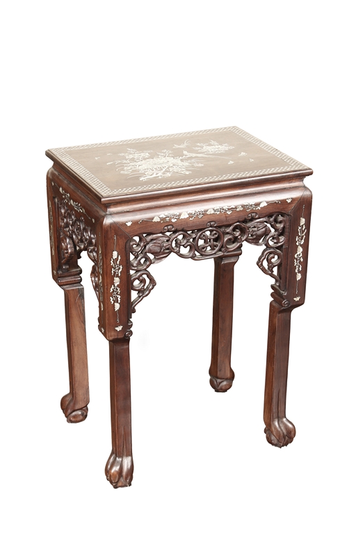 The furniture set includes four long seats, two chairs, two stands, and one table. The single piece wood table surface inset with mother-of-pearls, depicting butterflies and swallows flying near a large tree next to blossoming flowers, within a rectangular pattern, the apron pierce carved in ruyi cloud, bats, and coin shapes, another supporting board below, attached to four feet, with additional carved aprons at the corners, all stands on tapered in beast legs. The stand exhibits similar design and motif as the table, but without the supporting wooden board. The long seats and chairs have slightly differing design, the front with stylistically carved and embellished back rest depicting either cranes flying past lotus flowers and bamboo trees, between five pierce carved bats and floral patterns, the apron carved with bats and ruyi clouds, attached to beast legs. Includes Certificates of Antiquity issued from Kin Fat Antiques Curios & Woodenware Co., dated 1987. Qing Dynasty Period.