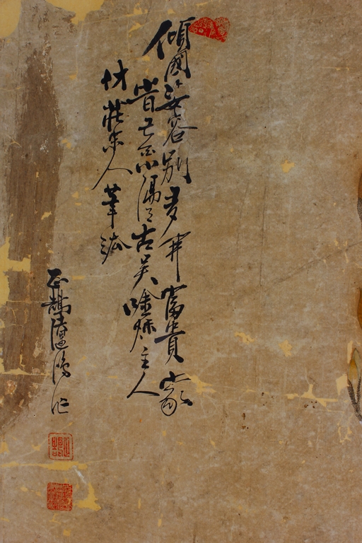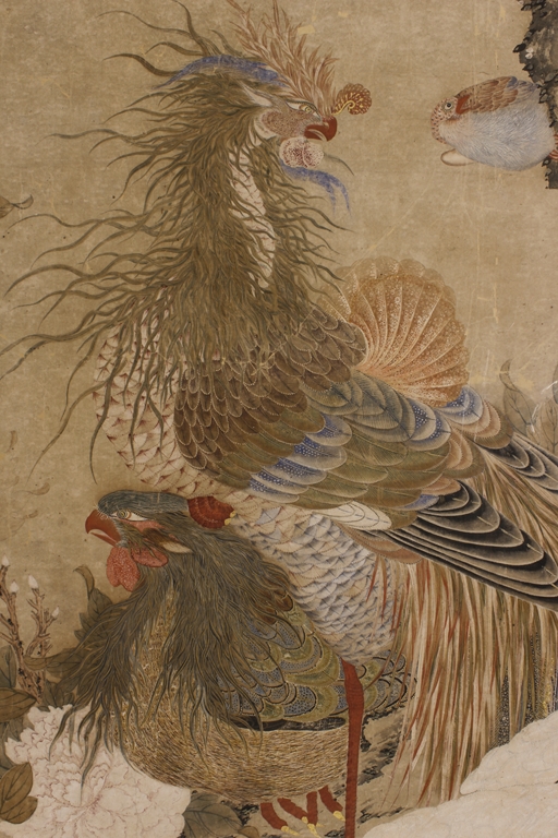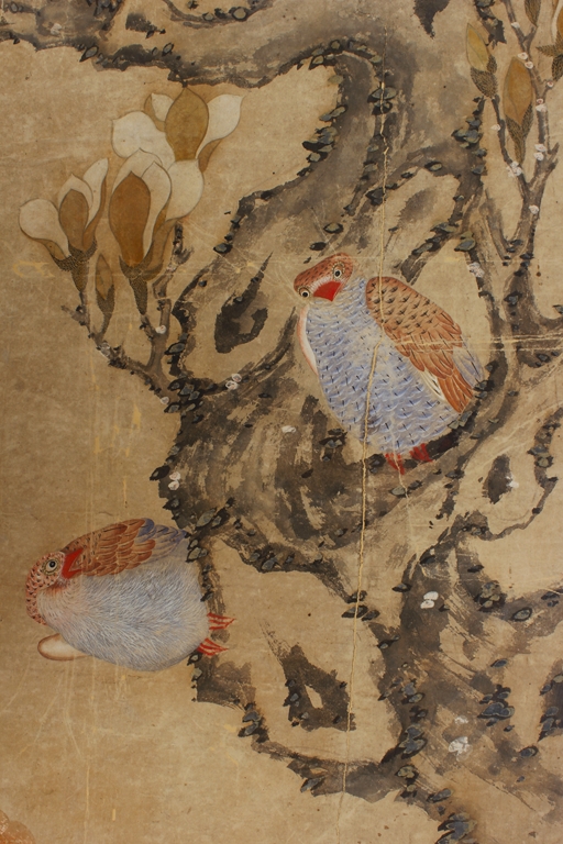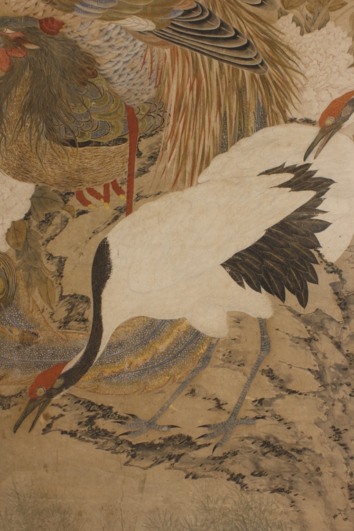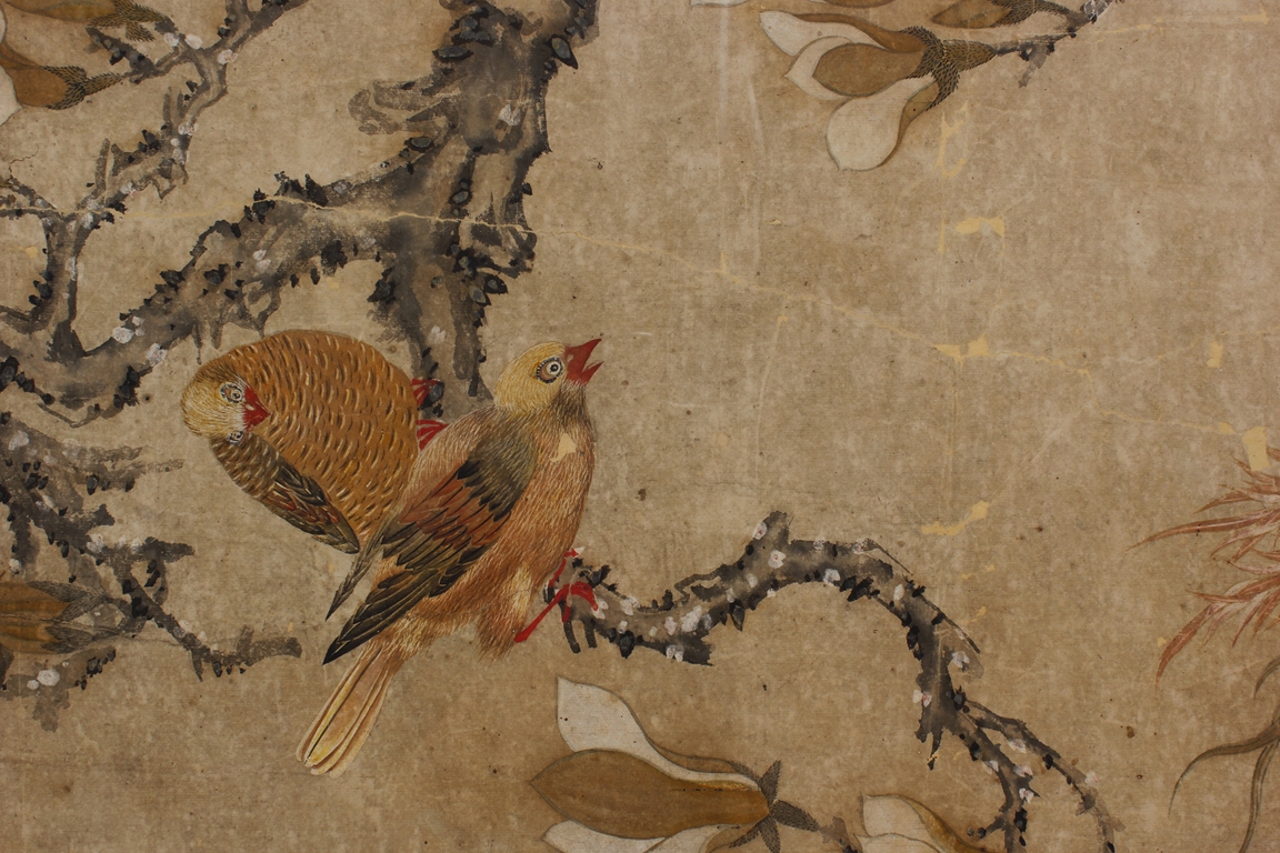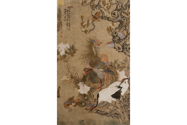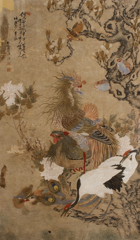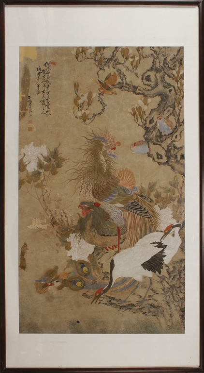 The framed painting depicts many different birds, including phoneix, cranes, mandarin ducks, magpies, and more, all on a riverside setting, with trees and flowers. Chinese poem calligraphy, artist signature and mark on the top left side.