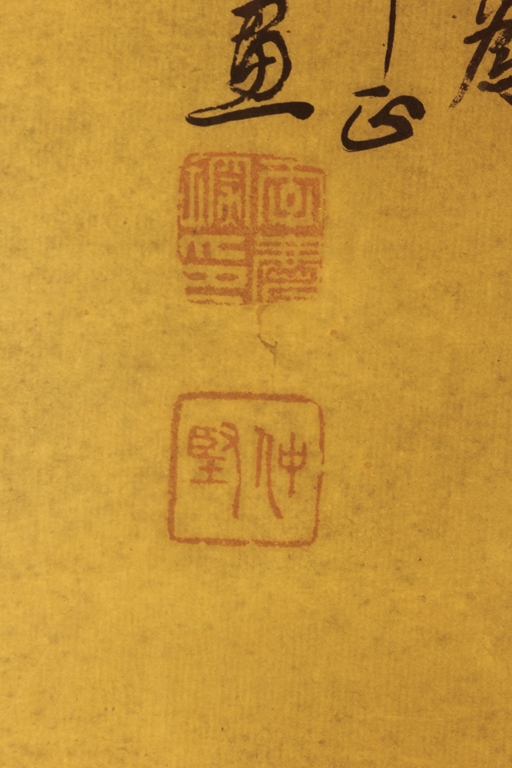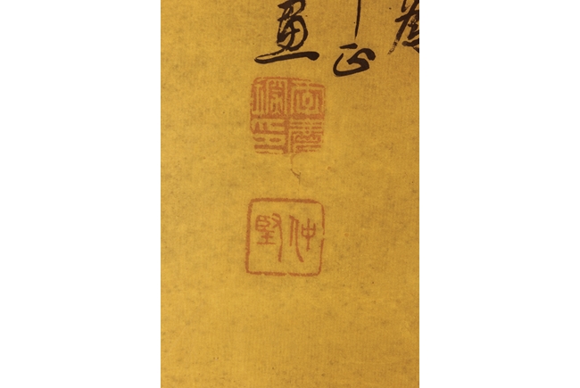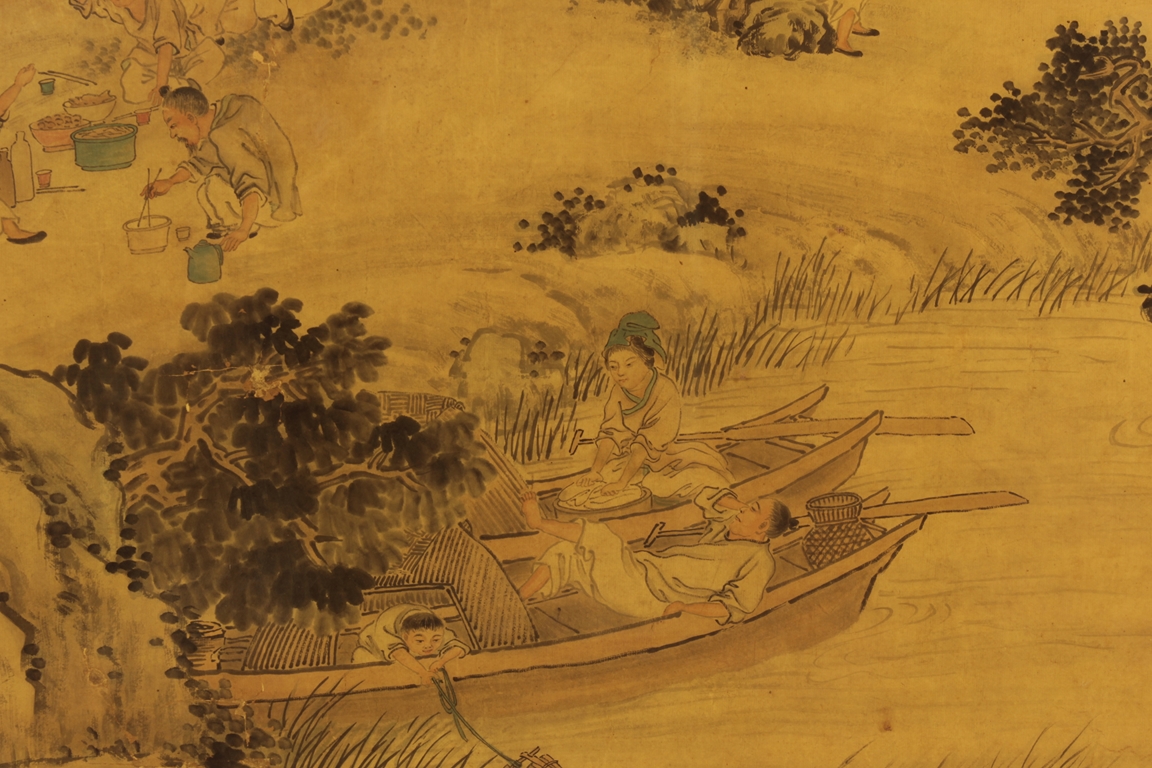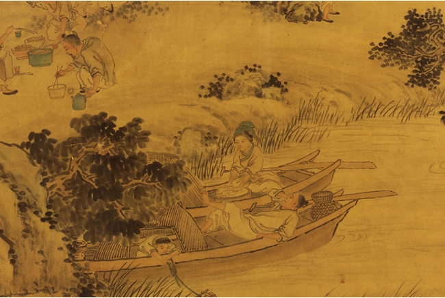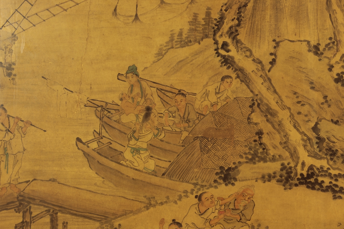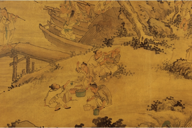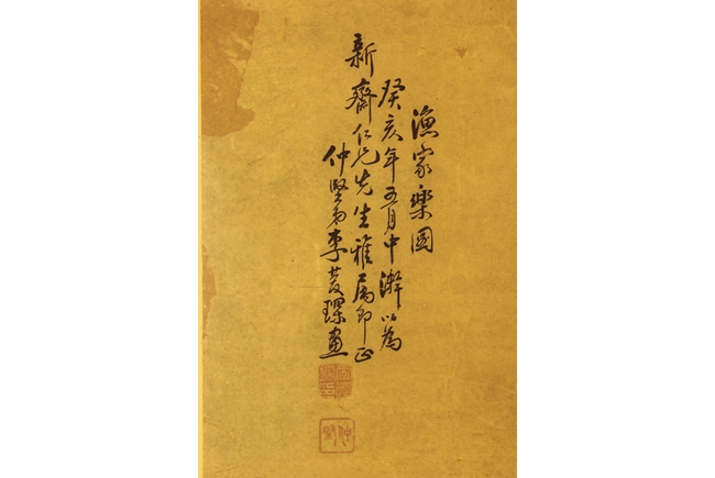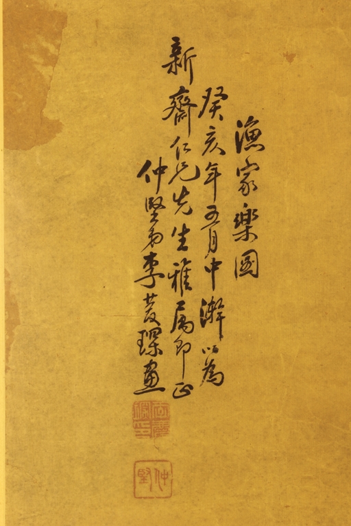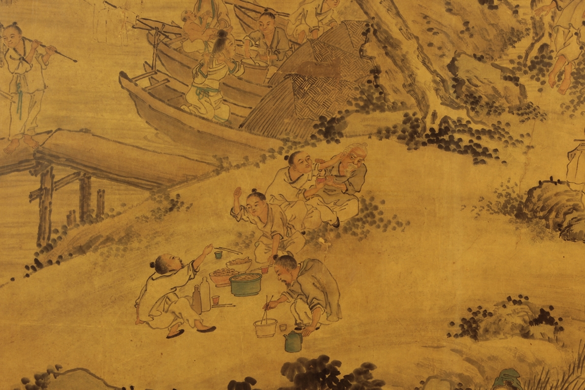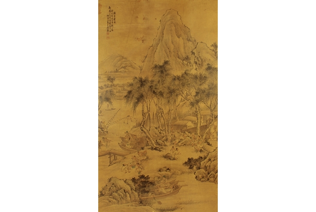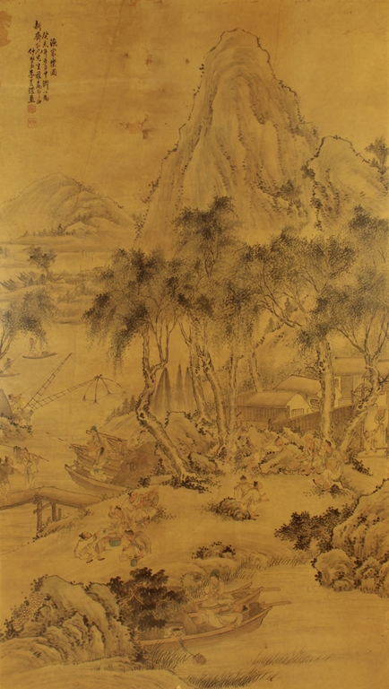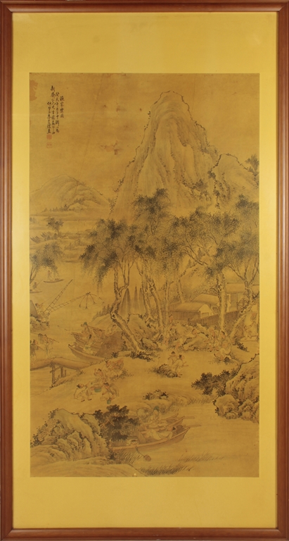The framed painting depicts a village scene, with villagers scattered around happily doing recreational activities, surrounded by river, bridge, trees, and mountains. Chinese poem calligraphy, artist signature and mark on top left.