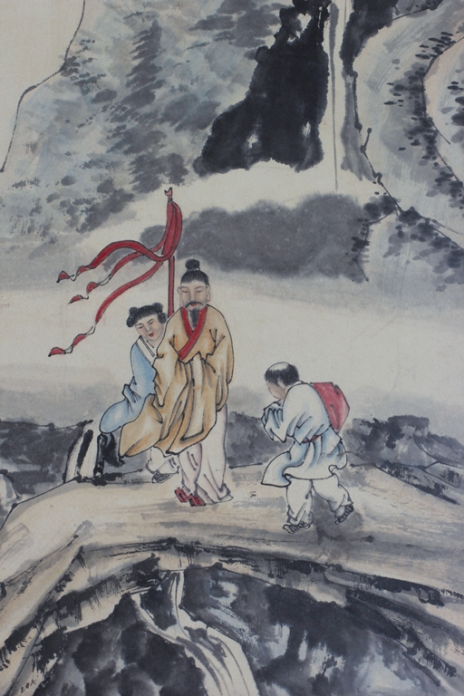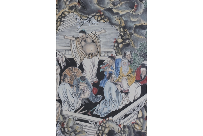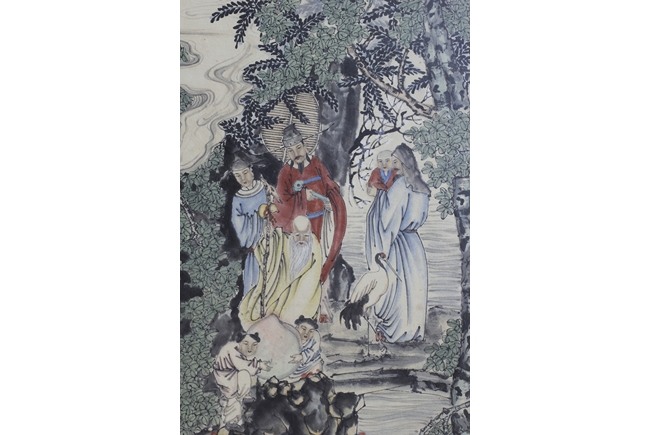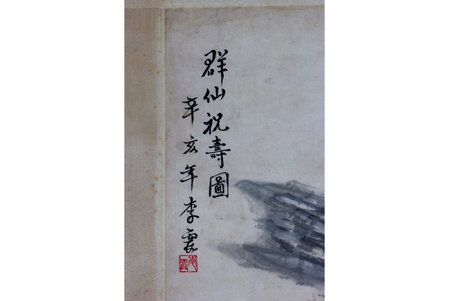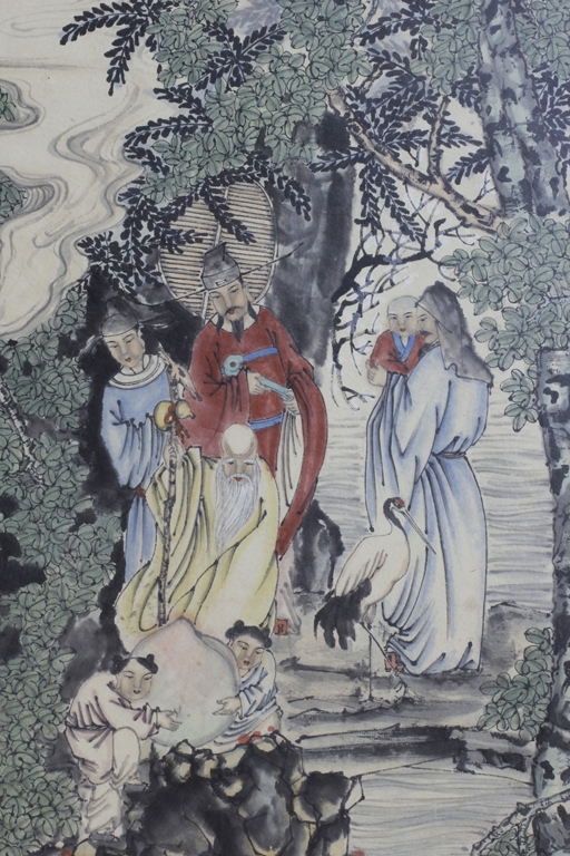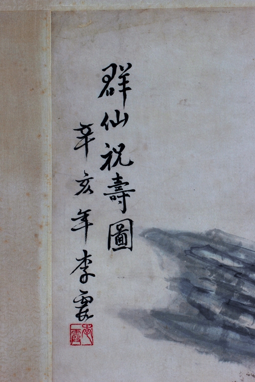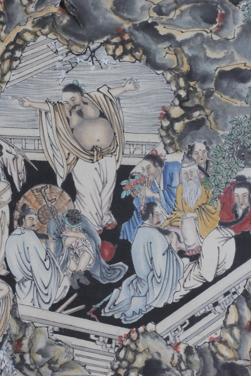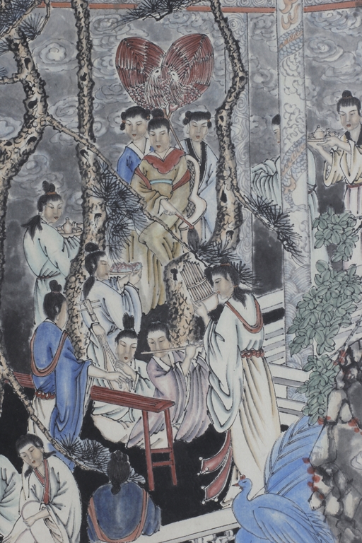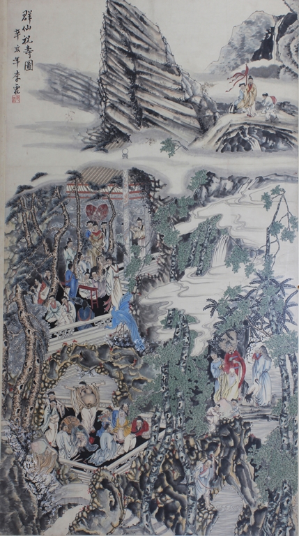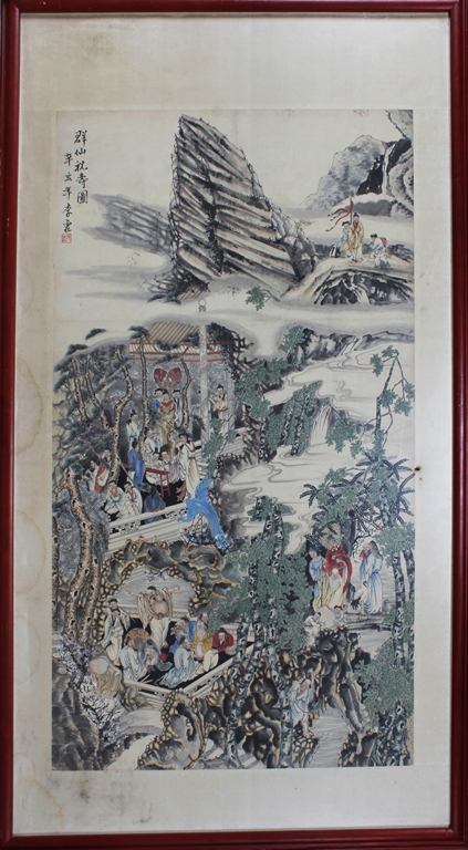 The framed painting depicts a scene of numerous Immortals gathered together in a court setting, celebrating birthday of Xi Wangmu, Queen Mother of the West. Artist signature and mark "Li Zhen" on top left.