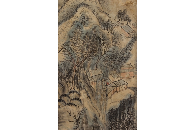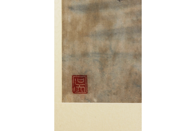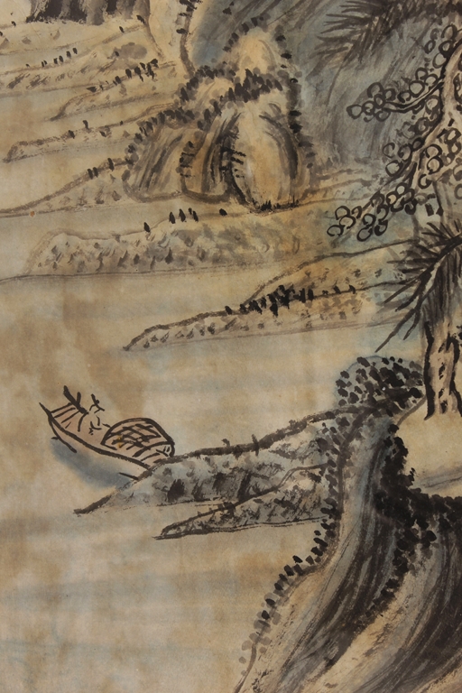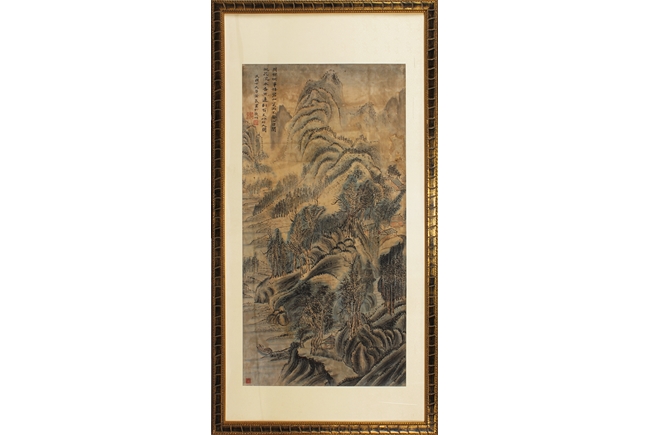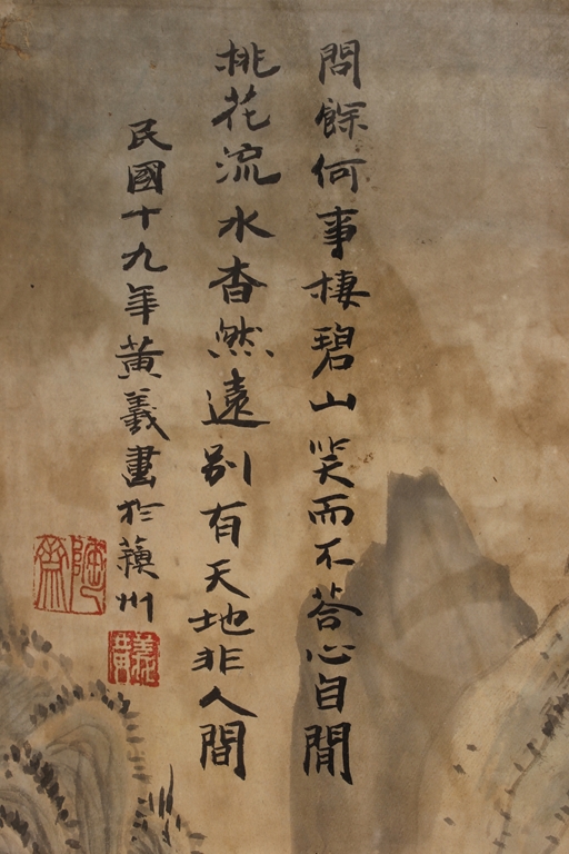 The framed painting depicts a landscape scenery of mountain range, river, and trees. Chinese poem, artist signature and mark 'Huang Yi' on top left side, additional mark on bottom left side.