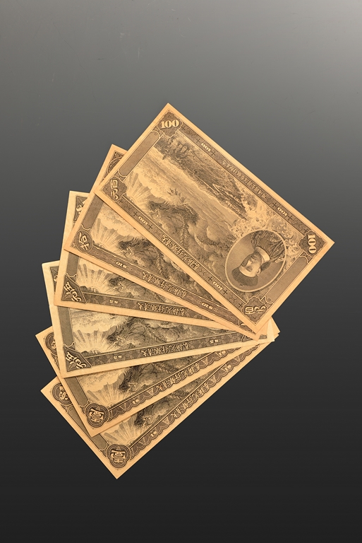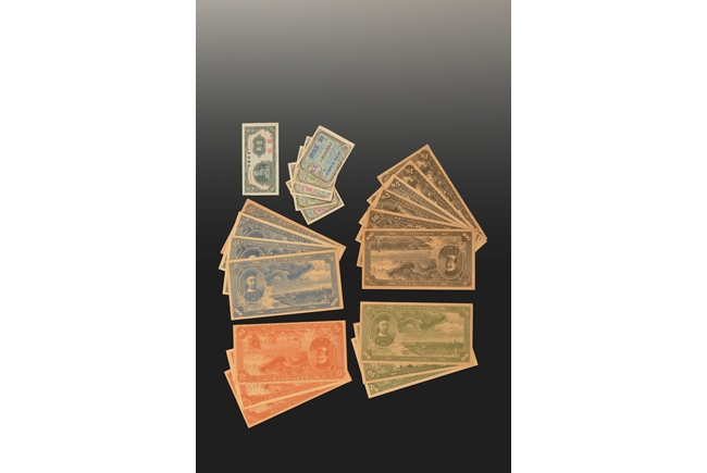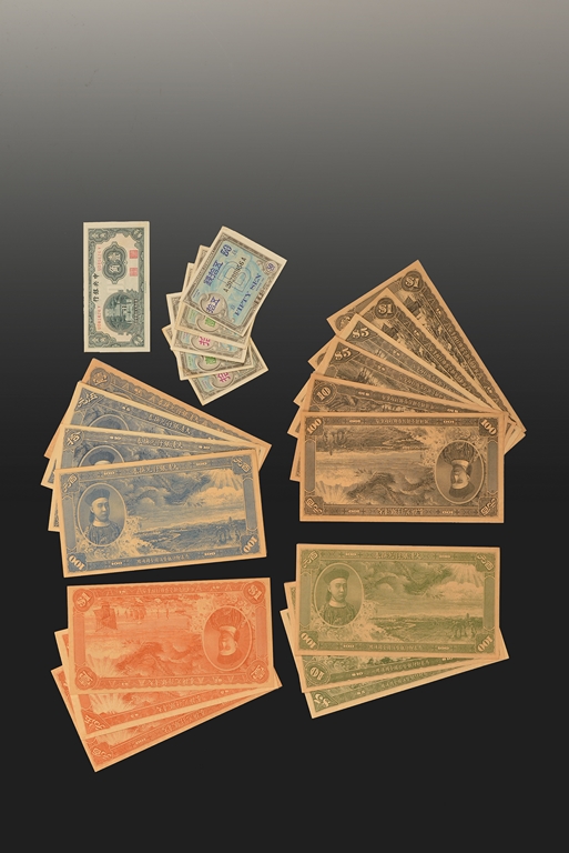 The set of bank notes were issued by Ta Ching Government Bank of China, during early 1900's. The black colored notes set includes two 1, two 5, one 10, and one 100 notes. The green colored notes set includes a 5, a 10, and a 100 notes. The red colored notes set includes a 1, a 5, and a 100 notes. The blue colored notes set includes a 1, a 5, a 10, and a 100 notes. Also included is a 10 cents note issued by The Central Bank of China, and five small notes issued by Military Proclamation. Qing Dynasty Period.