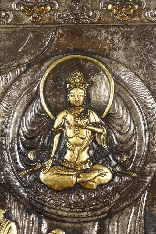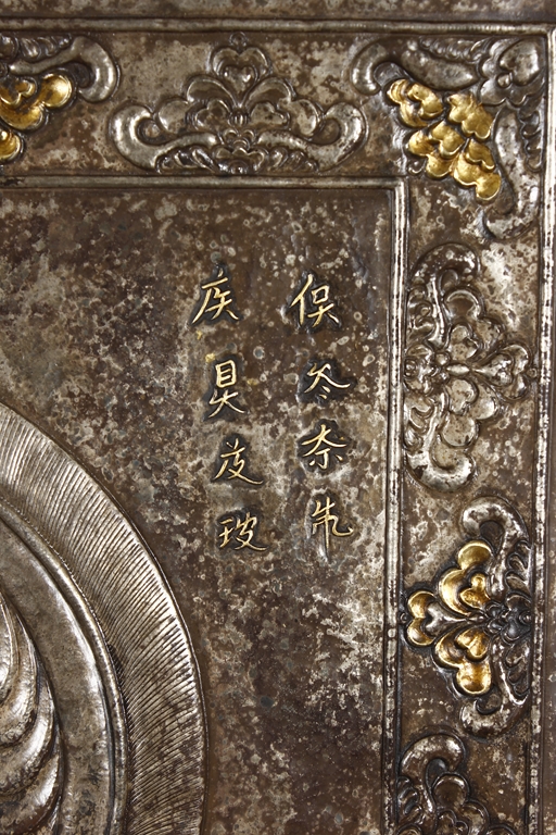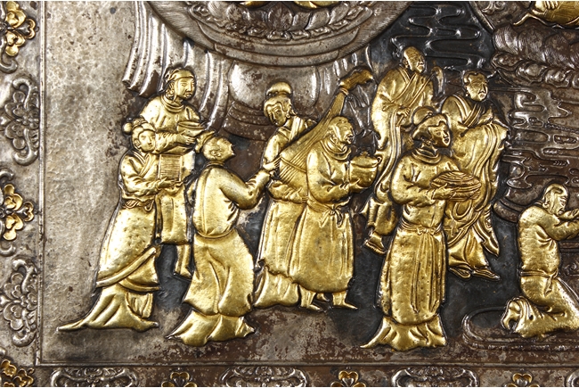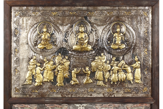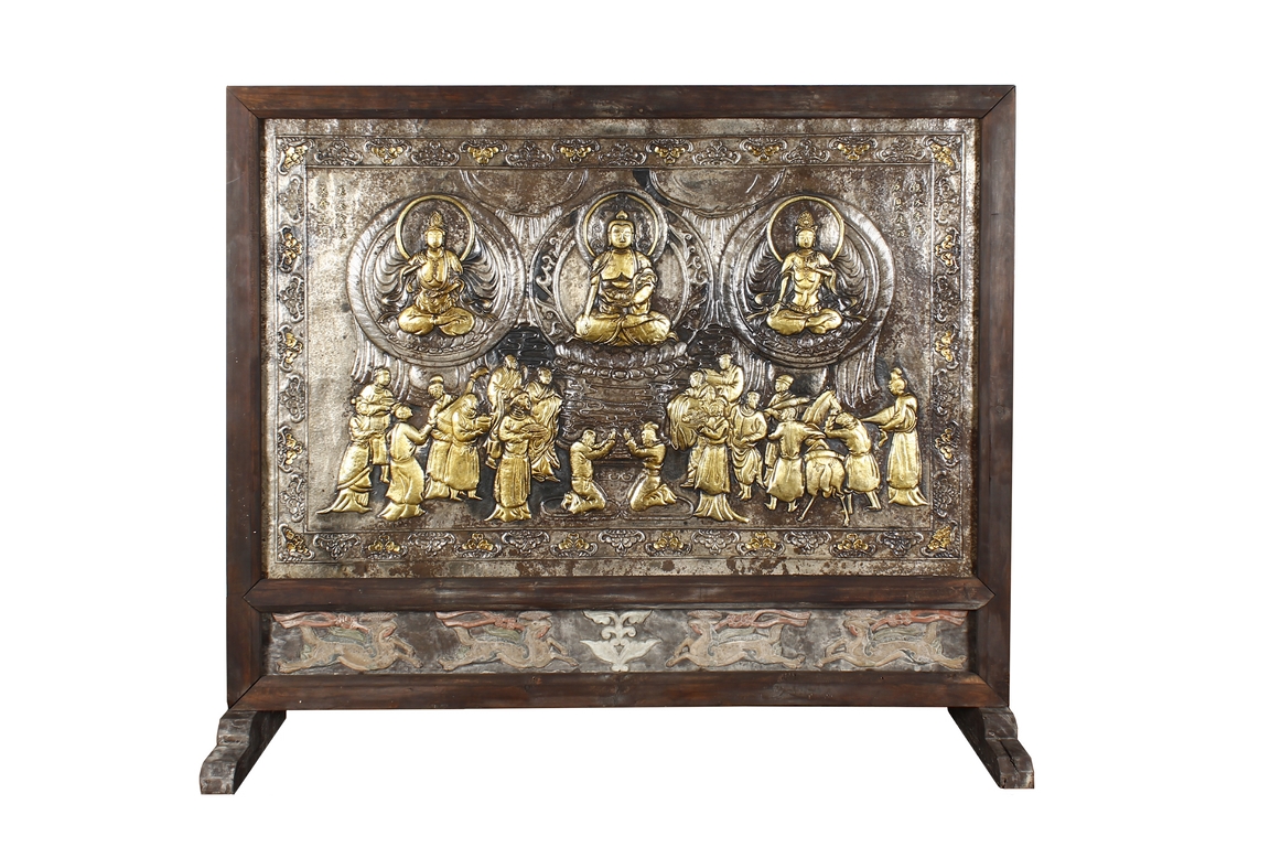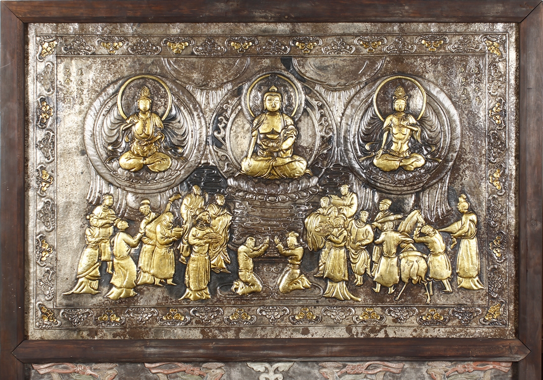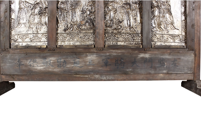 The rectangular wood frame encloses the elaborately cast gilt Bodhisattva's seated on lotus bases within silver mandorla above gilt figures of worshippers with various dresses paying tributes to the Buddhas. The plaque includes low-relief characters on both top right and left, all against the silver ground and within the borders of bat motifs. The apron is further inset with animal motifs and enclosed with wood frame. The back of the apron includes a line of Chinese characters. Qing Dynasty Period.
