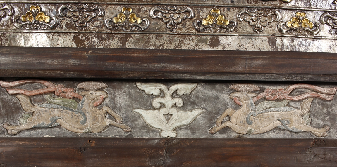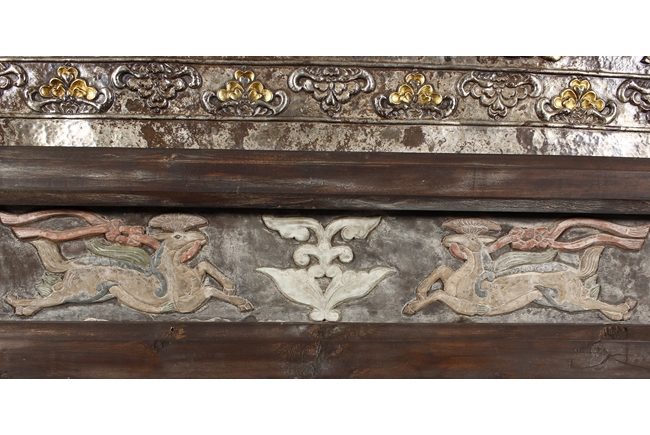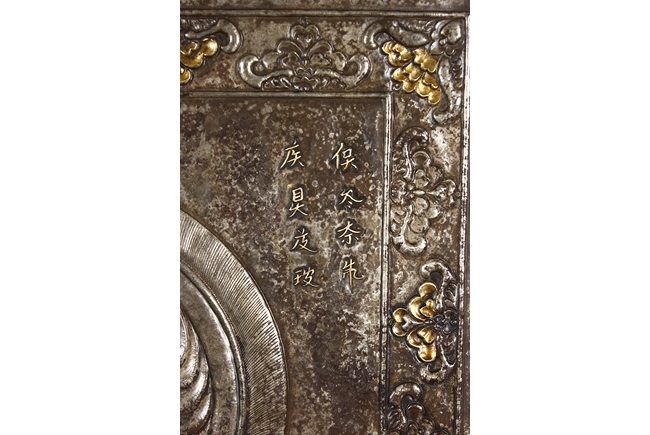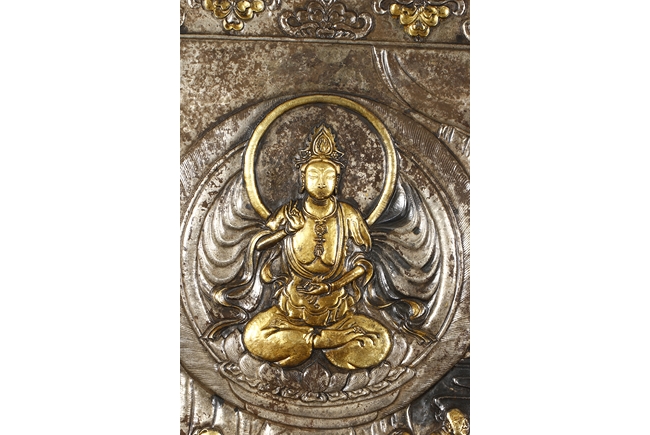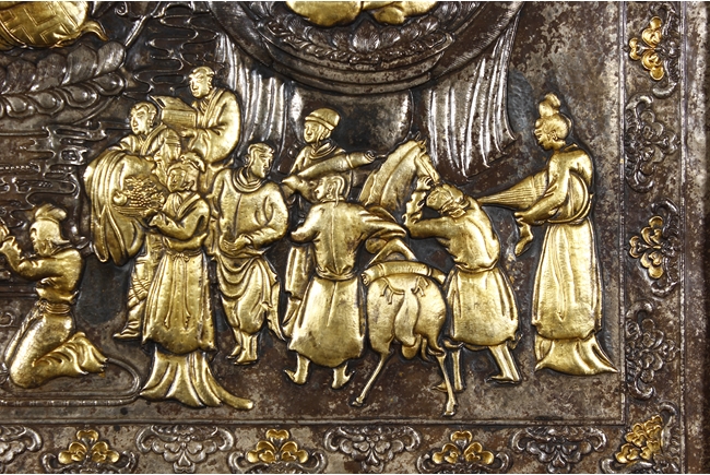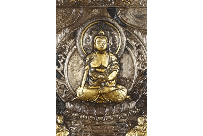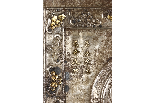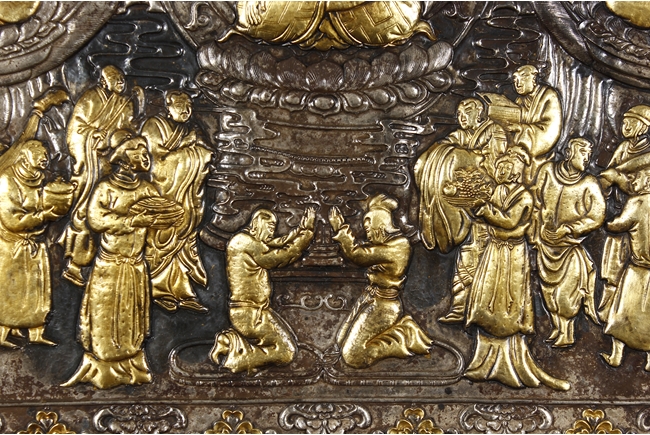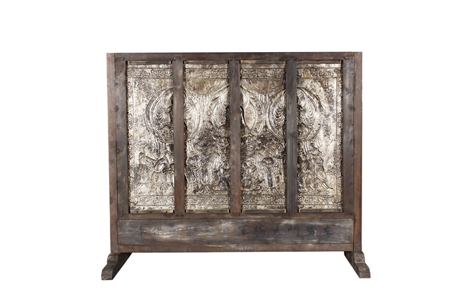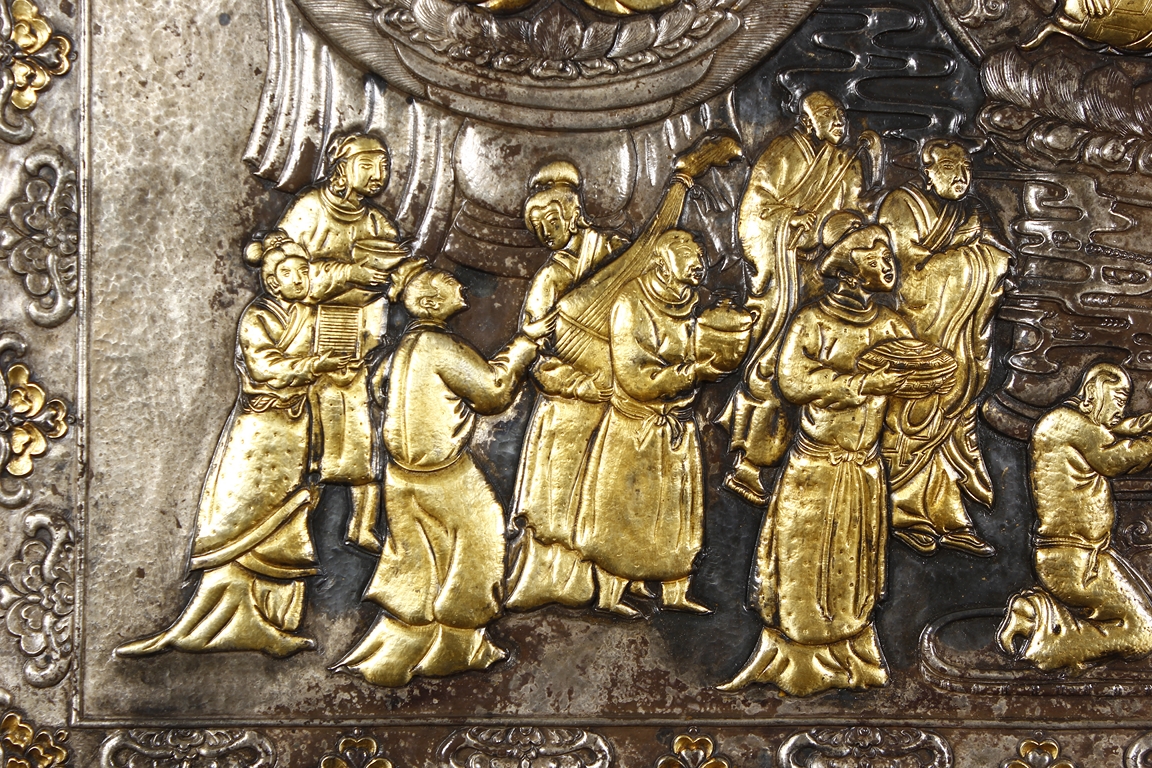 The rectangular wood frame encloses the elaborately cast gilt Bodhisattva's seated on lotus bases within silver mandorla above gilt figures of worshippers with various dresses paying tributes to the Buddhas. The plaque includes low-relief characters on both top right and left, all against the silver ground and within the borders of bat motifs. The apron is further inset with animal motifs and enclosed with wood frame. The back of the apron includes a line of Chinese characters. Qing Dynasty Period.