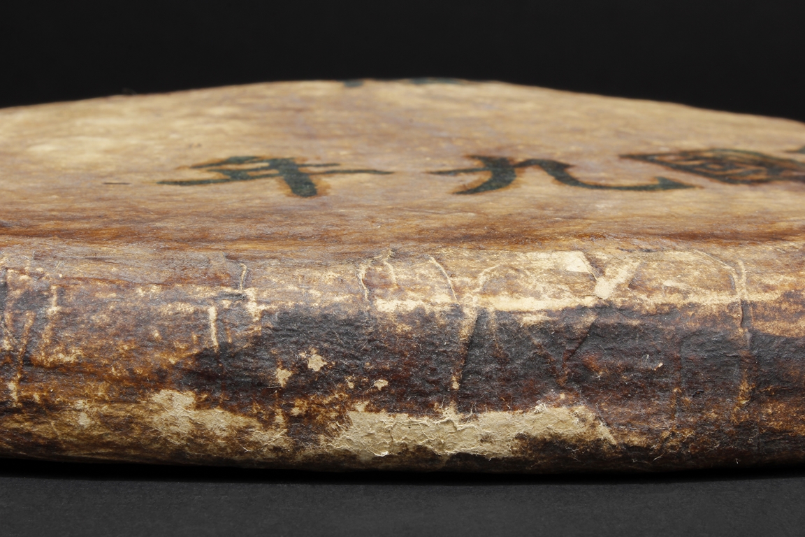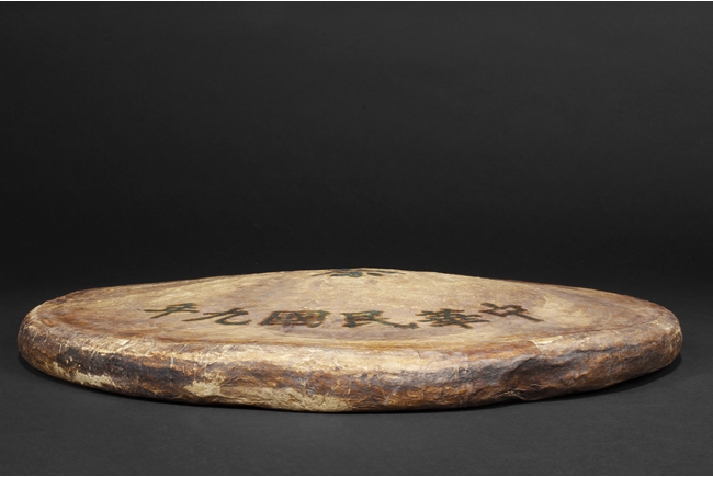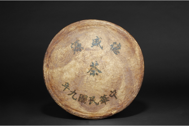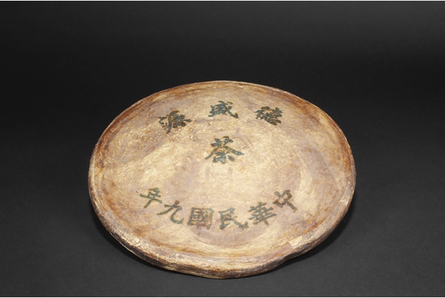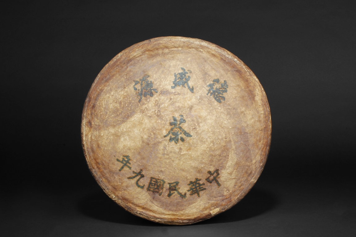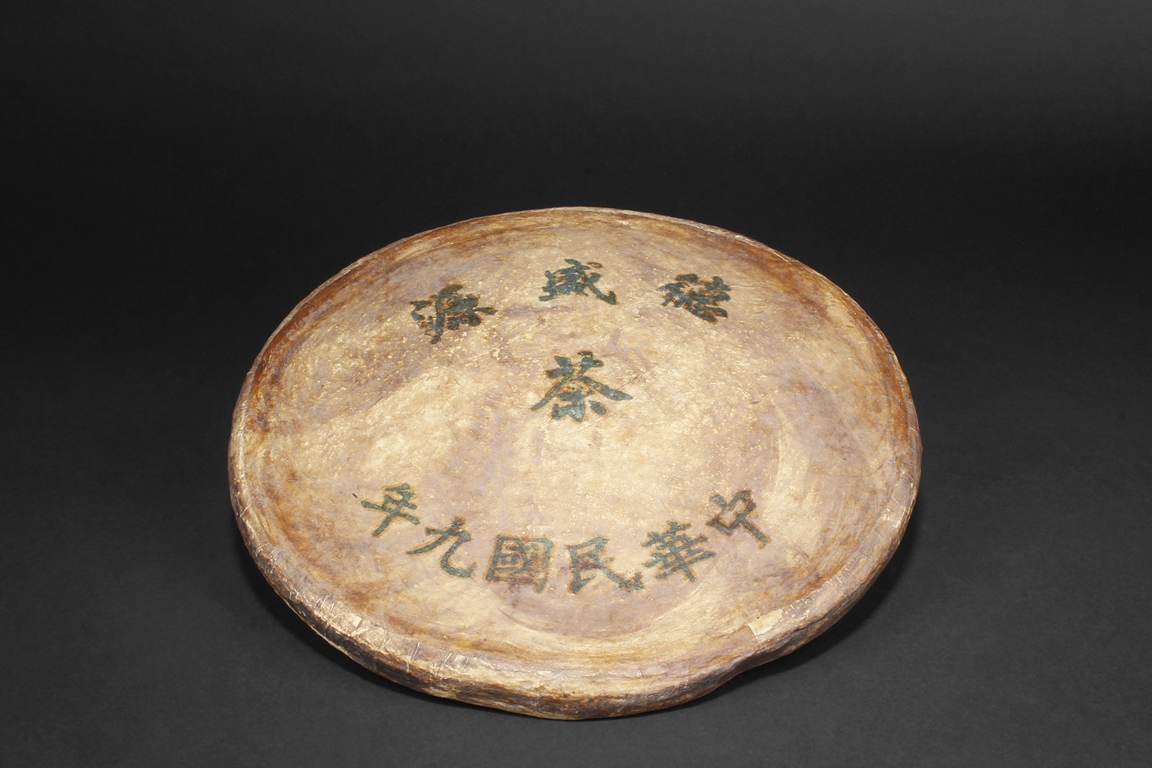 A large roundel form tea brick made by a famous tea shop "De Sheng Yuan", produced in the year of 1920, Chinese writings of the shop's name and the year of the made is on the surface of the tea brick wrap. Republic Period.