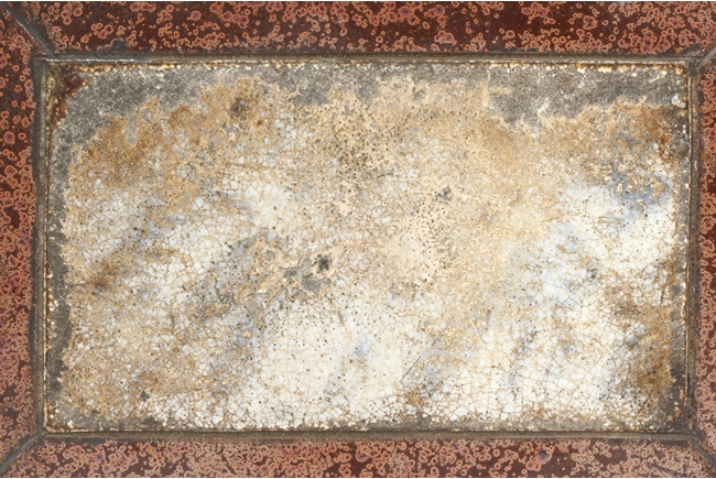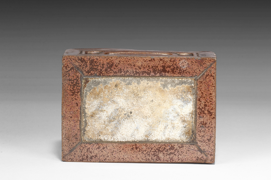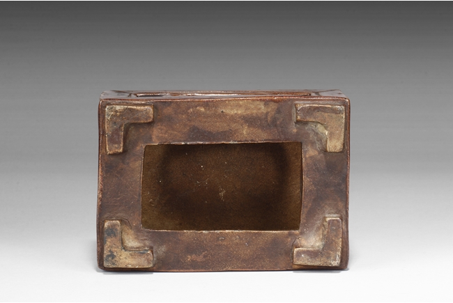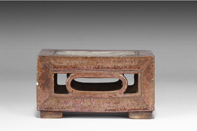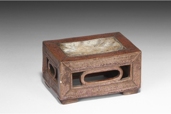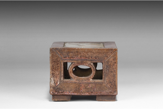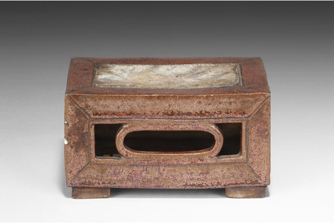 Of rectangular form, the stand supported by four L shaped short feet, the top embedded with a grayish-white stone, the sides with oval within rectangular openings, mostly in red glaze. Age related wear. Ming Dynasty period.