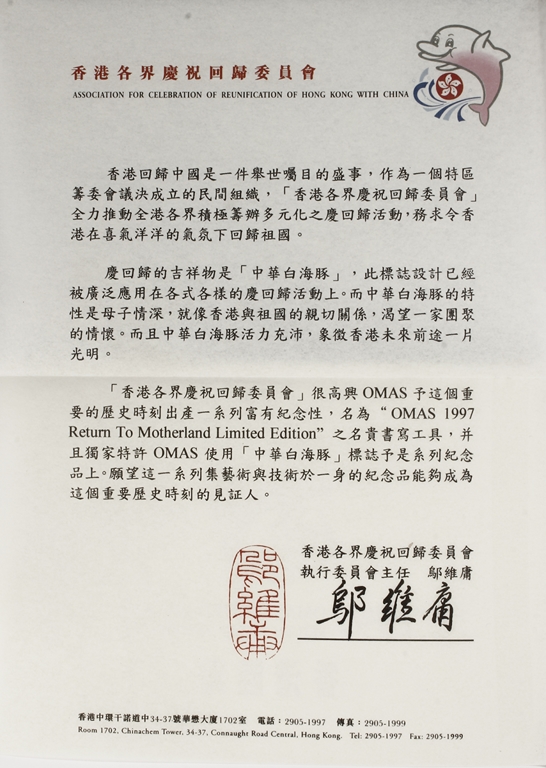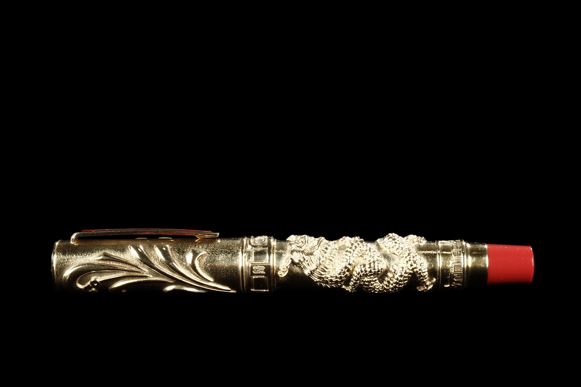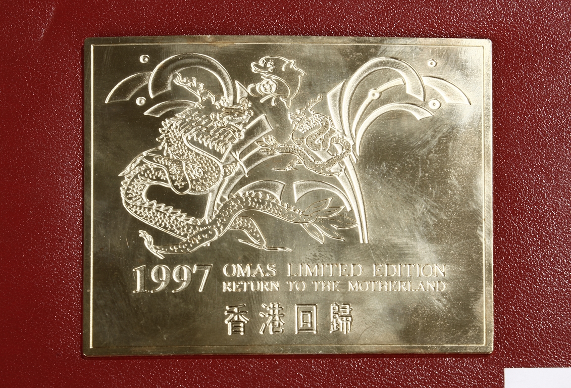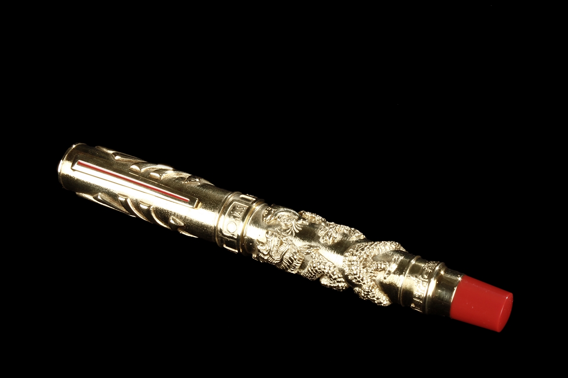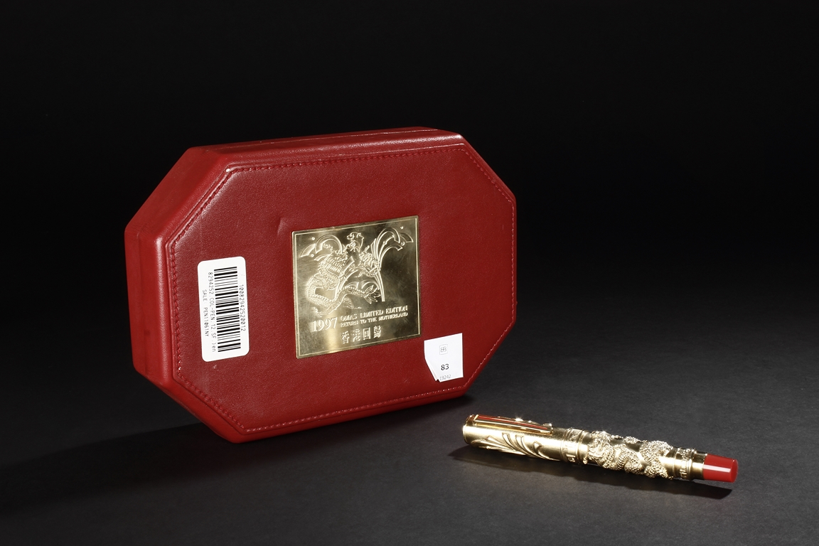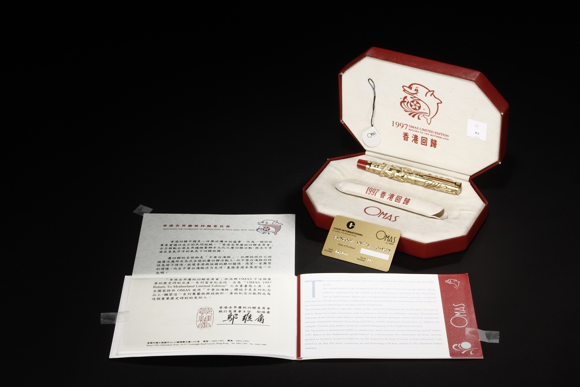 This limited edition 18K Gold and red fountain pen is finely cast with raised motif on the barrel and water spray motif on the cap, the top of cap includes the Hong Kong orchid tree symbol and the inscription 'return to the motherland'. Also Including a certificate card with serial number 88, a signed letter, and a booklet.