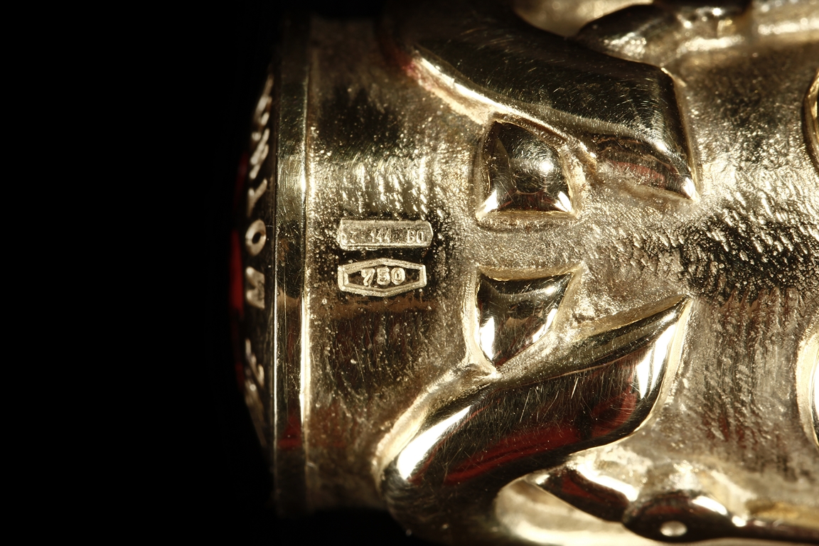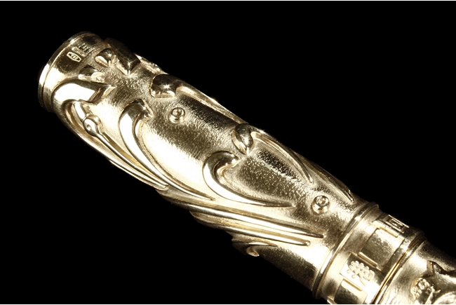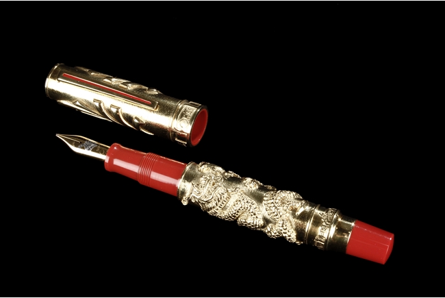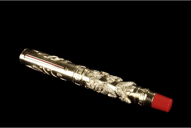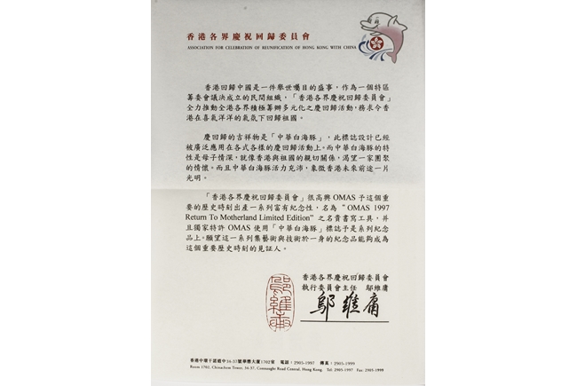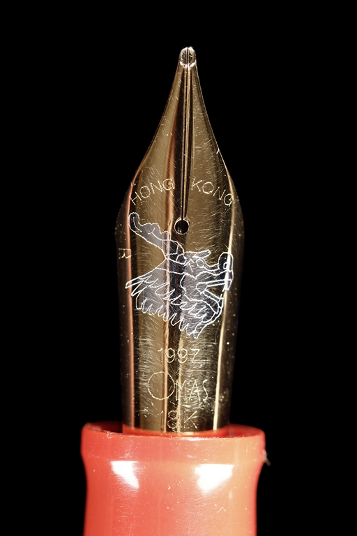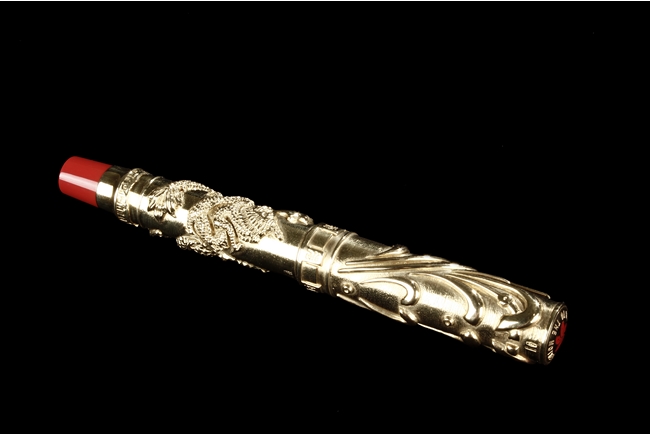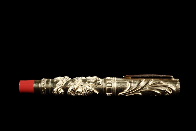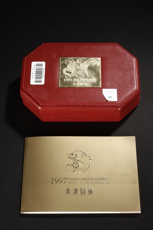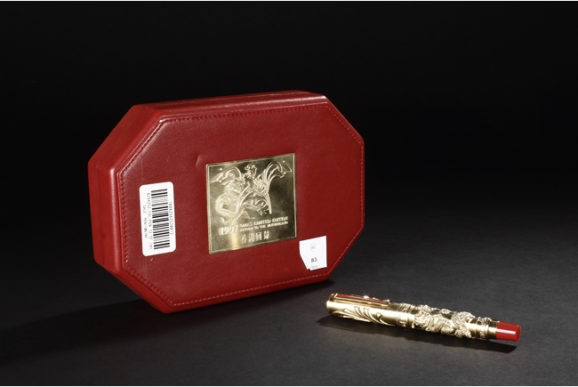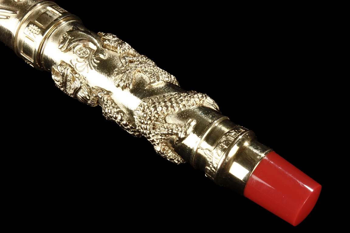 This limited edition 18K Gold and red fountain pen is finely cast with raised motif on the barrel and water spray motif on the cap, the top of cap includes the Hong Kong orchid tree symbol and the inscription 'return to the motherland'. Also Including a certificate card with serial number 88, a signed letter, and a booklet.