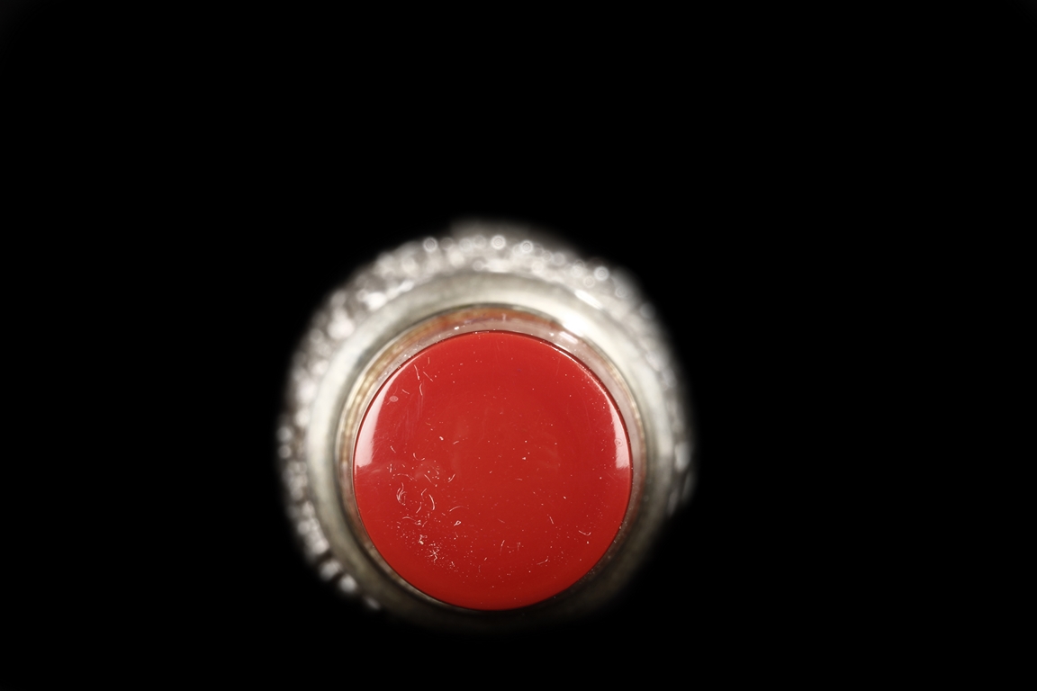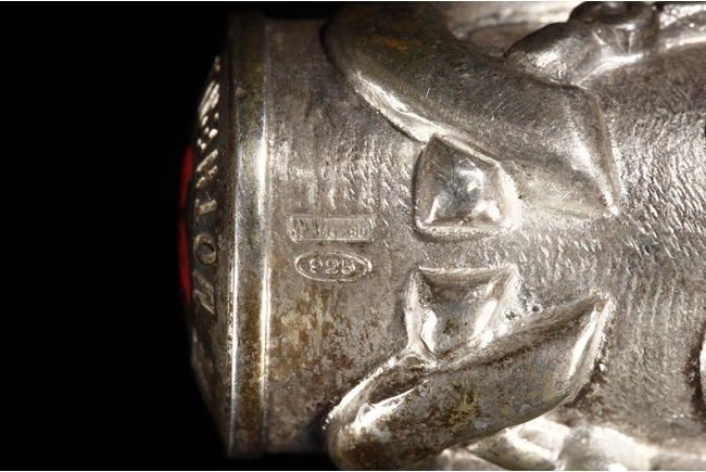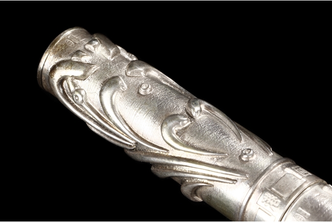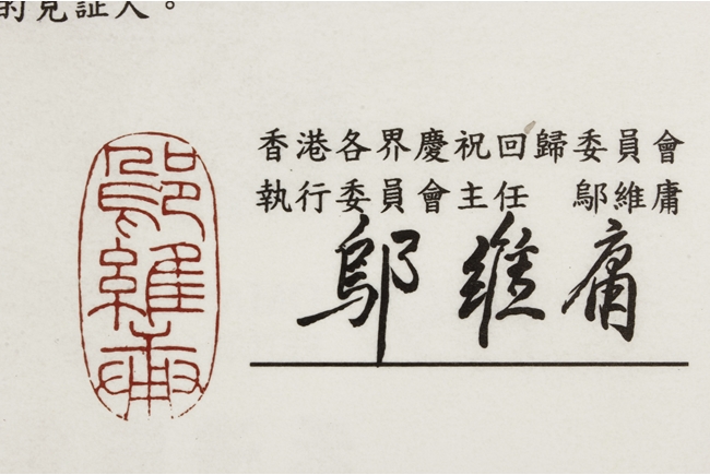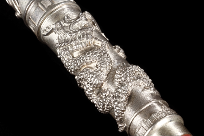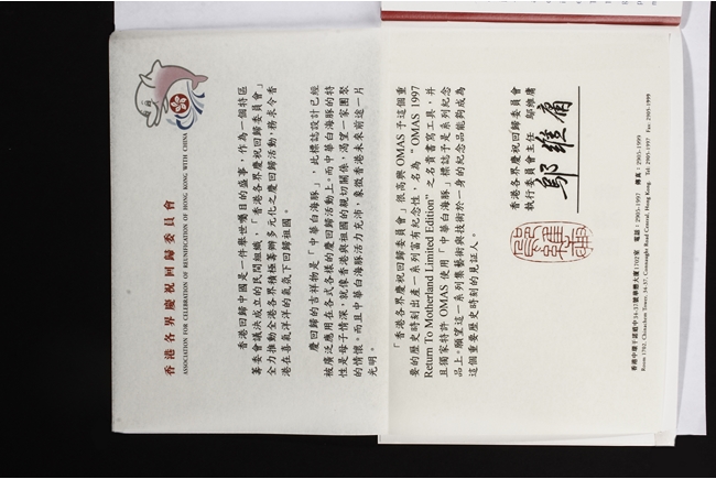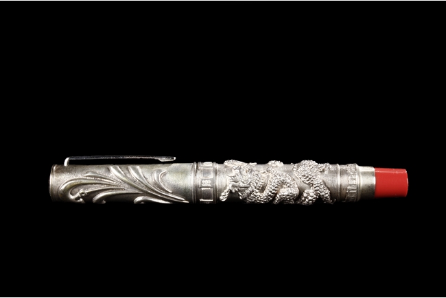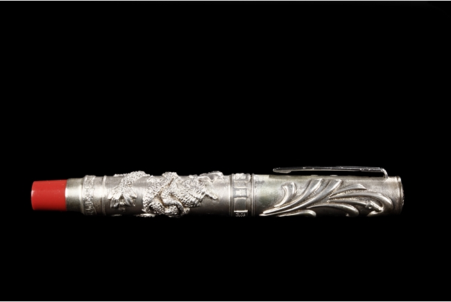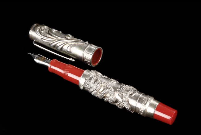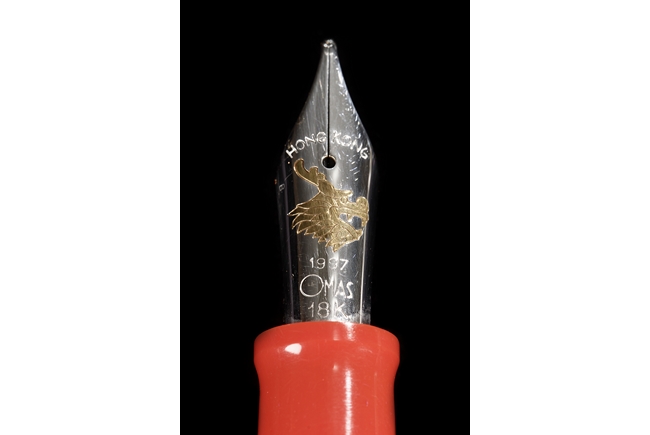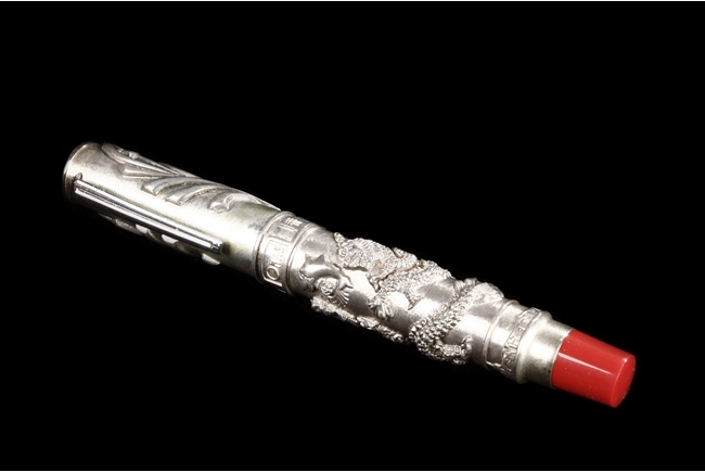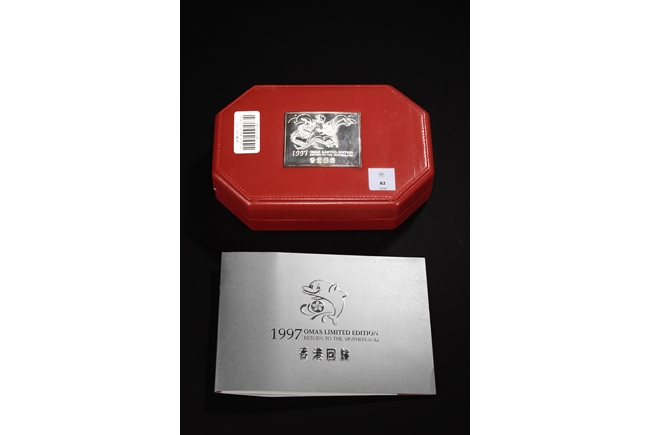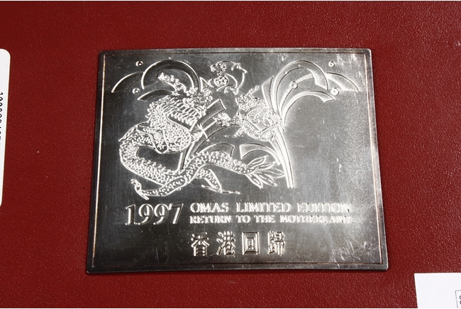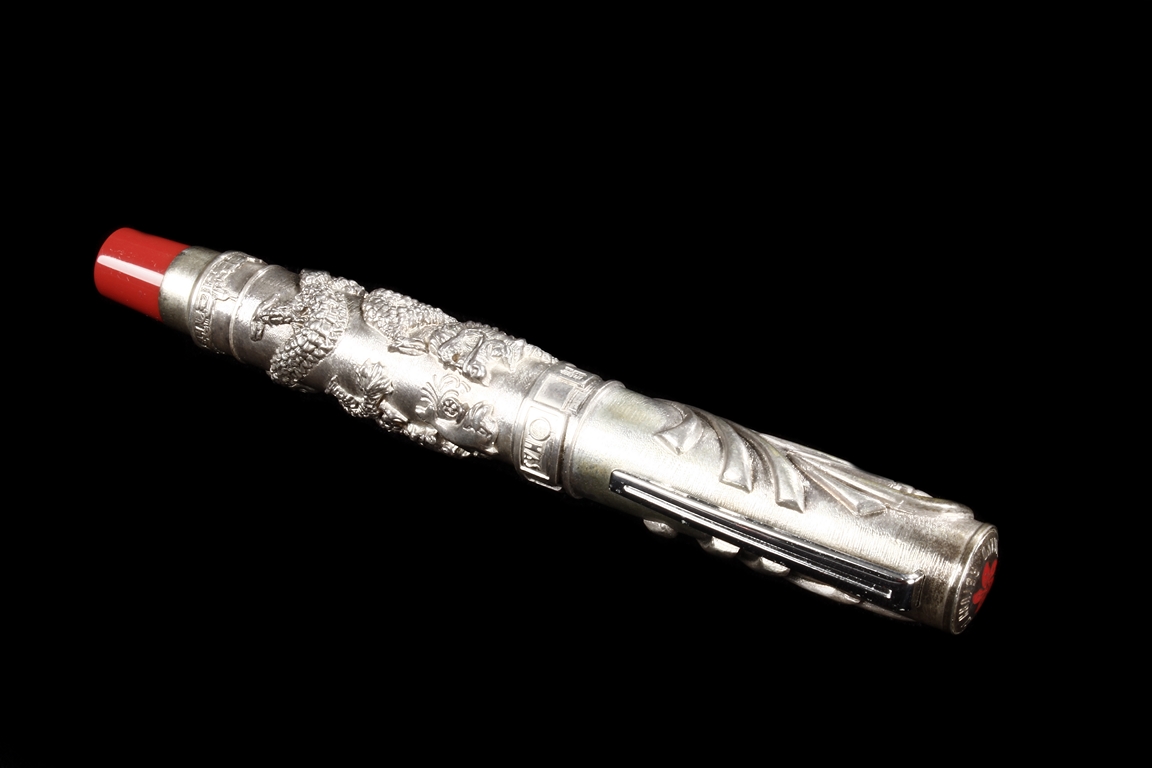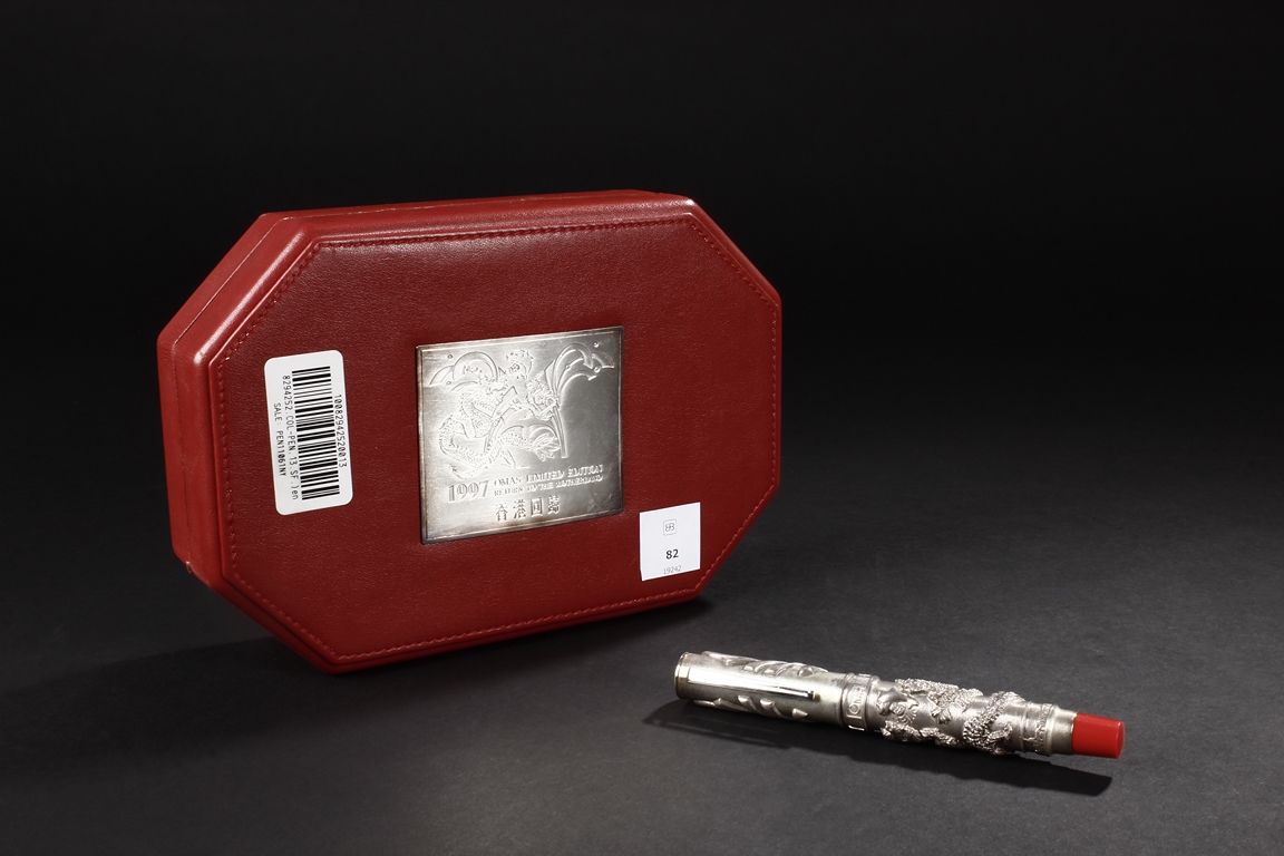 This limited edition Sterling silver and red resin fountain pen is finely cast with raised dragon motif on the barrel, water spray motif on the cap, and a dragon head on the 18K gold nib. The top of cap includes the Hong Kong orchid tree symbol and the inscription 'return to the motherland'. Also Including a certificate card with serial number 88, a signed letter, and a booklet.
