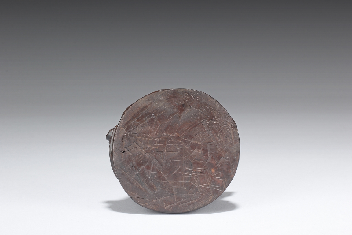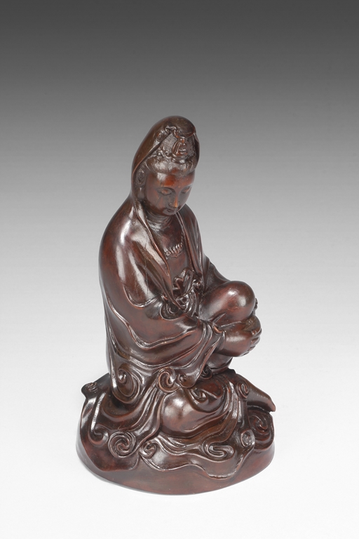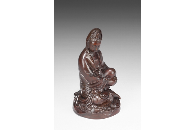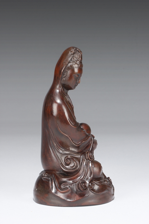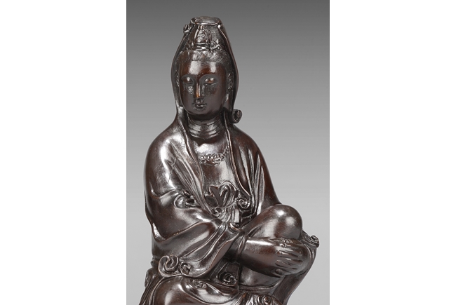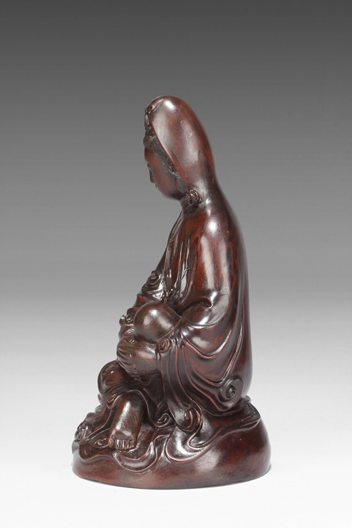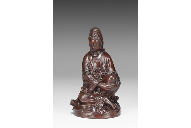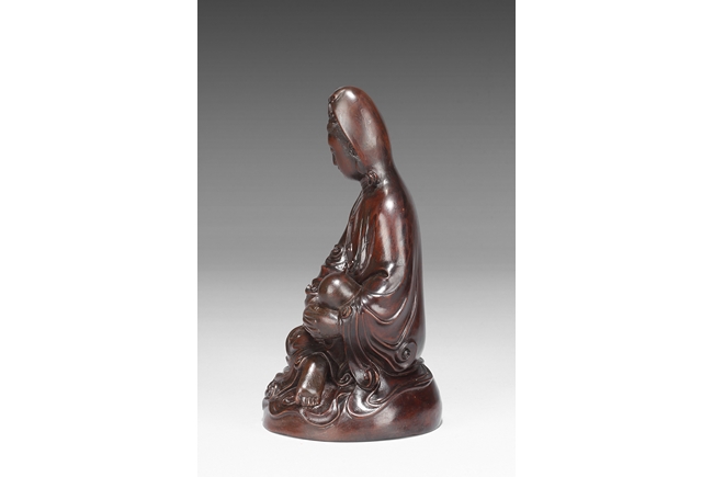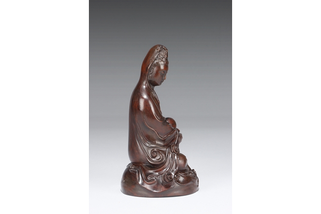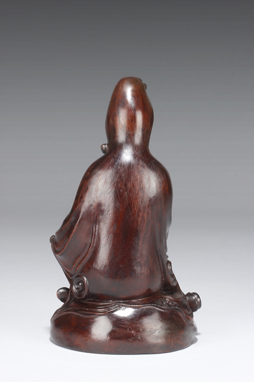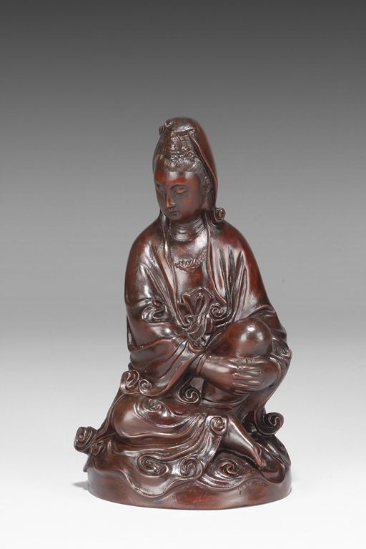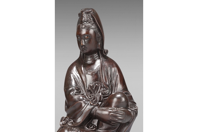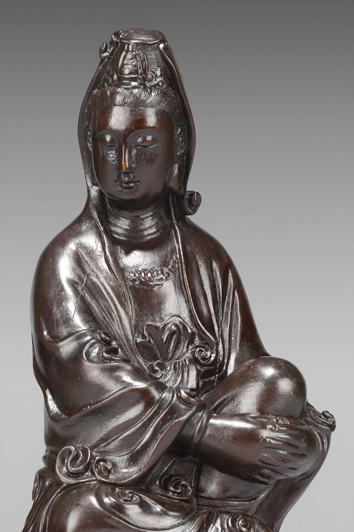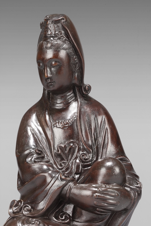 The Bodhisattva, or Guanyin, is carved seated at a peaceful manner with both hands resting on left bent knee, wearing a voluminous robes parted slightly at chest revealing necklace. With a downcast glance, her hair is tied in a chignon under a veil. Qing Dynasty period.