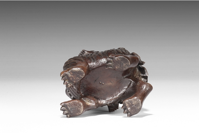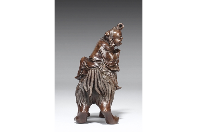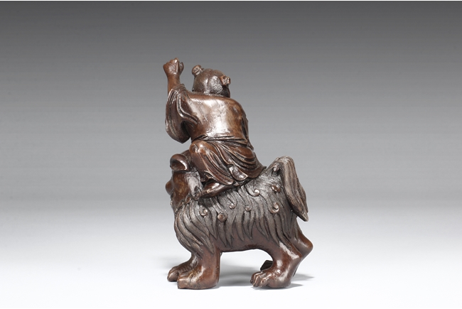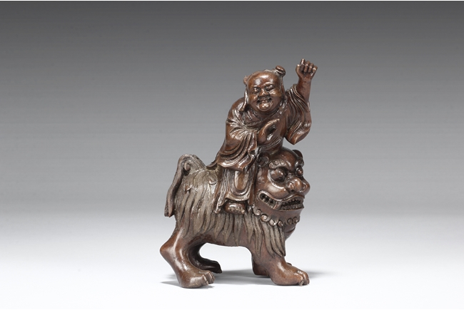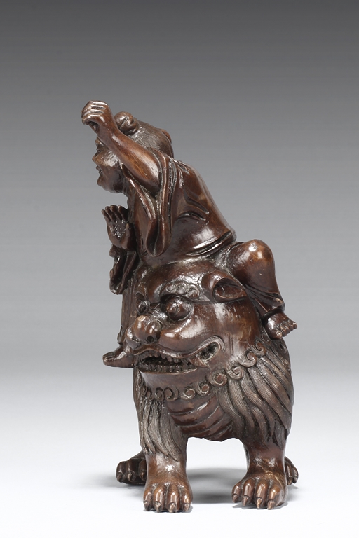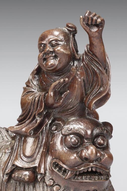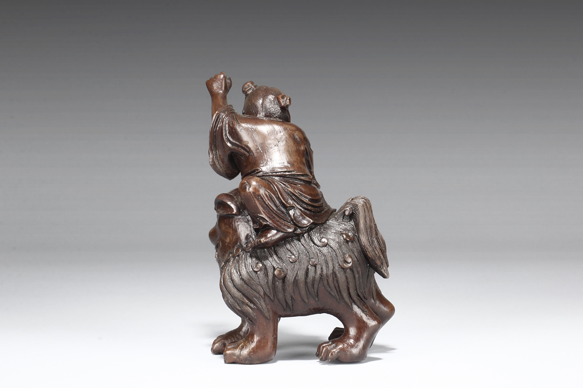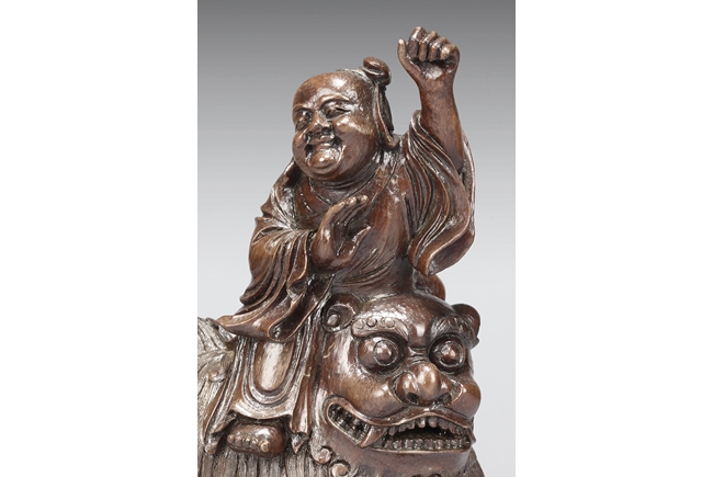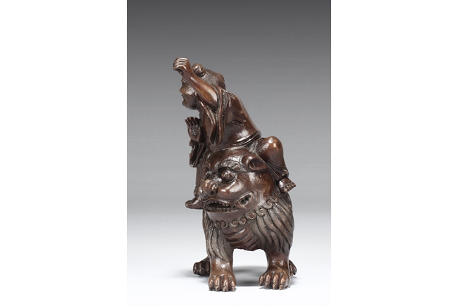 This bamboo figural group is of intricately carved shown Han Xiangzi wearing a voluminous robe seated on a lion raising his left hand, and the lion with two bulging eyeballs and slightly open mouth showing its tusks. Its mane is highly detailed with incised lines. Qing Dynasty period.