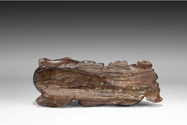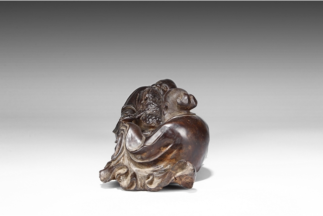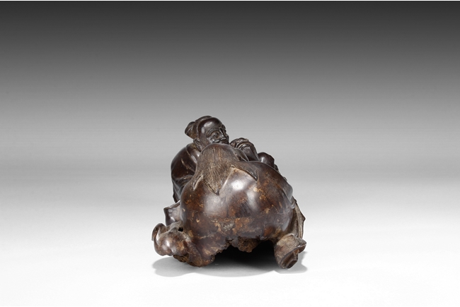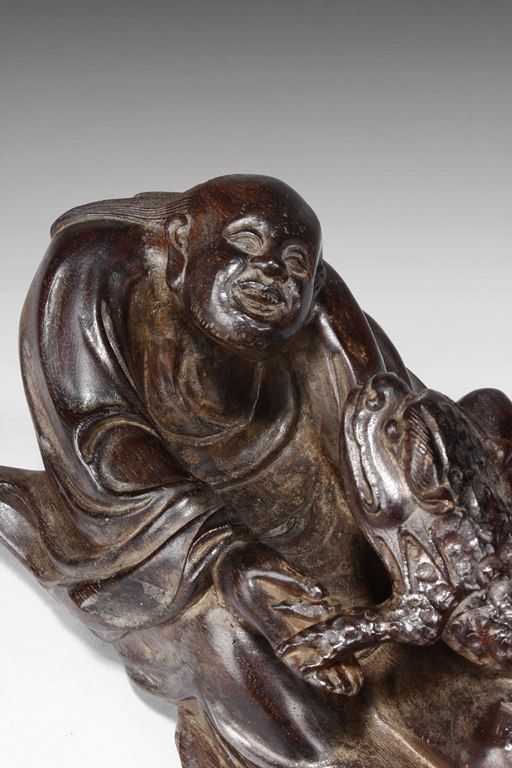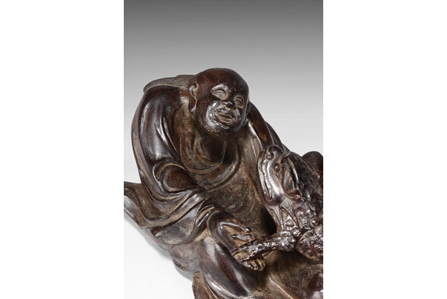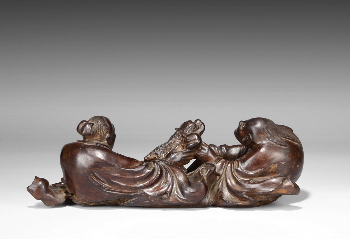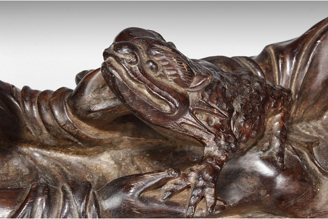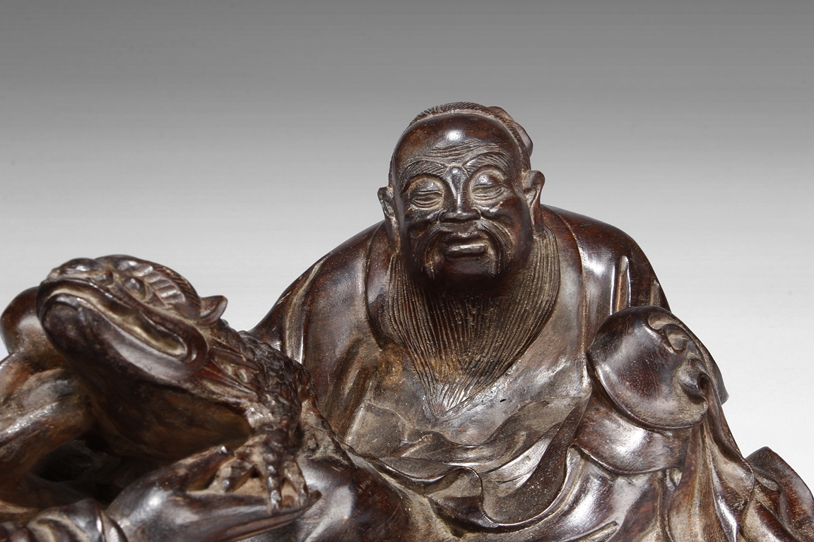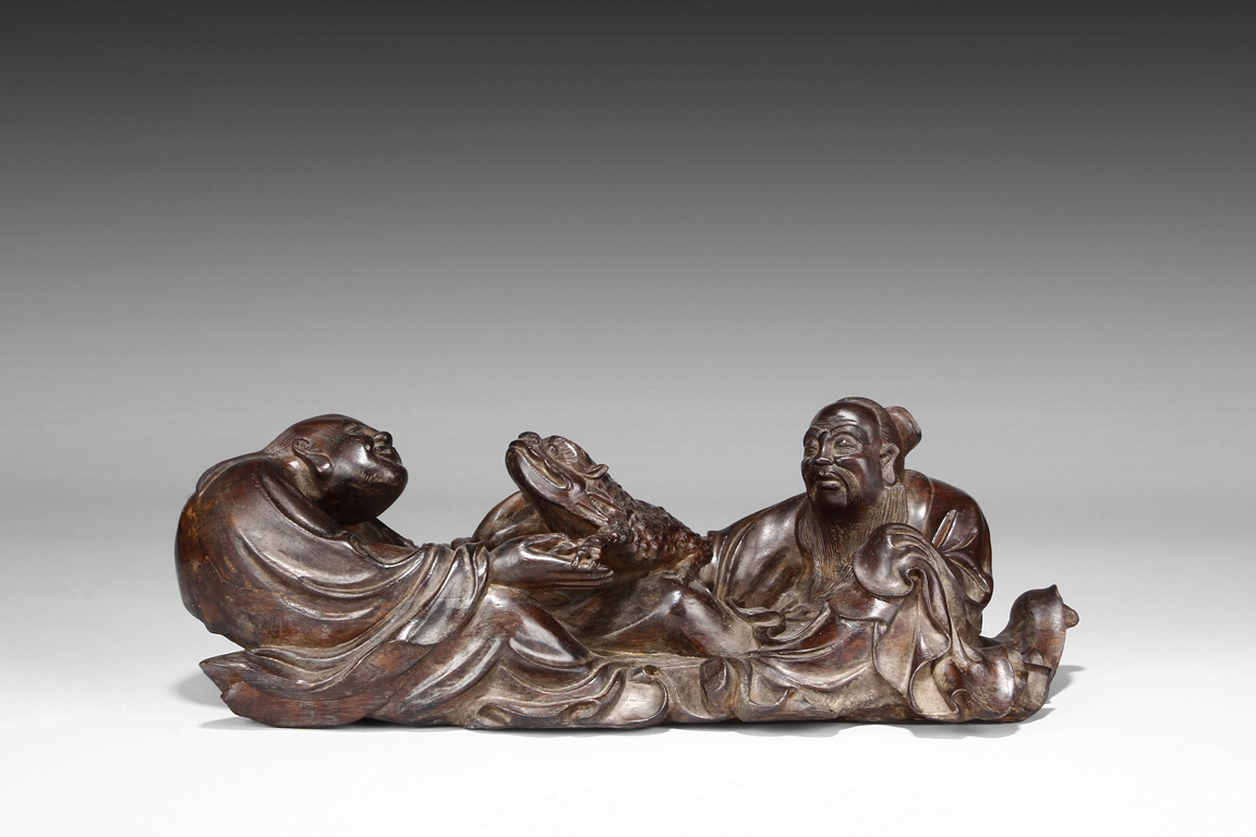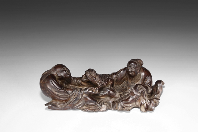 Both figures are well carved on the ends holding a toad in the middle. Wearing a loose voluminous robe, one is vividly carved with a smiling expression, its pulled-back hairs are detailed outlined with incised lines. The other figure, dressed as a scholar, is exquisitely carved with a tied topknot and a benevolent expression. Qing Dynasty period.