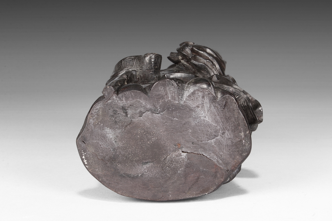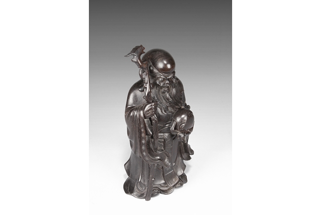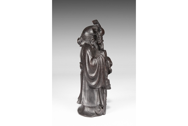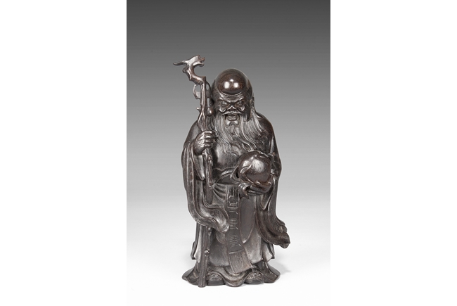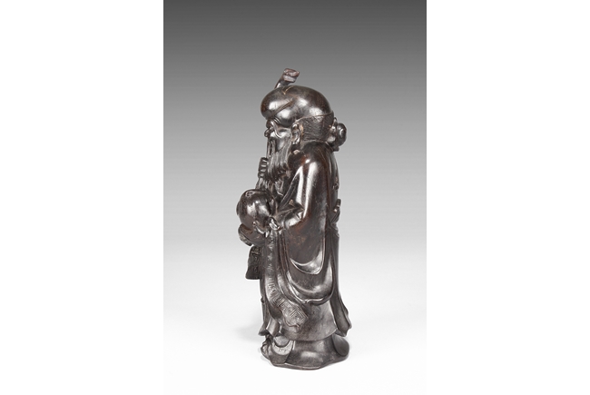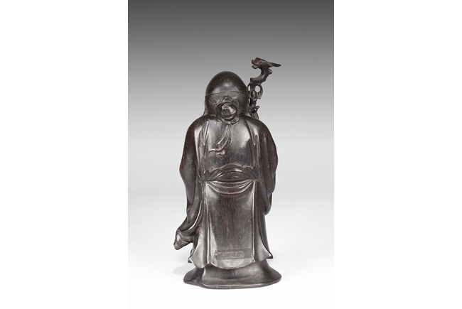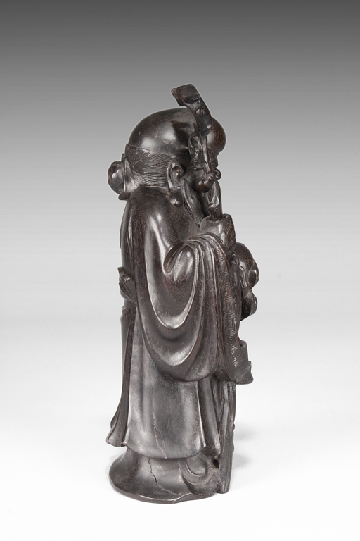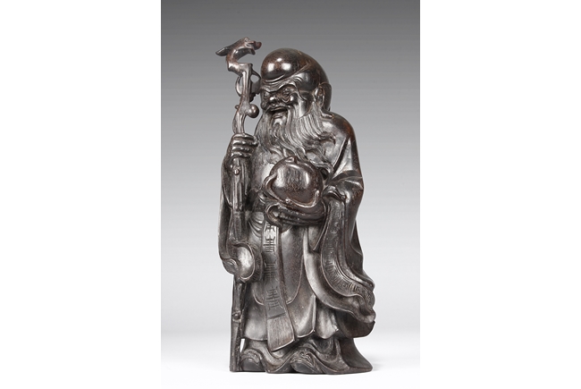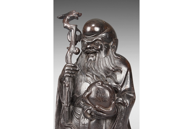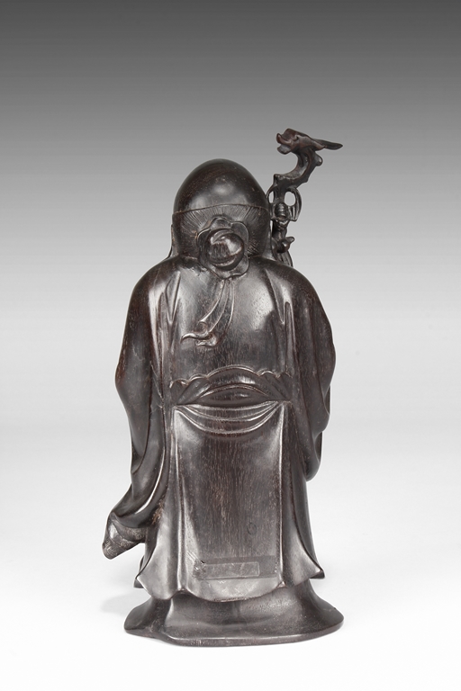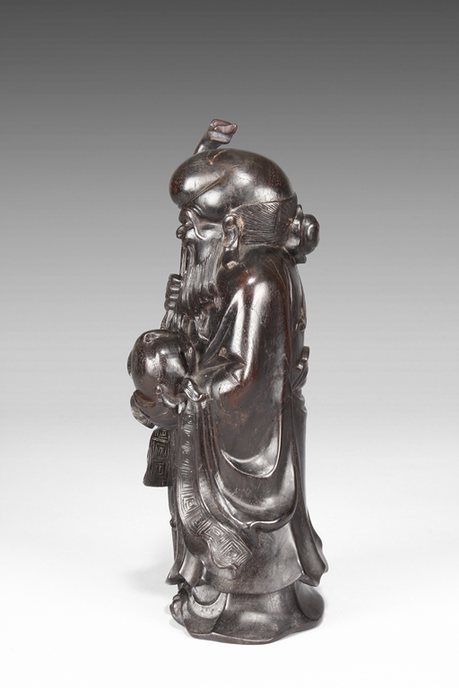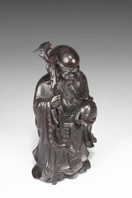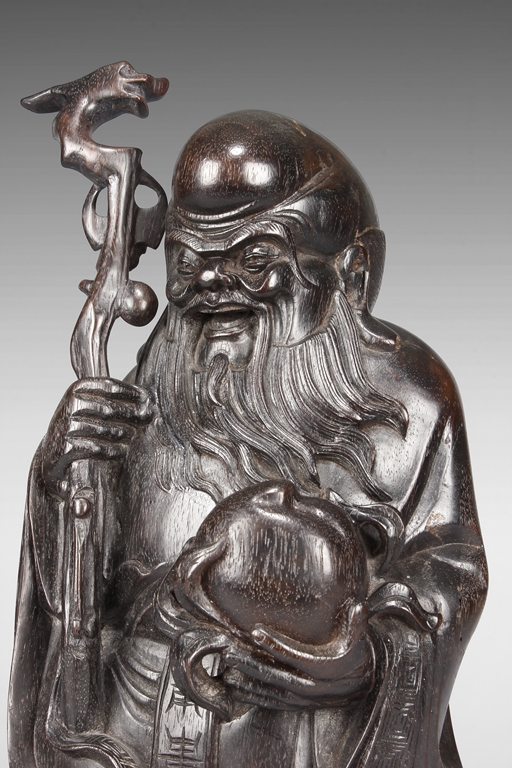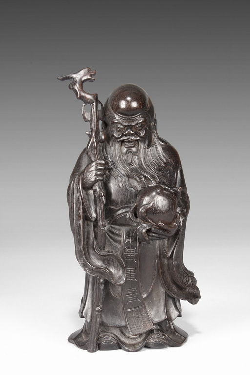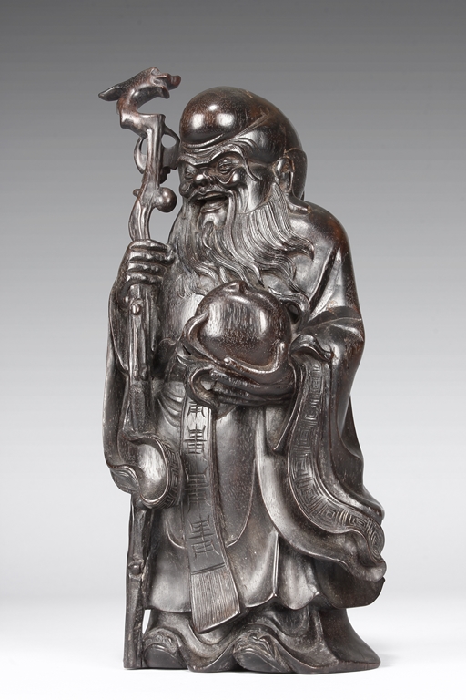 This Shoulao figure is shown standing and holding a staff on right hand and a peach spray on left hand. Wearing a long robe with stylized shou characters, his face is depicted with laughing expression, and the head is naturalistically modeled with a domed forehead. The figure carved from zitan wood with natural grain and color. Qing Dynasty period.