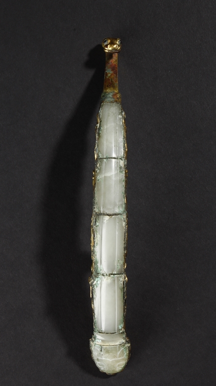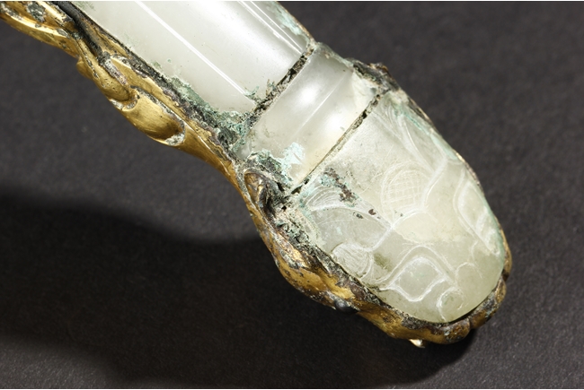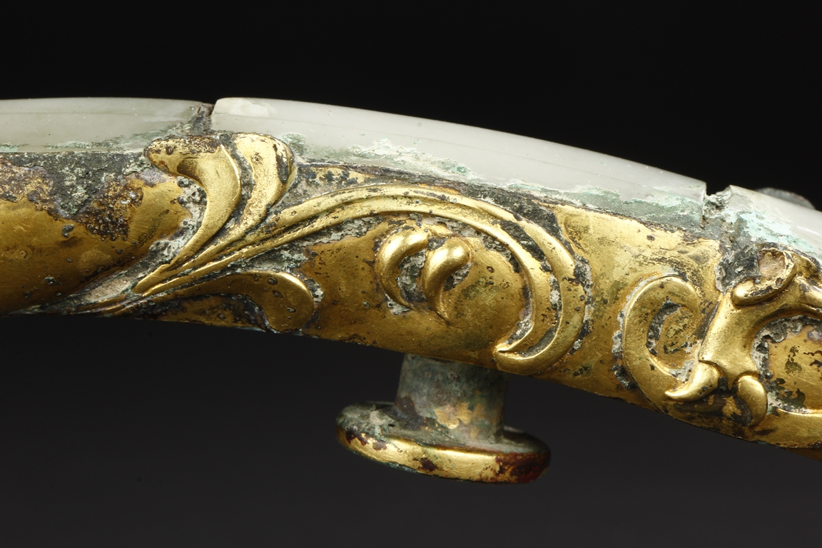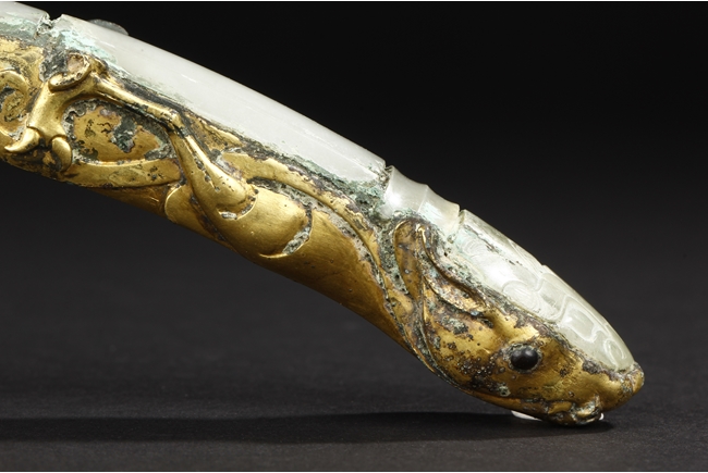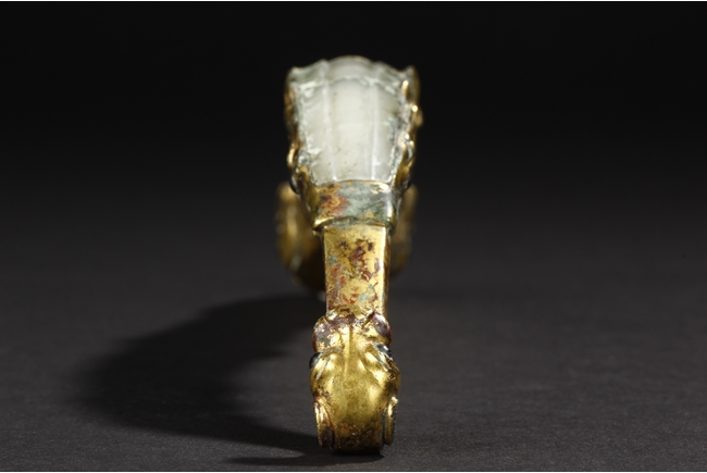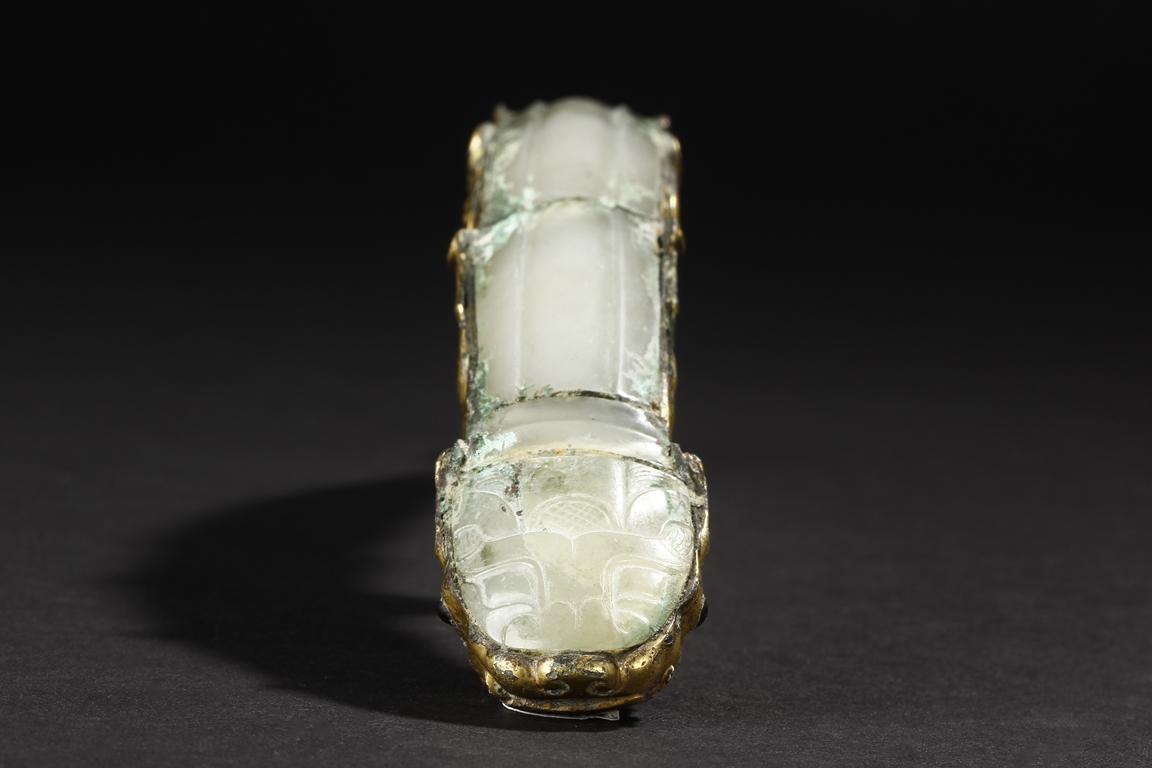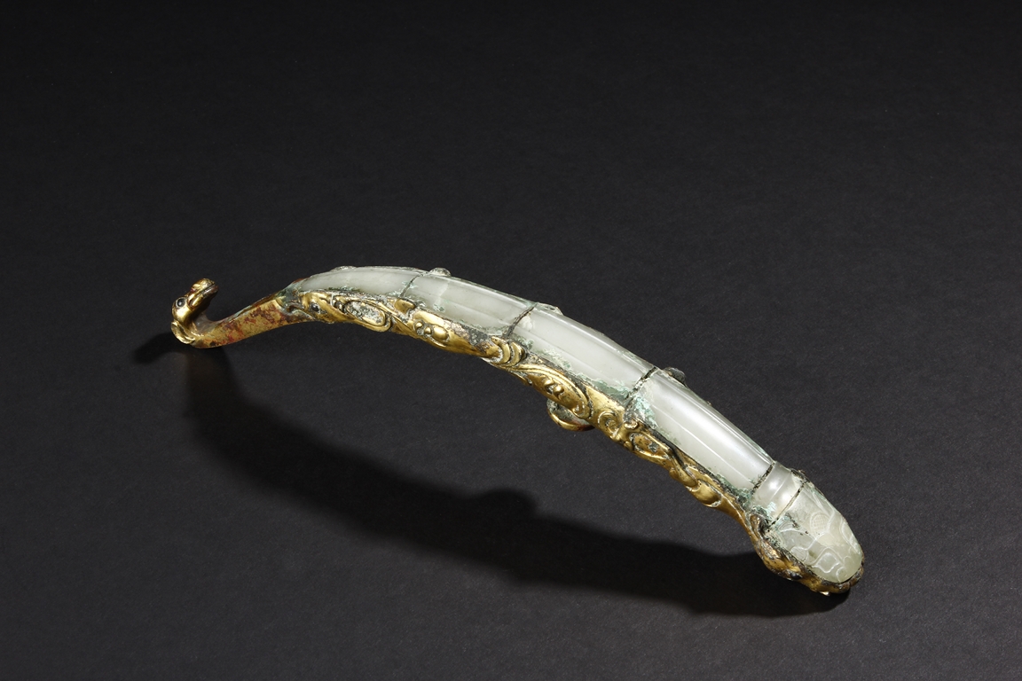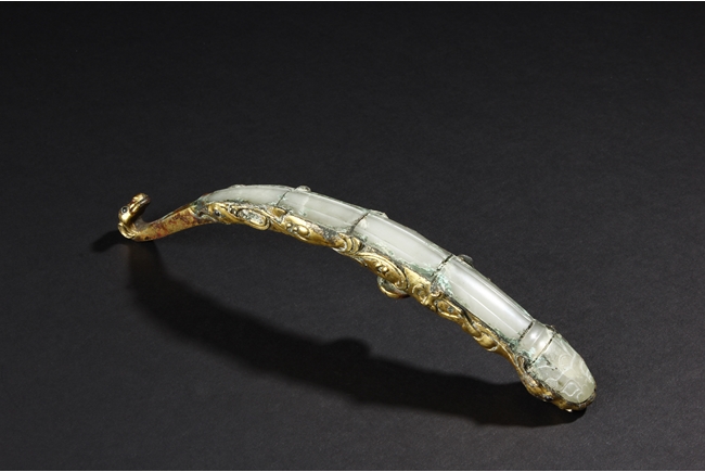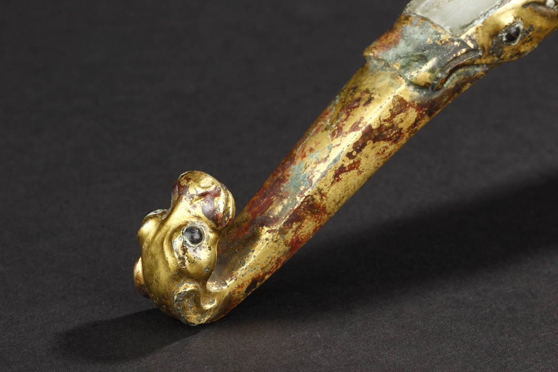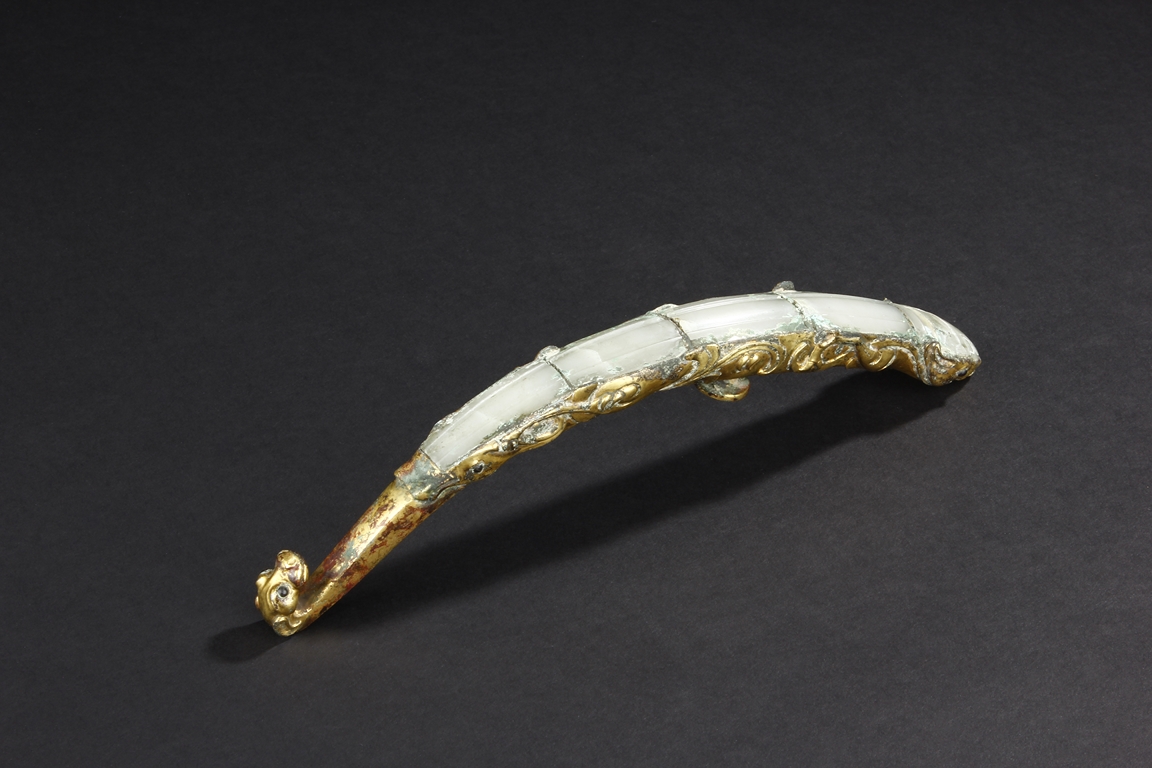 Cast in a graceful 'S' curved body, this gilt bronze belt hook is surmounted by a dragon-head hook. Its long and slender shaft is finely inlaid with white jades and one of them with incised design. The sides are cast with foliage pattern in low relief and the underside set with a circular bottom. Age-related malachite encrustation is included. Warring State Period.