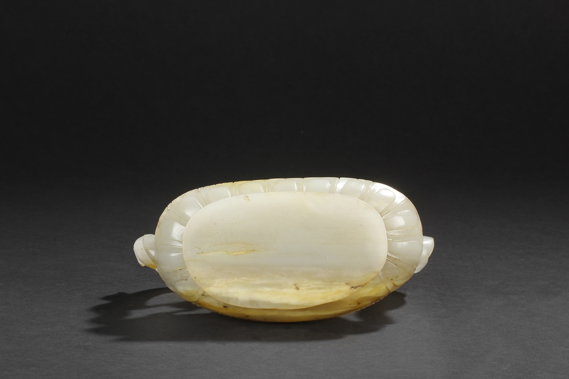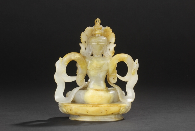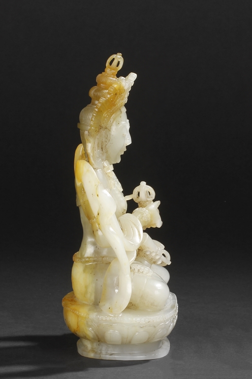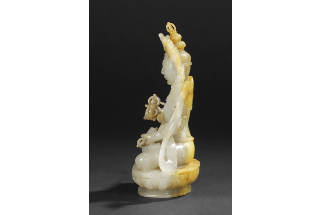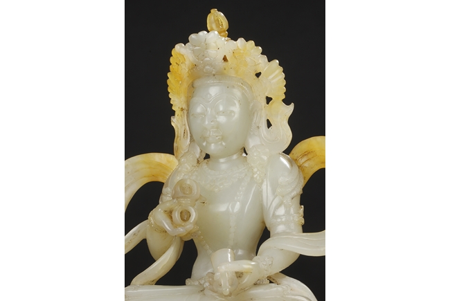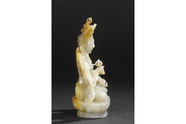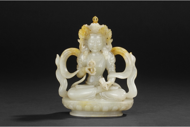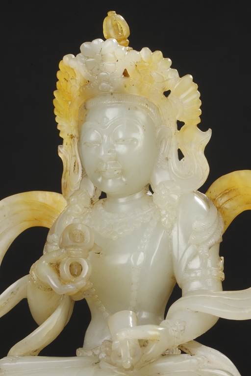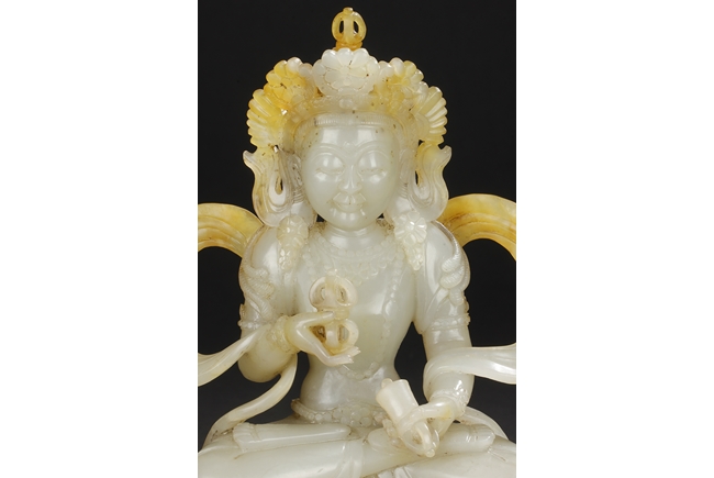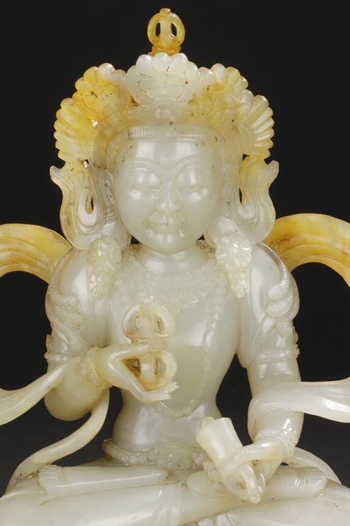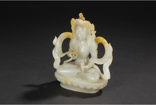 Seated on a lotus base with beaded rim, this Bodhisattva holds a vajra on right hand and a ghanta on left hand. Dressed in a loose dhoti with sash draping over elbows, his neck and chest are adorned with delicately beaded jewelry. His face is vividly depicted with serene expression and surmounted by a tiara with the hair tied into a high chignon and topped by a vaijra. Ribbons emanating flanking the body form elaborate aureoles. The stone is of white tone with russet and yellow inclusions in the back. Qing Dynasty Period