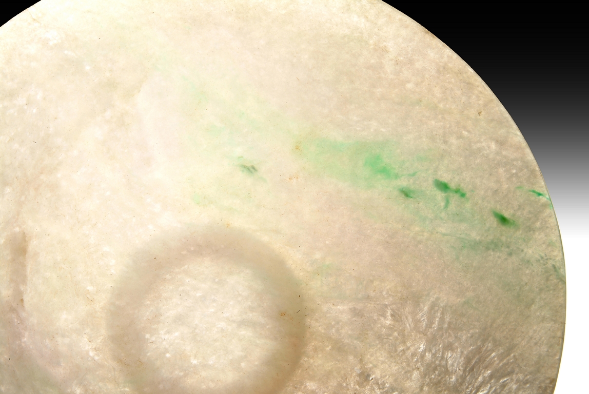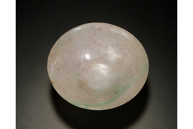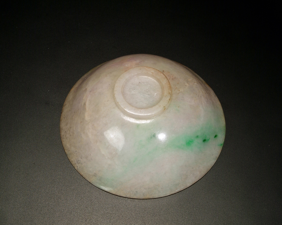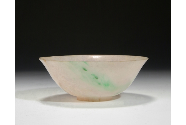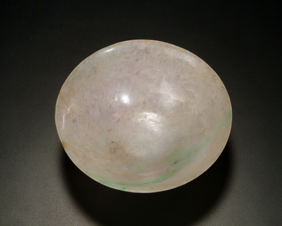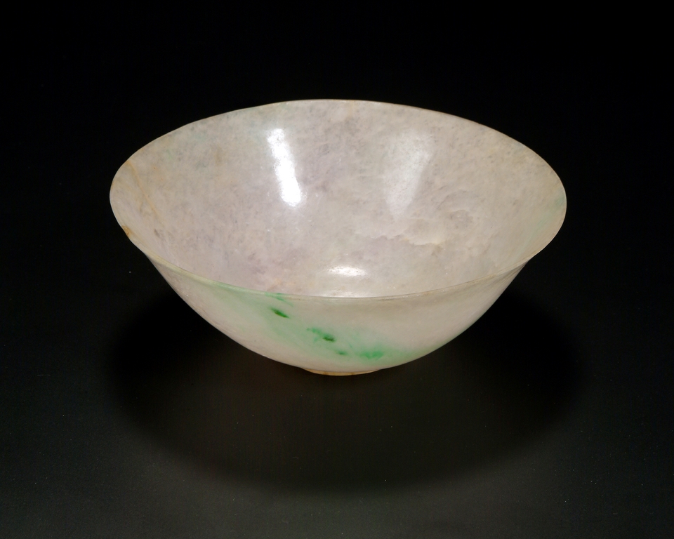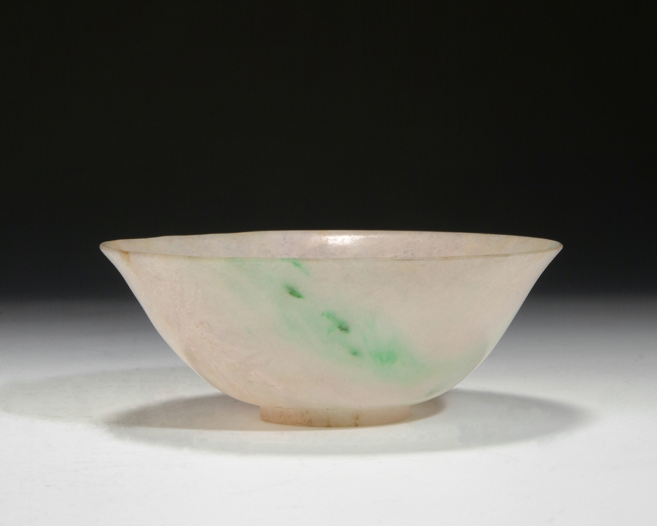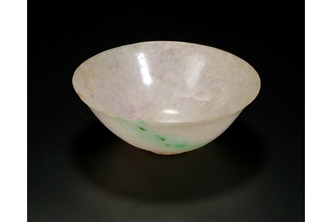 Raising from a short circular foot and a flared body, this thinly walled bowl is carved out of a single piece of jadeite, with patches of apple green colors on the body, and stone is of well translucent quality. Qing Dynasty period.