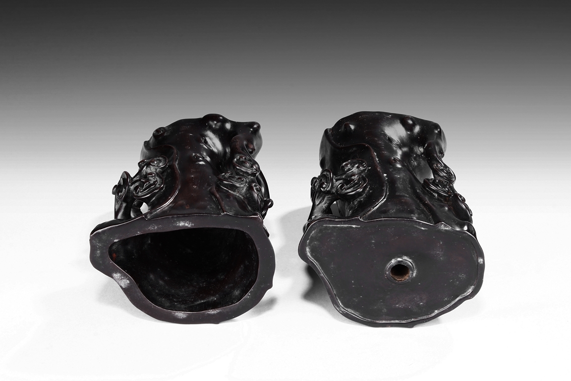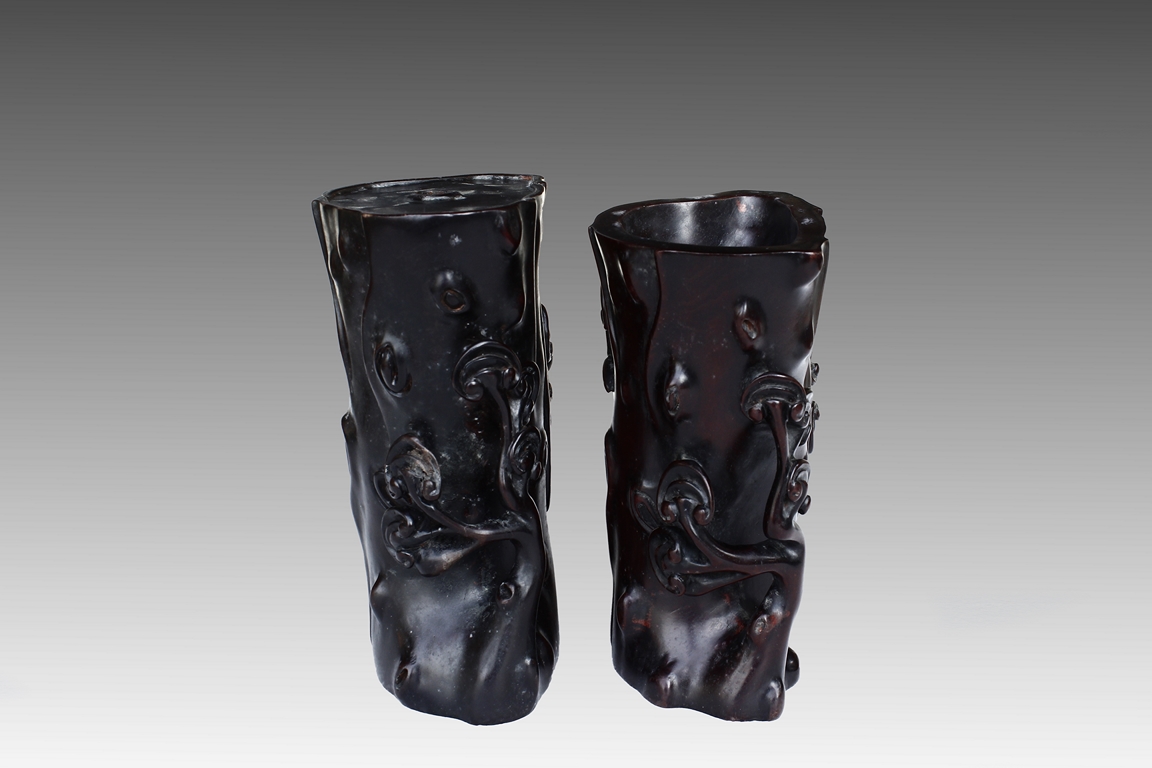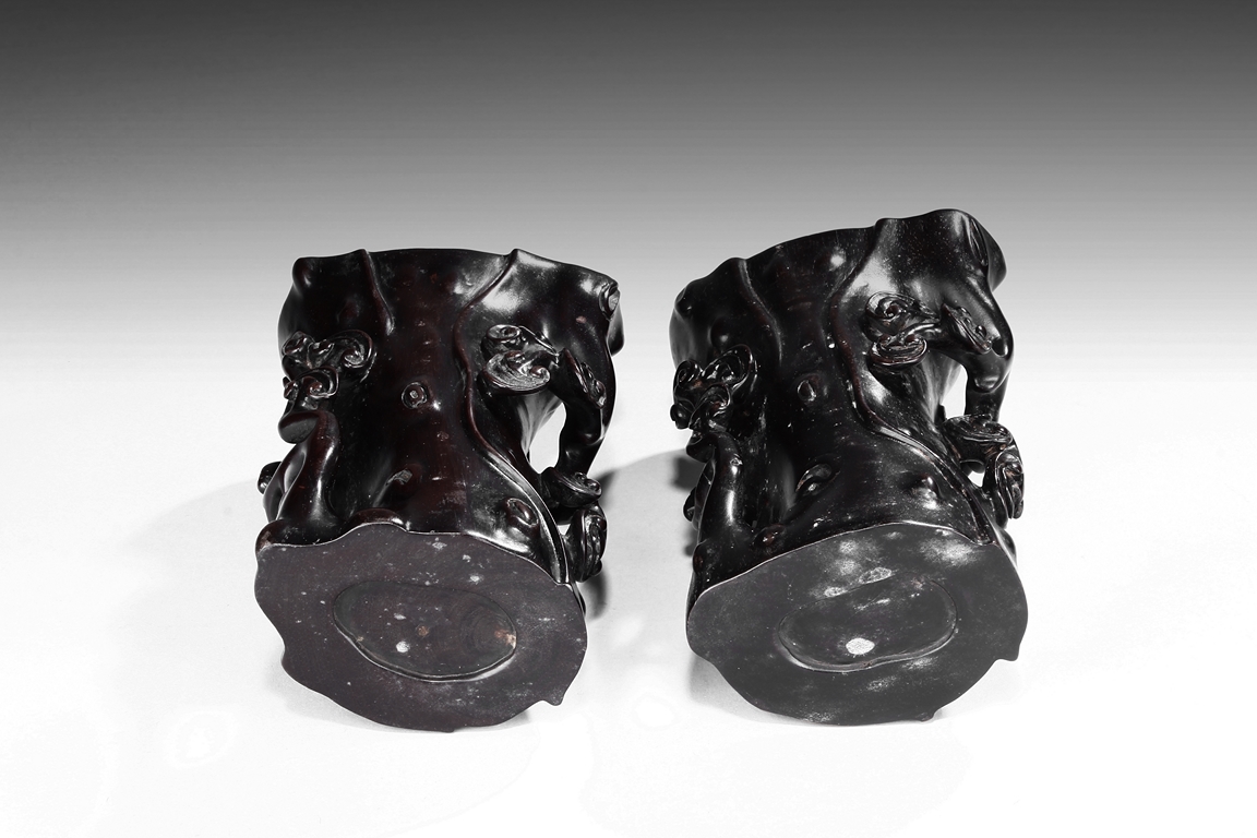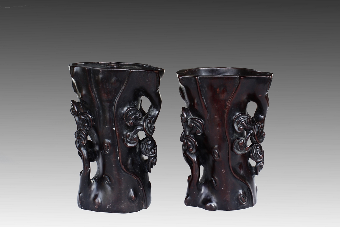 Of sectioned tree trunk form, the brush pots naturalistically carved with bumps, curves, and lingzhi branches on the body, the color of deep purplish-red and black, with natural grains. One brush pot's top is partially covered, leaving just a small hole. Qing Dynasty period.