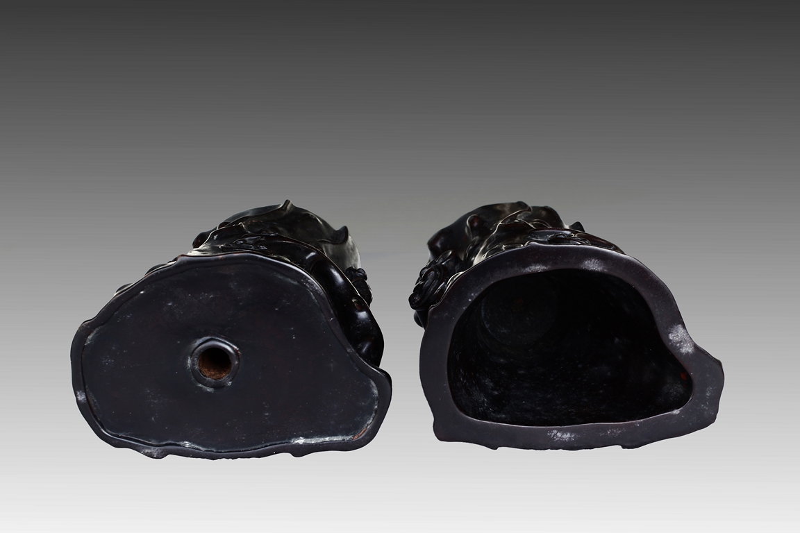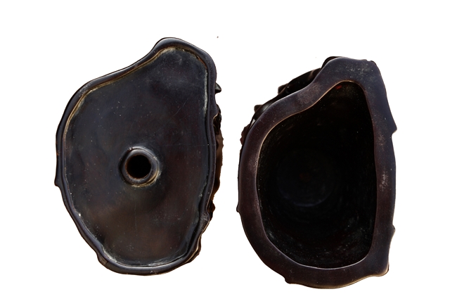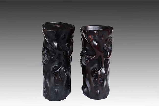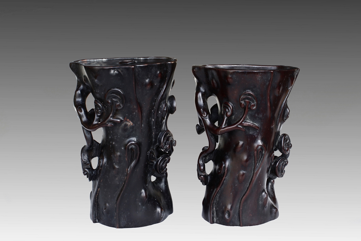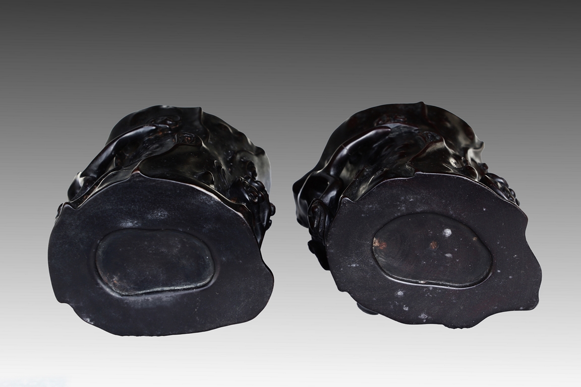 Of sectioned tree trunk form, the brush pots naturalistically carved with bumps, curves, and lingzhi branches on the body, the color of deep purplish-red and black, with natural grains. One brush pot's top is partially covered, leaving just a small hole. Qing Dynasty period.
