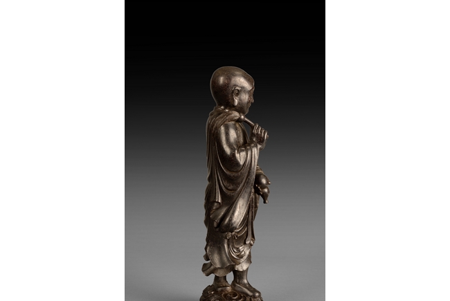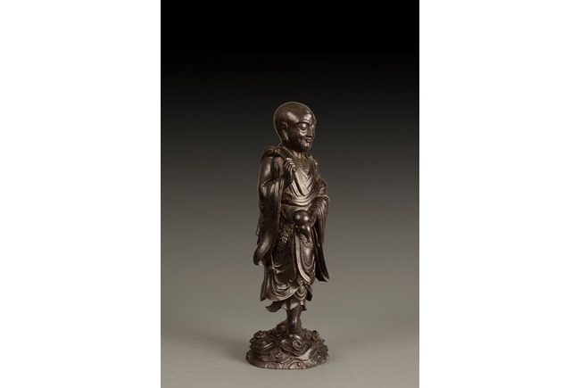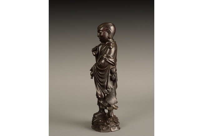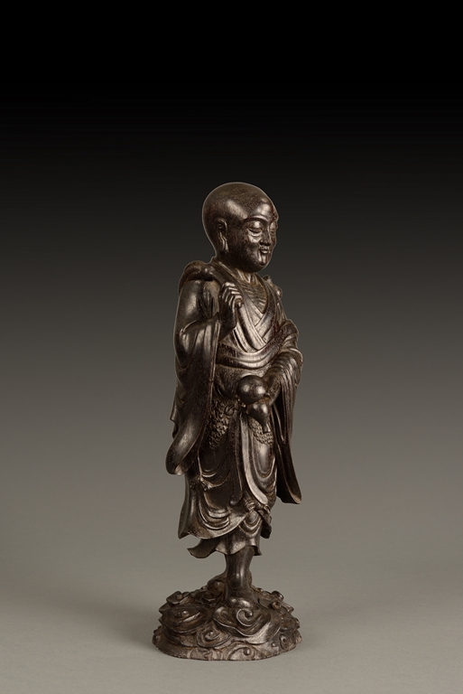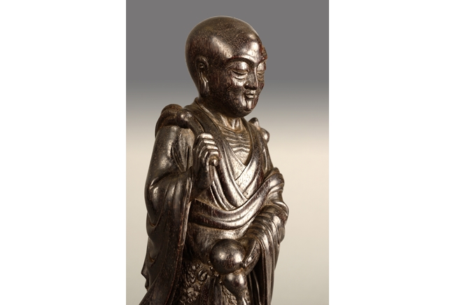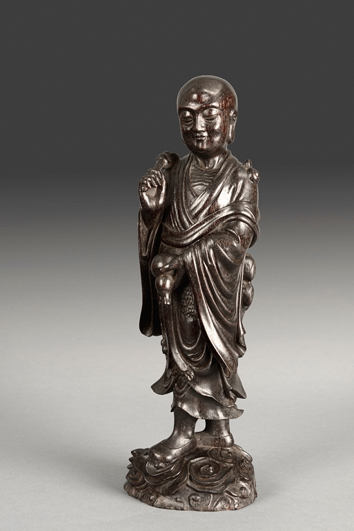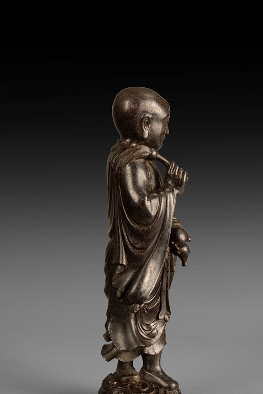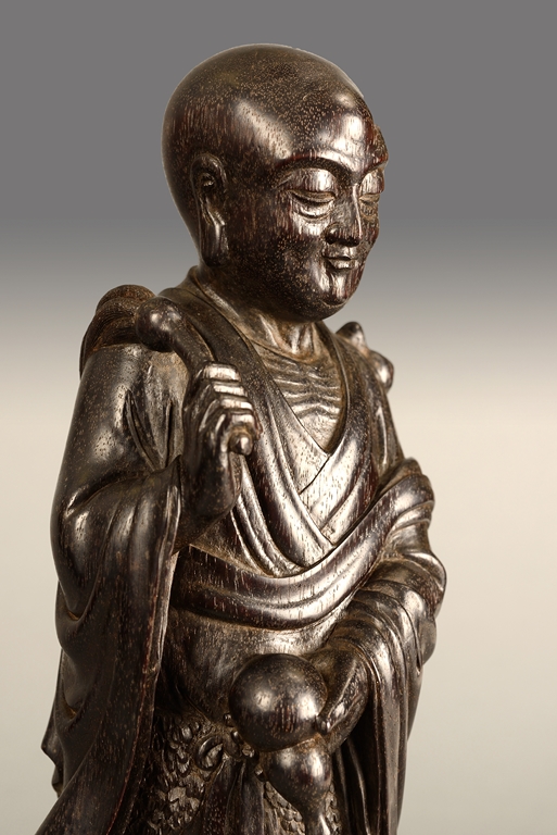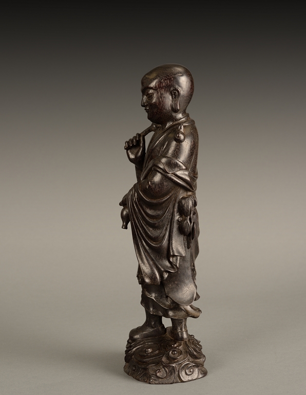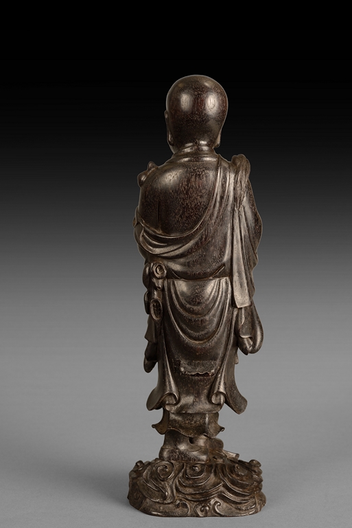 This finely carved Zitan Arhat is shown in a standing posture on top of a base carved with swirling cloud patterns. He is depicted with a serene expression and holds a gourd on one hand, and a Buddhist staff on the other hand. Qing Dynasty period.
