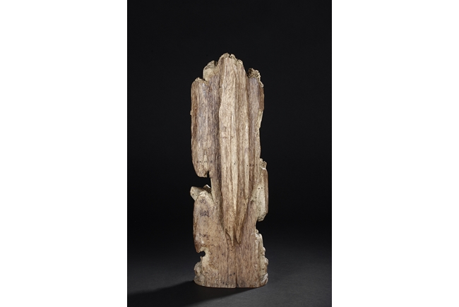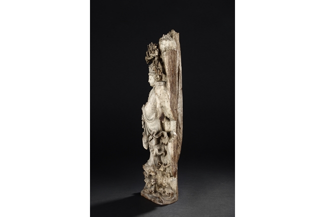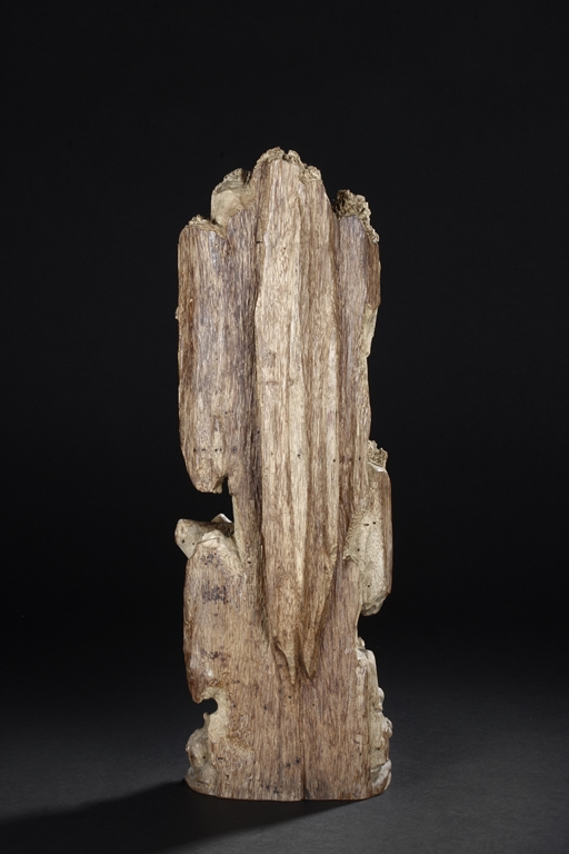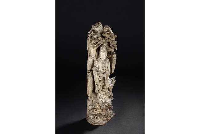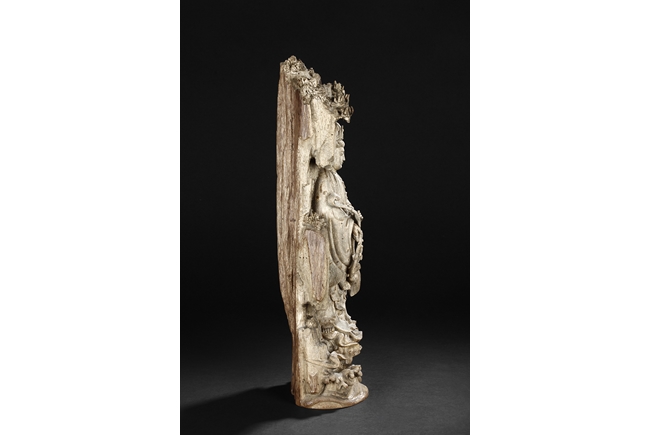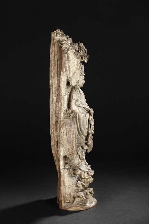 High relief carved from a single agarwood tree trunk, the carving depicts the Guanyin floating above clouds in front of a steep mountain, both hands holding a ruyi scepter with tassel, wearing flowing robes, with serene expression, overlooking ocean wave and people below. Early Qing Dynasty period.