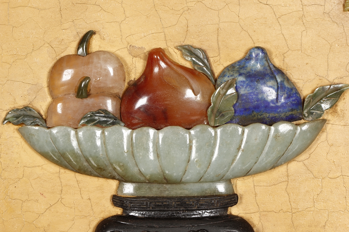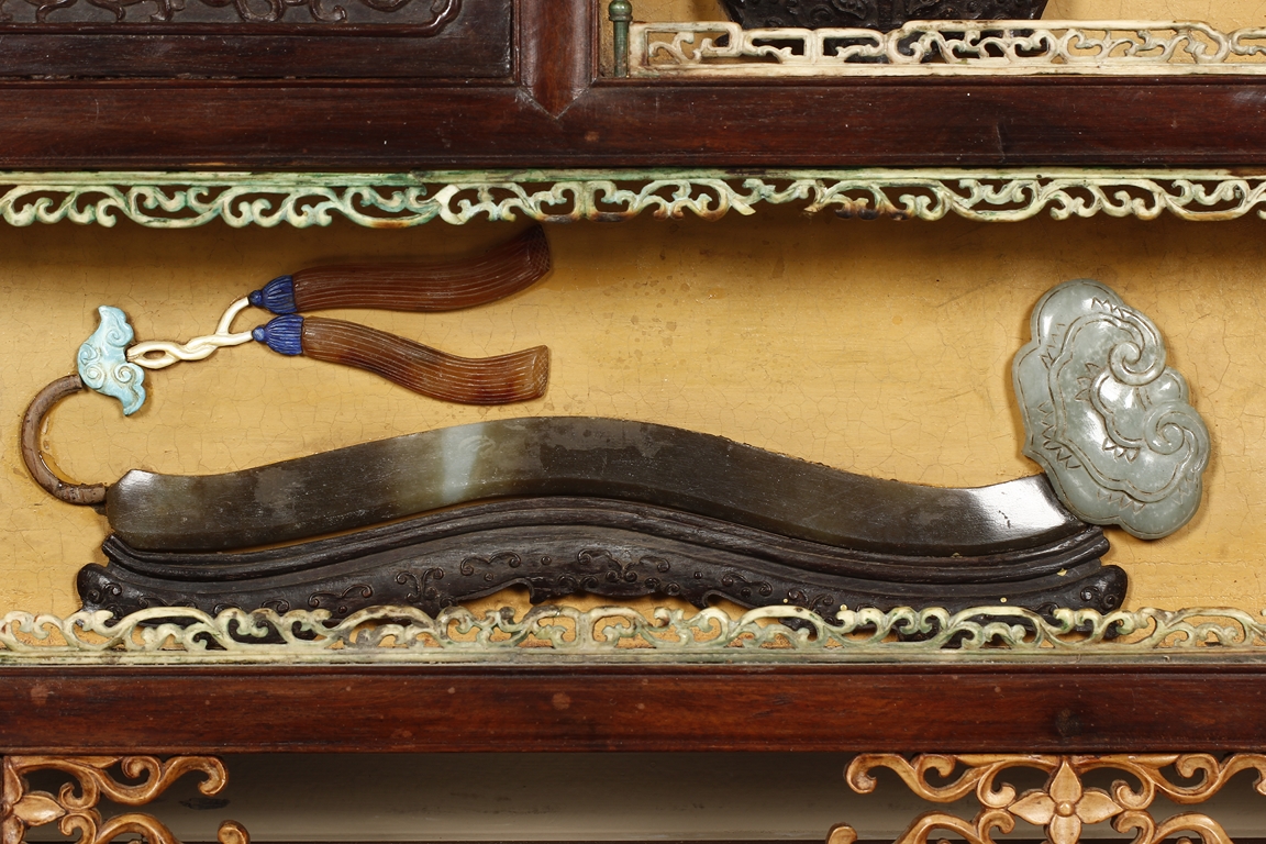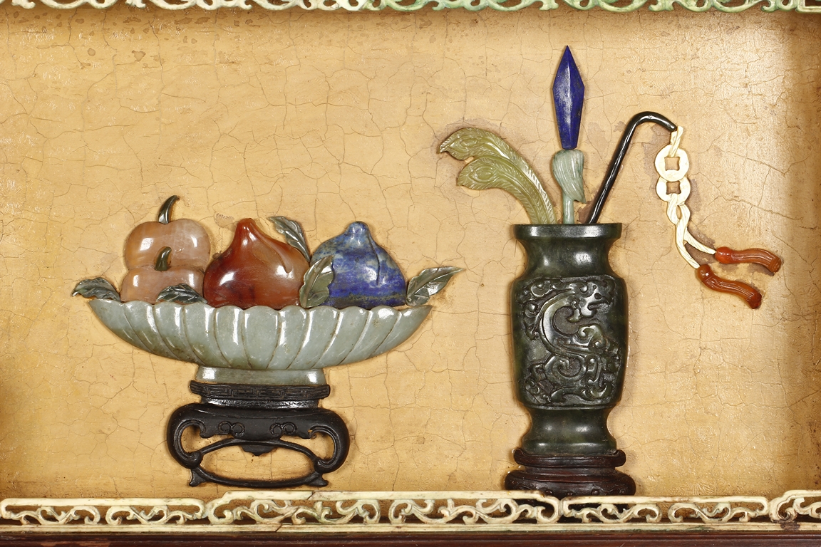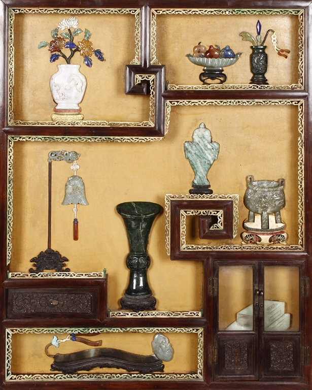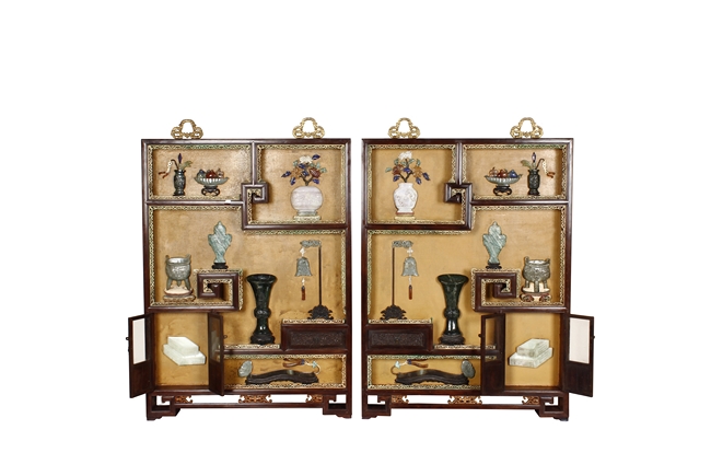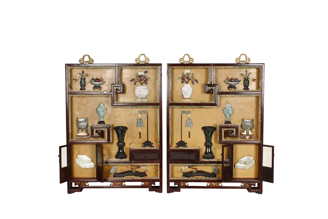 These hanging cabinet panels framed in zitan wood are each inlaid with various jades and hardstones to depict an ensemble of scholar's objects in a closet, including a lavender jade vase containing jade flowers on a ivory stand, a dark spinach jade vase with implements, a celadon Ding vessel, a jadeite two-handled vase, a dark spinach jade Gu vessel, a celadon jade hanging bell, a white jade group inset in a closet, a celadon jade ruyi with soapstone carved silk tassel, etc, all on wooden or ivory stand against ochre lacquer ground and fixed with a gilt bronze hanging bracket. The borders of the interior closet is exquisitely carved with ivory frames in open works of scrolling foliage patterns. Qing Dynasty Period