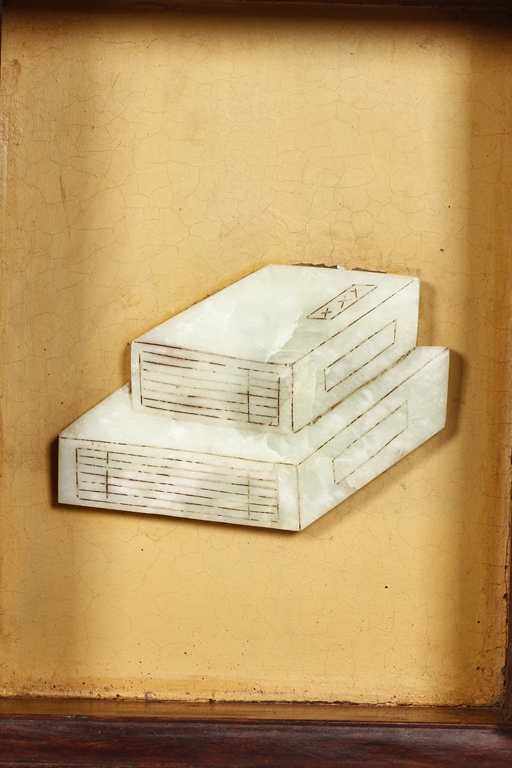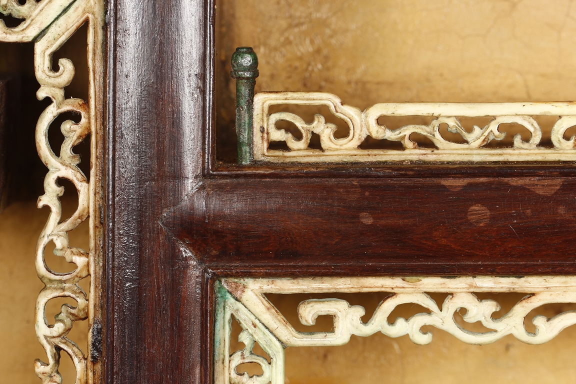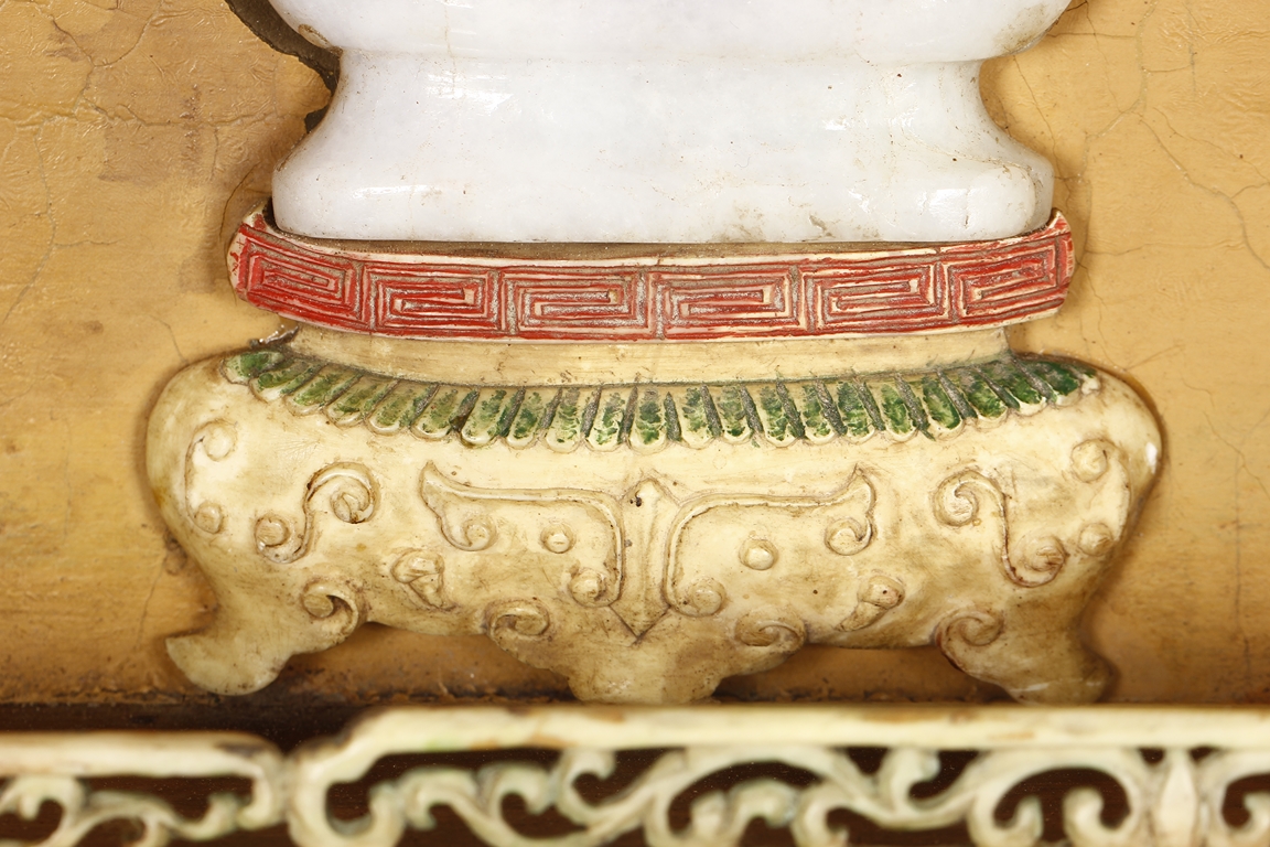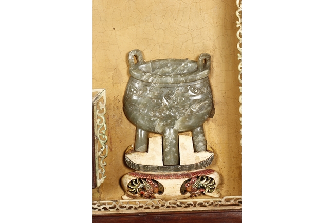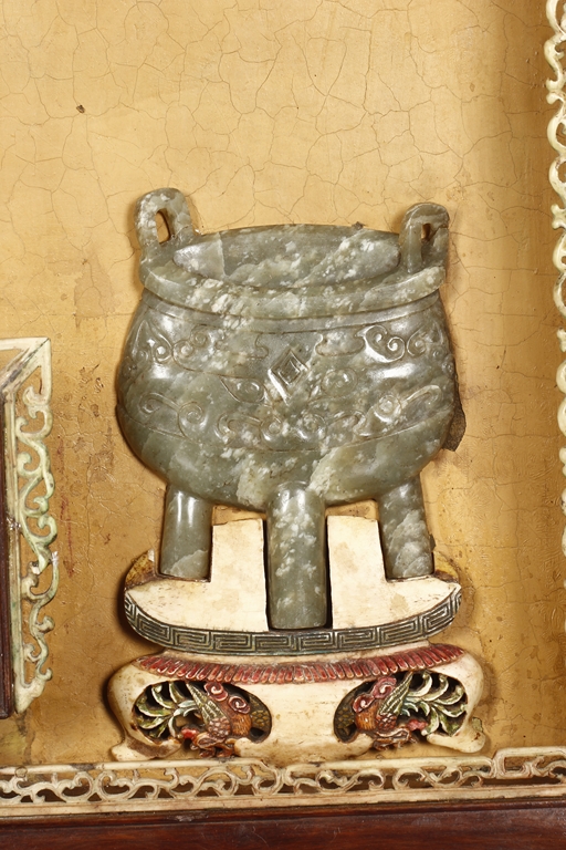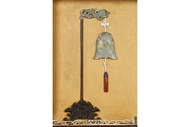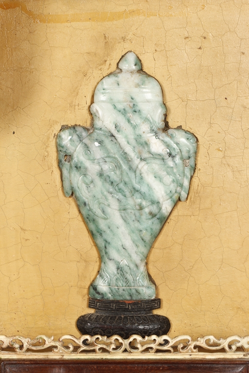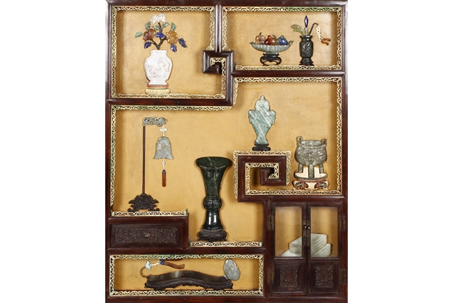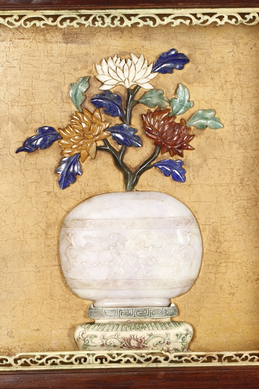 These hanging cabinet panels framed in zitan wood are each inlaid with various jades and hardstones to depict an ensemble of scholar's objects in a closet, including a lavender jade vase containing jade flowers on a ivory stand, a dark spinach jade vase with implements, a celadon Ding vessel, a jadeite two-handled vase, a dark spinach jade Gu vessel, a celadon jade hanging bell, a white jade group inset in a closet, a celadon jade ruyi with soapstone carved silk tassel, etc, all on wooden or ivory stand against ochre lacquer ground and fixed with a gilt bronze hanging bracket. The borders of the interior closet is exquisitely carved with ivory frames in open works of scrolling foliage patterns. Qing Dynasty Period