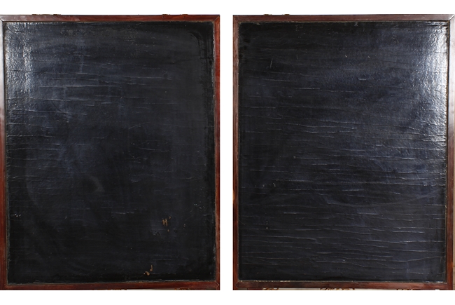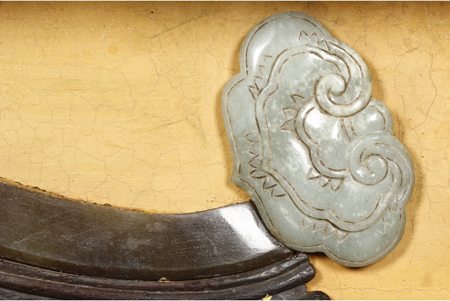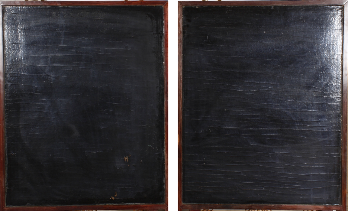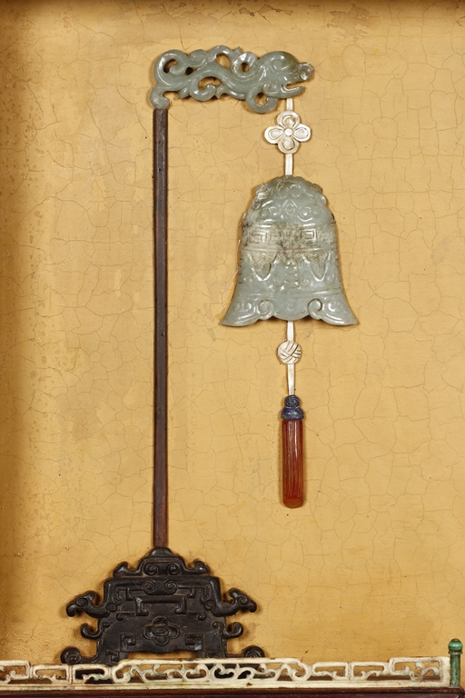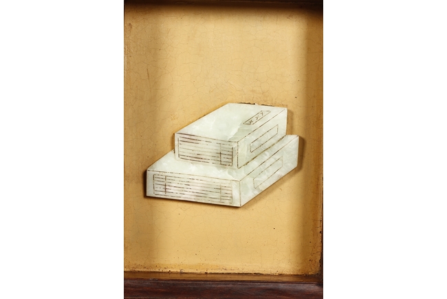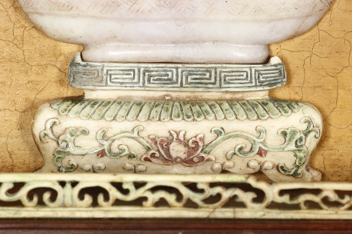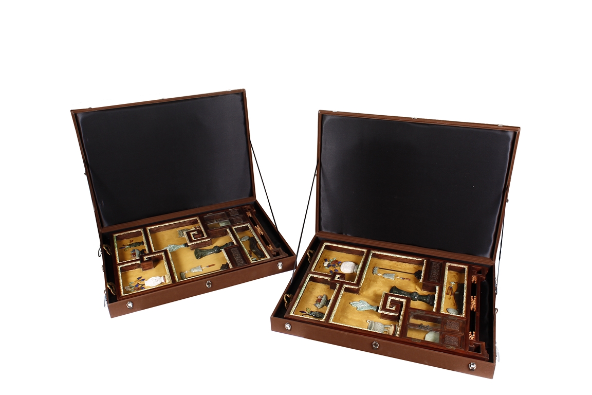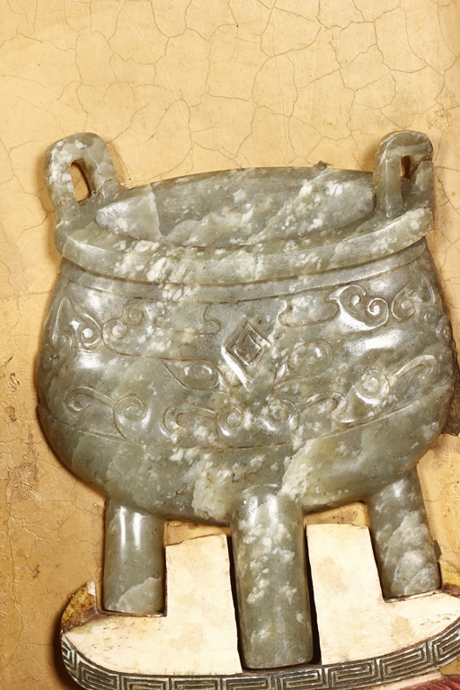 These hanging cabinet panels framed in zitan wood are each inlaid with various jades and hardstones to depict an ensemble of scholar's objects in a closet, including a lavender jade vase containing jade flowers on a ivory stand, a dark spinach jade vase with implements, a celadon Ding vessel, a jadeite two-handled vase, a dark spinach jade Gu vessel, a celadon jade hanging bell, a white jade group inset in a closet, a celadon jade ruyi with soapstone carved silk tassel, etc, all on wooden or ivory stand against ochre lacquer ground and fixed with a gilt bronze hanging bracket. The borders of the interior closet is exquisitely carved with ivory frames in open works of scrolling foliage patterns. Qing Dynasty Period