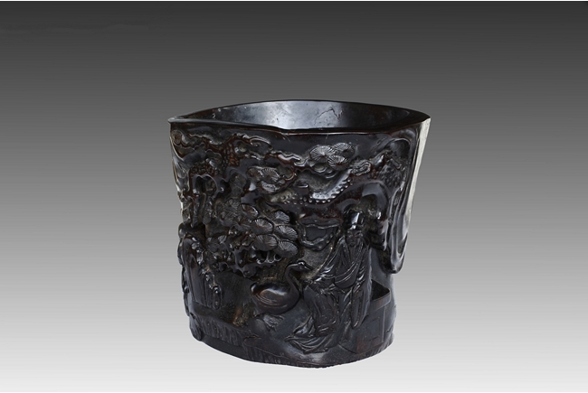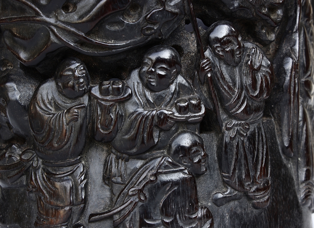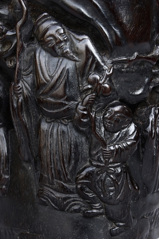 Of slightly tapering cylindrical form, the brush pot's body relief carved with a scrolling scene of children and elder gathered in a forest setting, surrounded by pine trees, mountains, and river, while another elder is seated on a pedestal near a large goose, the wood of natural deep purplish-red color and visible grains. Qing Dynasty period.
