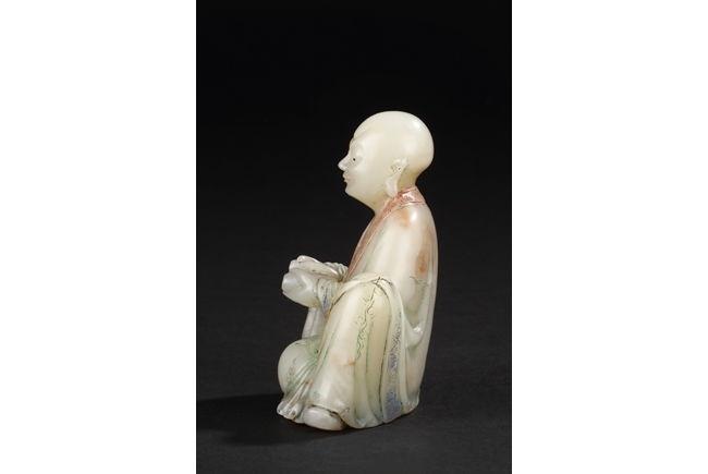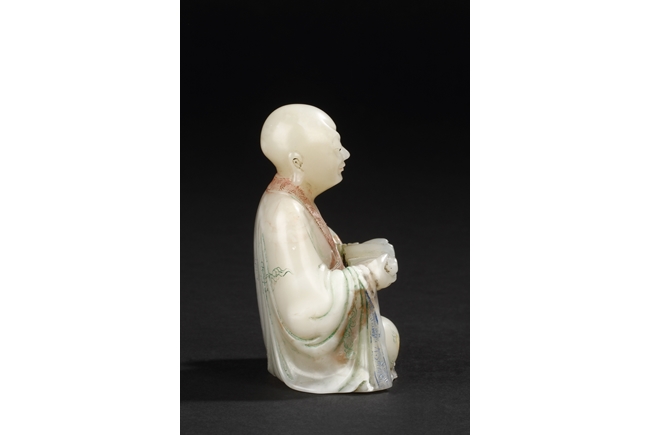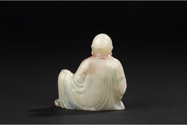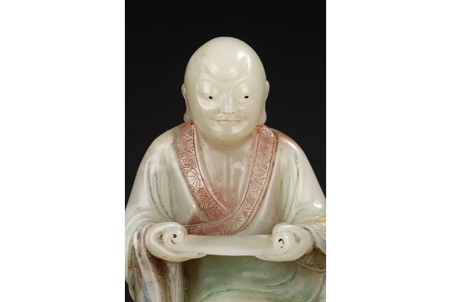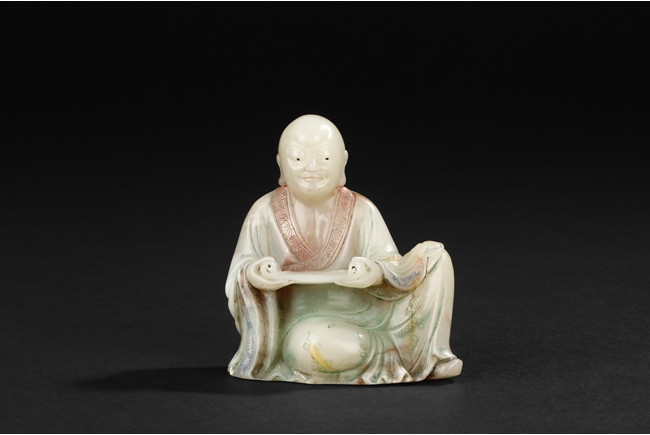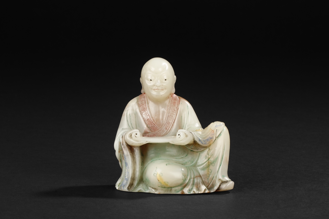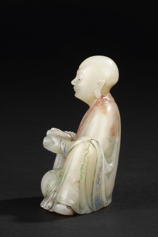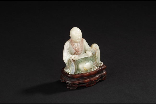 The Arhat is seated with one knee raised upwards acting as arm-rest, two hands holding an opened scroll, with serene expression and is dressed in highlighted robe, on top of original wooden stand. Qing Dynasty period.
