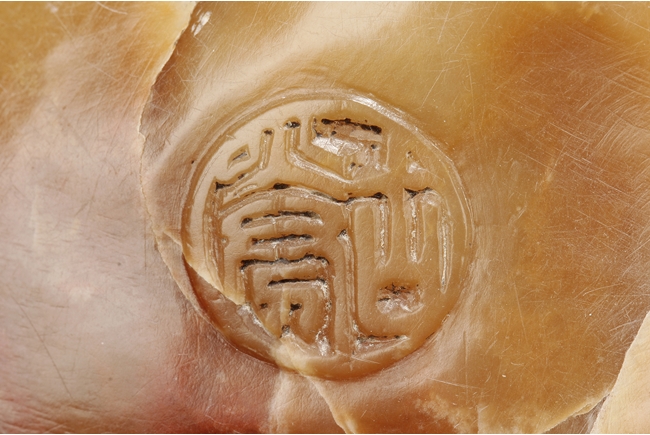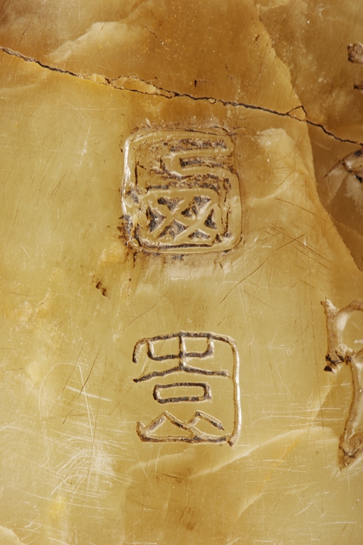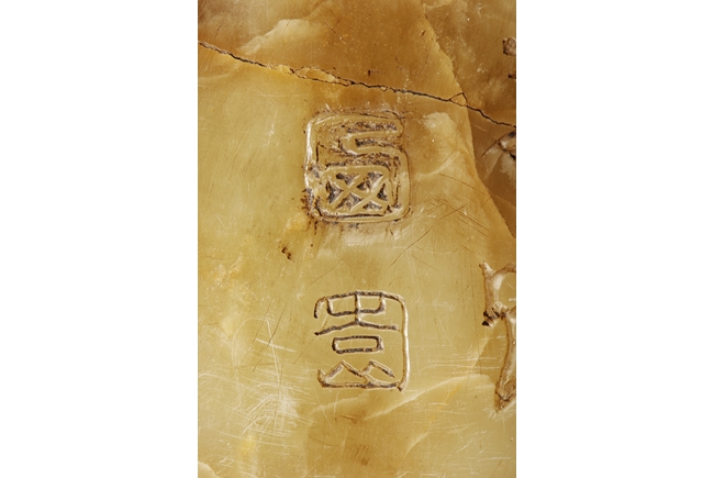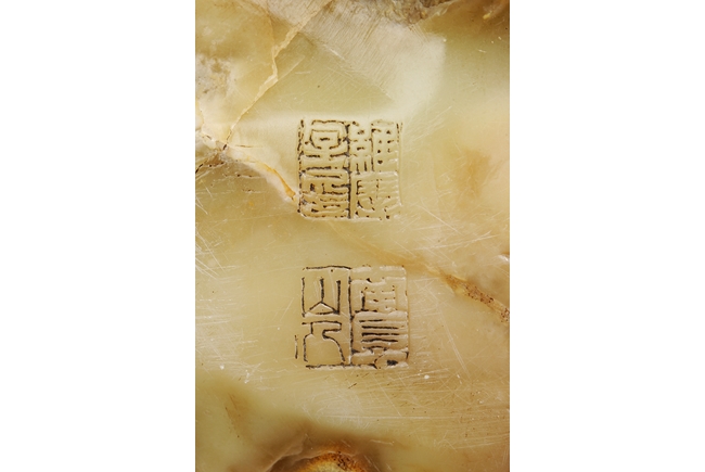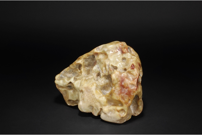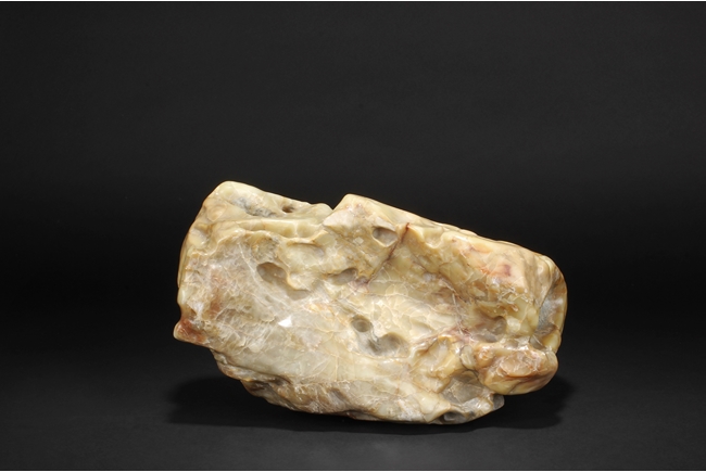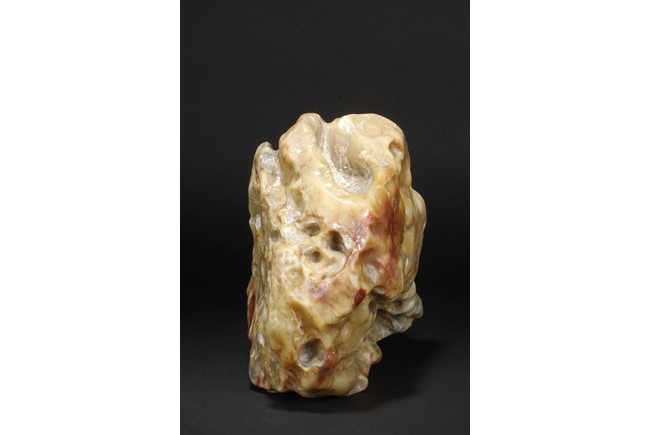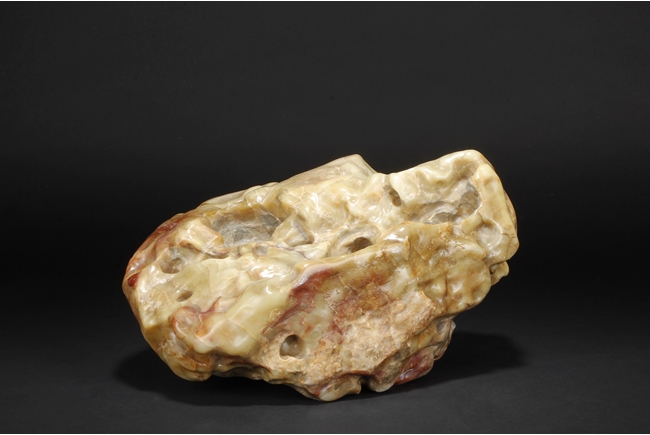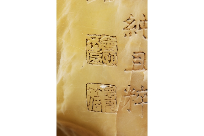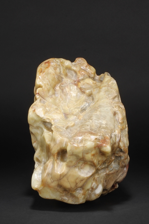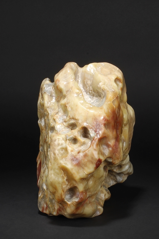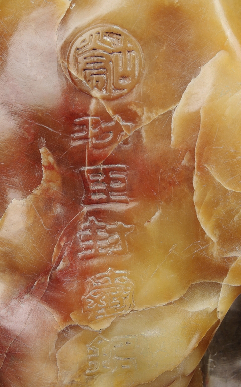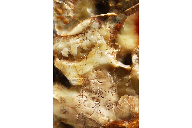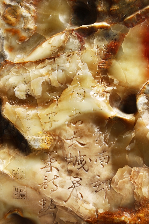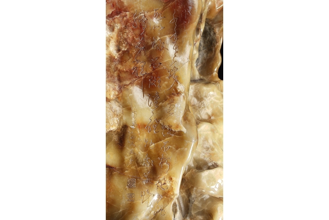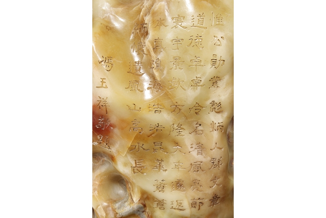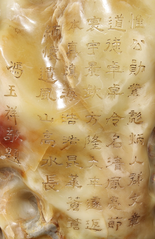 Of russet and caramel tone, this jade boulder is carved in naturalistic crag stone form. Situated on a wooden stand, the jade is incised with Imperial poems and inscription with seal marks on the front surface. On the reverse is incised with inscription by Feng Yuxiang, and another inscription on the top side. Qing Dynasty period.
