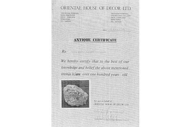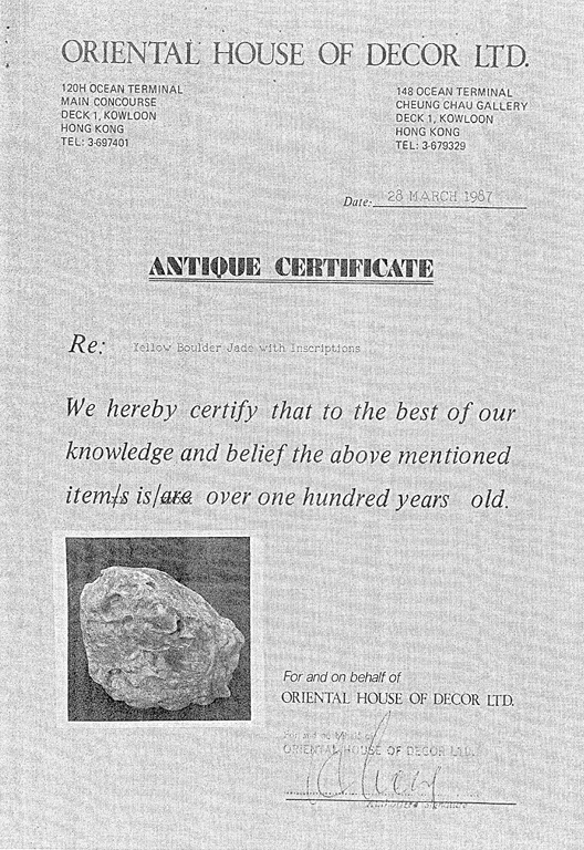 此玉山子擺件形態天然,上刻有乾隆禦銘詩一首,並有數位歷代名家所提詩文,品像大,少見,極富收藏價值,底座為後配。附有House of Decor LTD. 1987 年古玩鑒定証書
