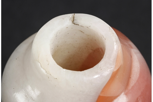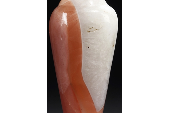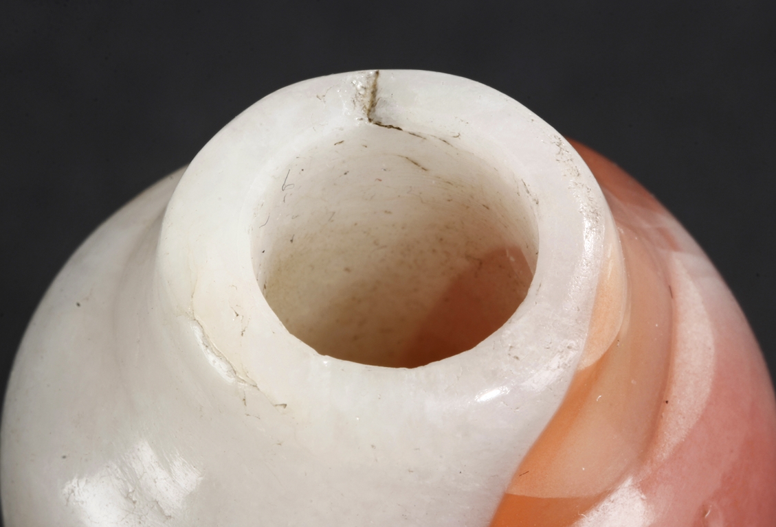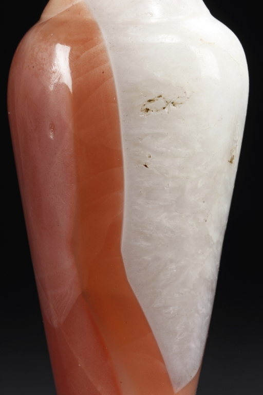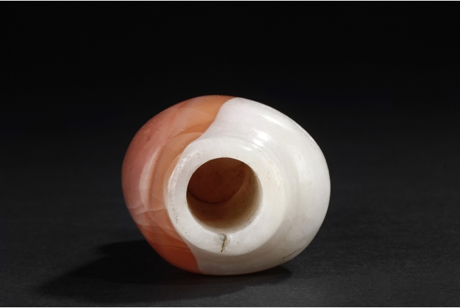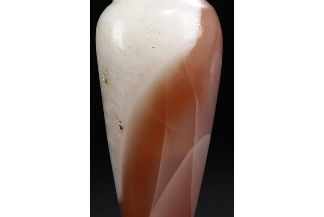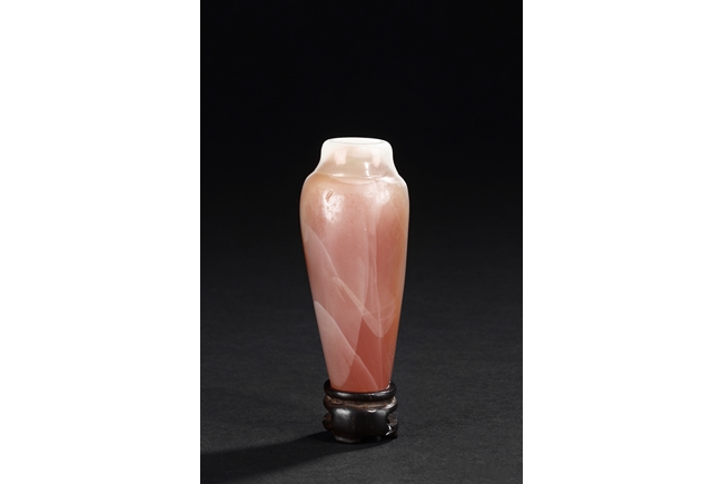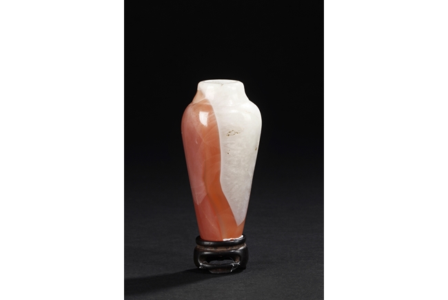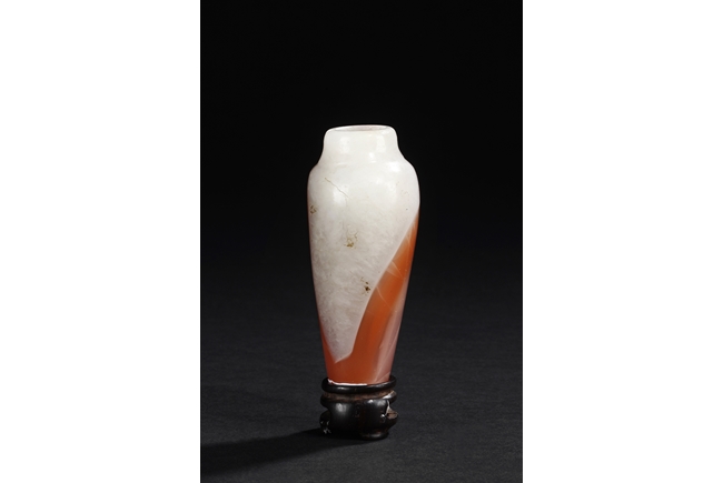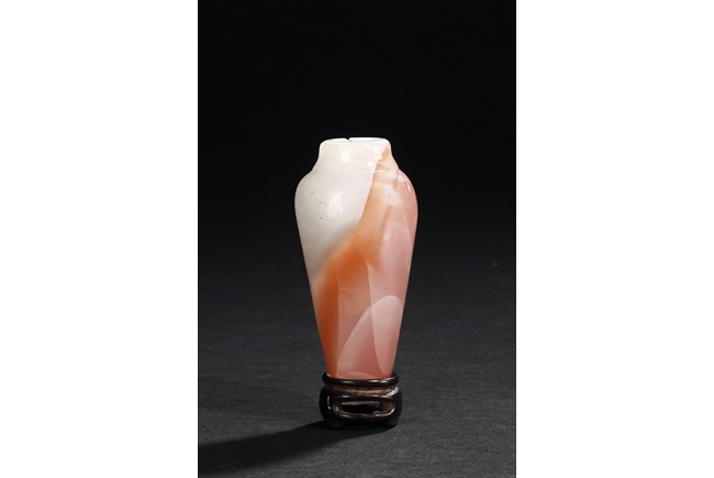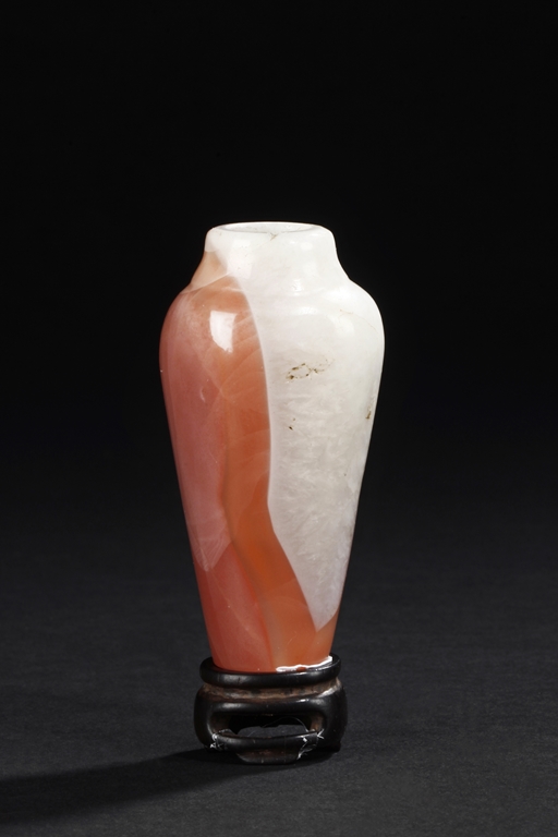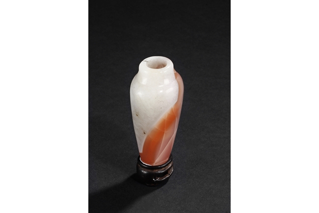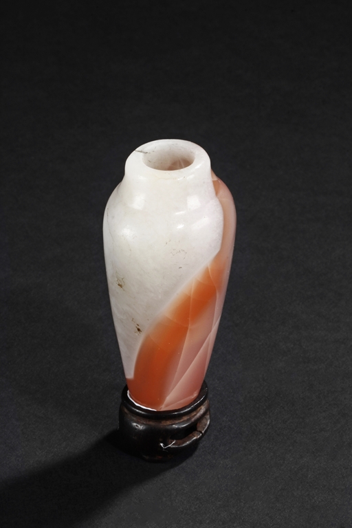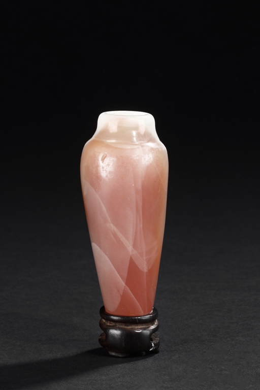 Of elegant baluster form, the small bottle made from agate with natural layered white, brown, and light red color, with slight translucency and inclusions, completed with a wooden stand. Qing Dynasty period.