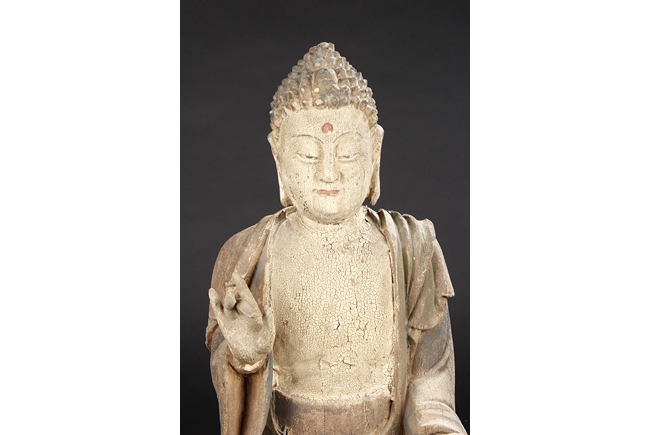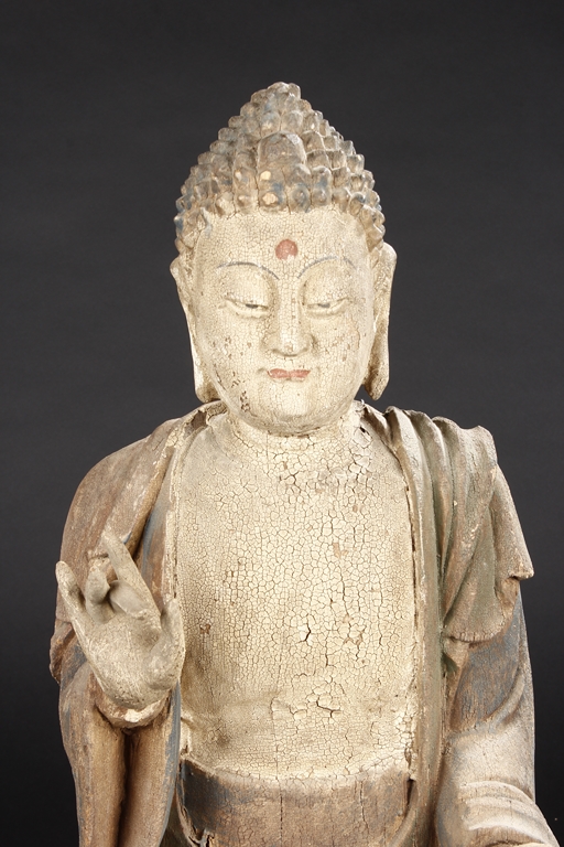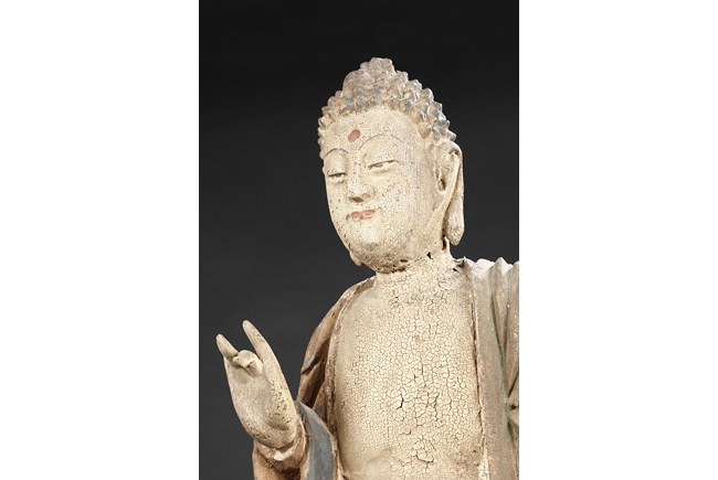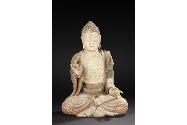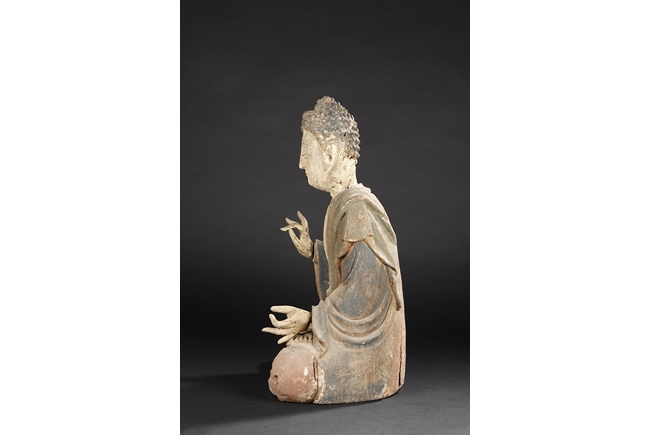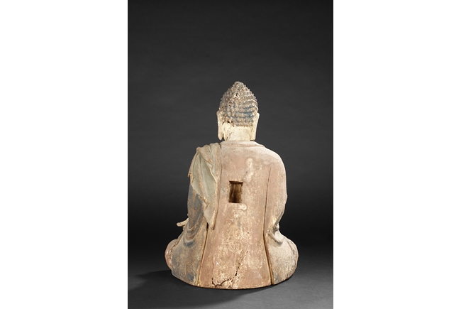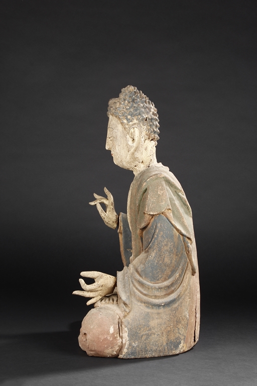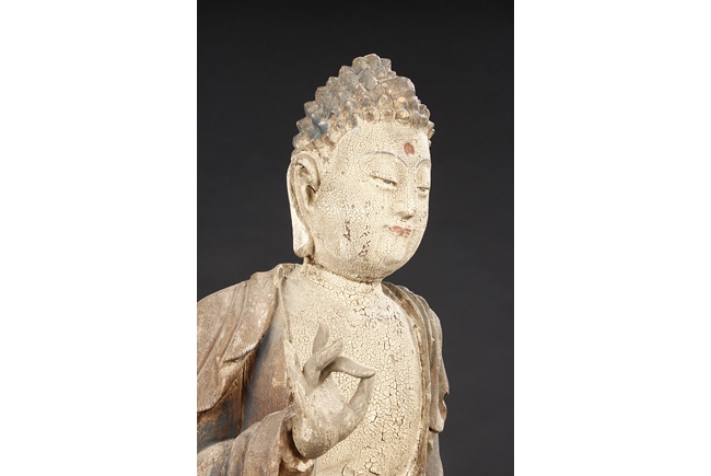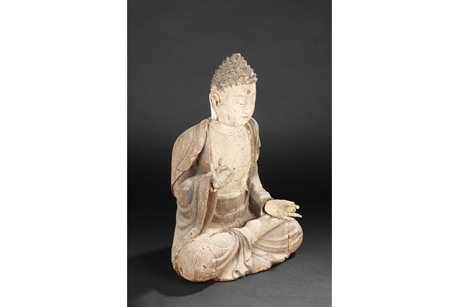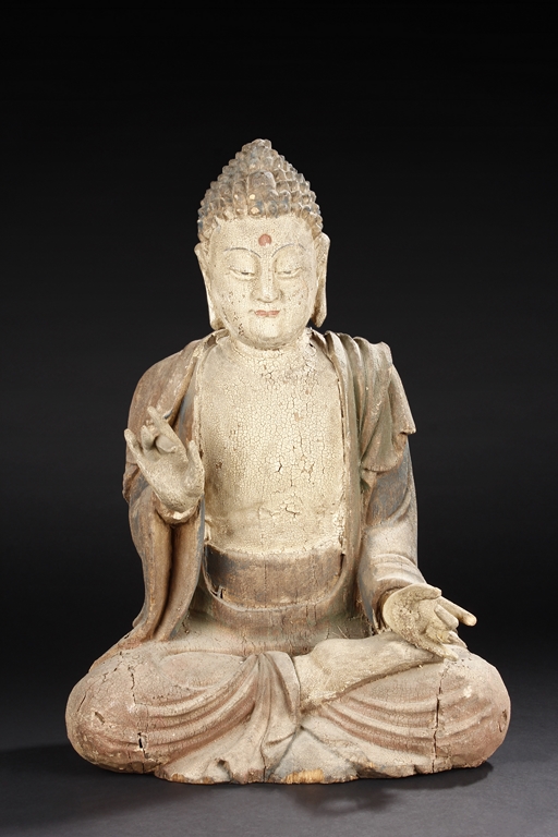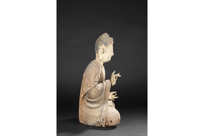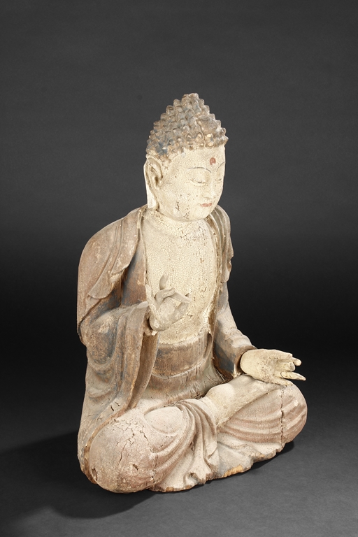 Seated in dhyansana in bare feet and both hands held in shuni mutra, the Buddha wears a long and loose robe tied at waist. His face is delicately carved with a serene expression and downcast eyes and hair is tied in ushinisha. The robes and hair are painted with pigments. Hands are detachable. Song Dynasty Period.