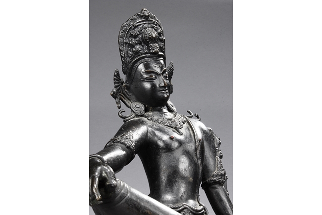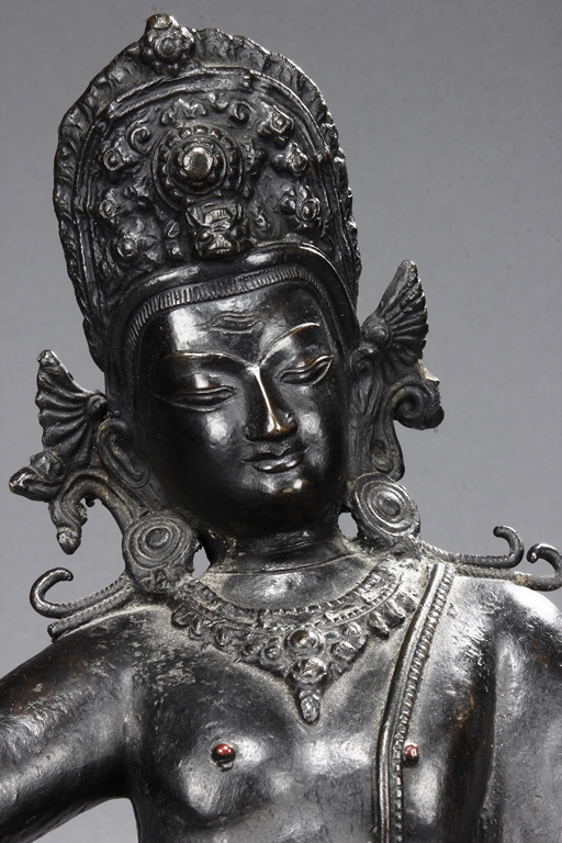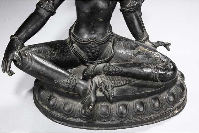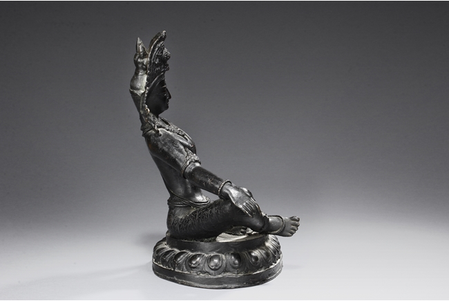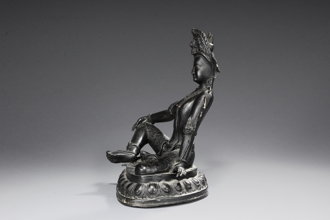 Seated in lalitasana on top of a lotus throne pad, right hand on top of the knee cap, left hand supporting the body weight on the pad, Bodhisattva Tara wears decorative ornaments such as necklace, arm band, wrist band, waist band, and crown, her eyes closed with serene expression. The well casted statue with black exterior, and hollow interior from the underside. Qing Dynasty Period.