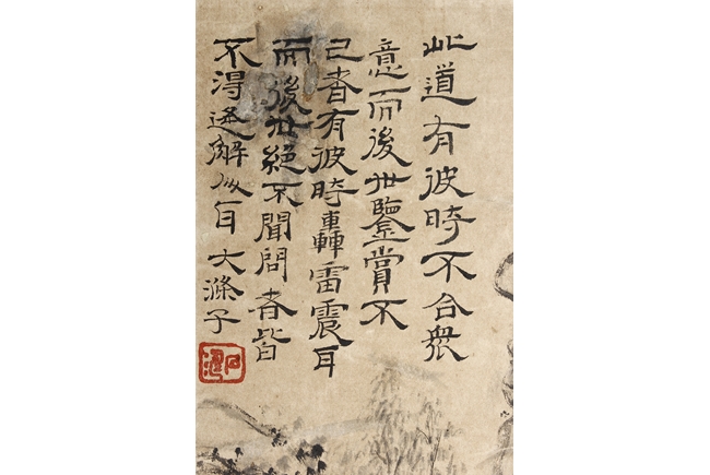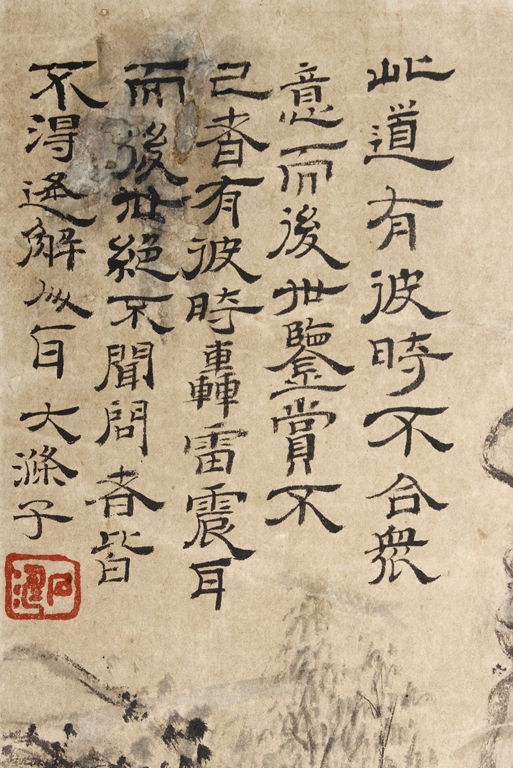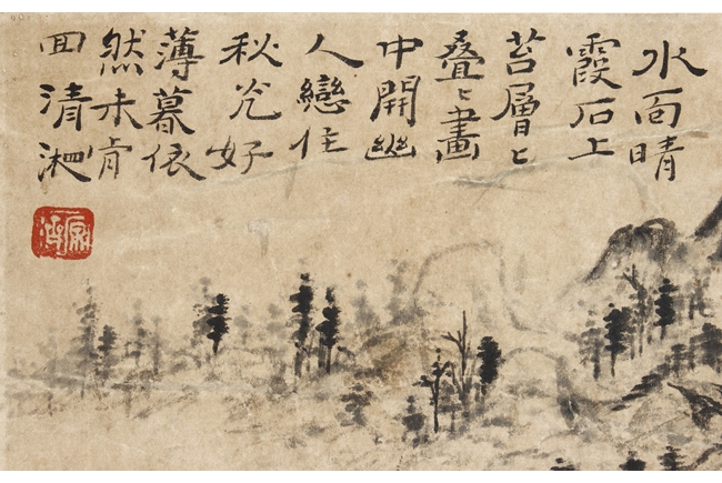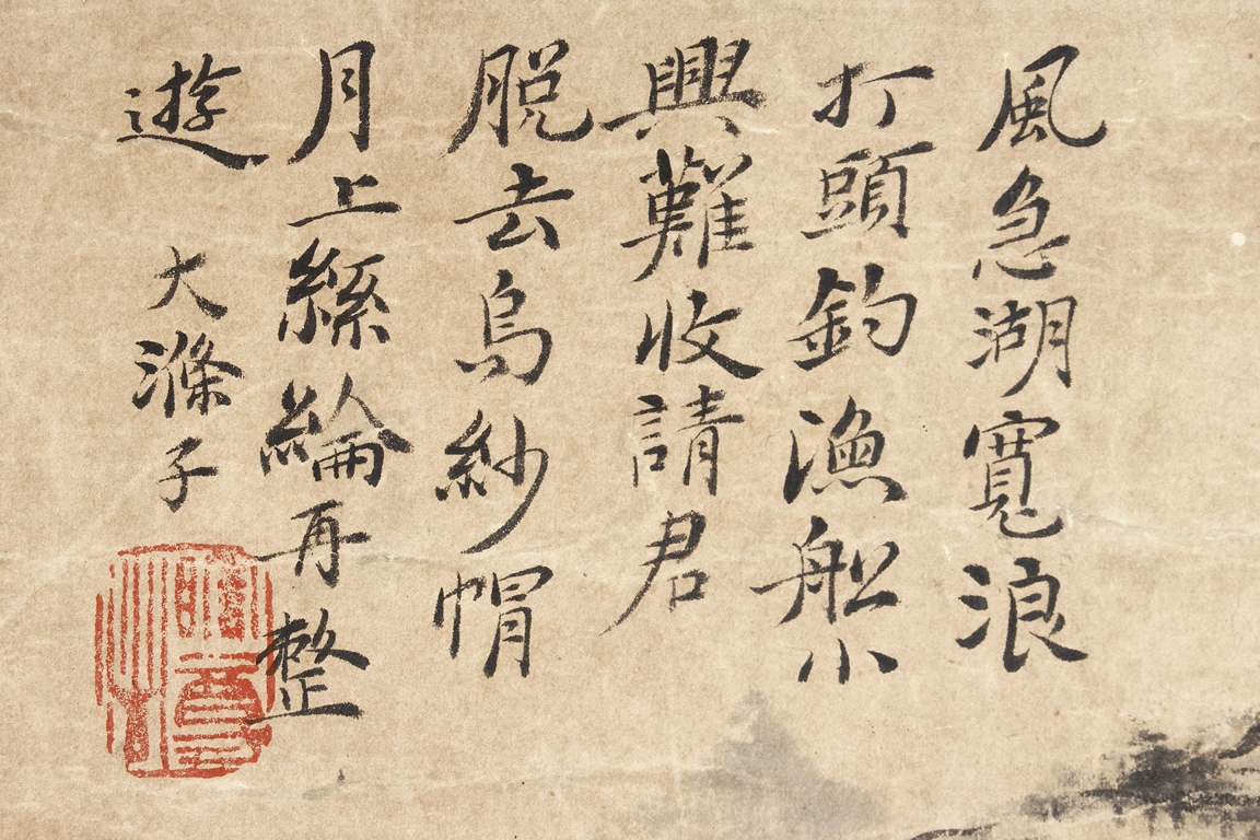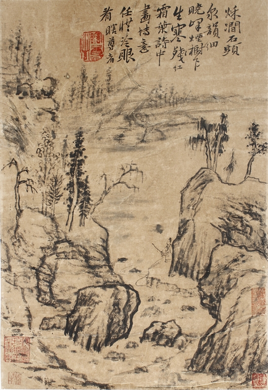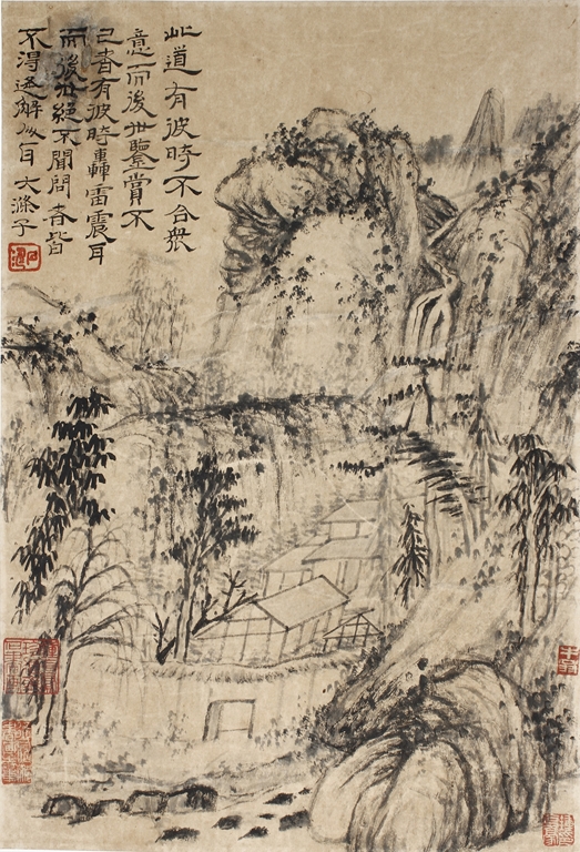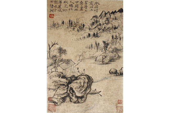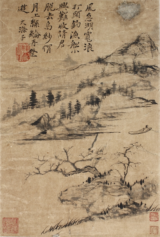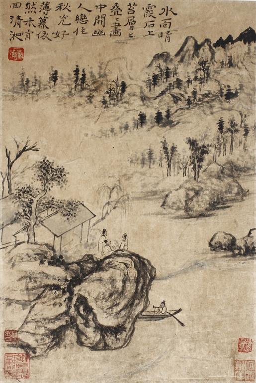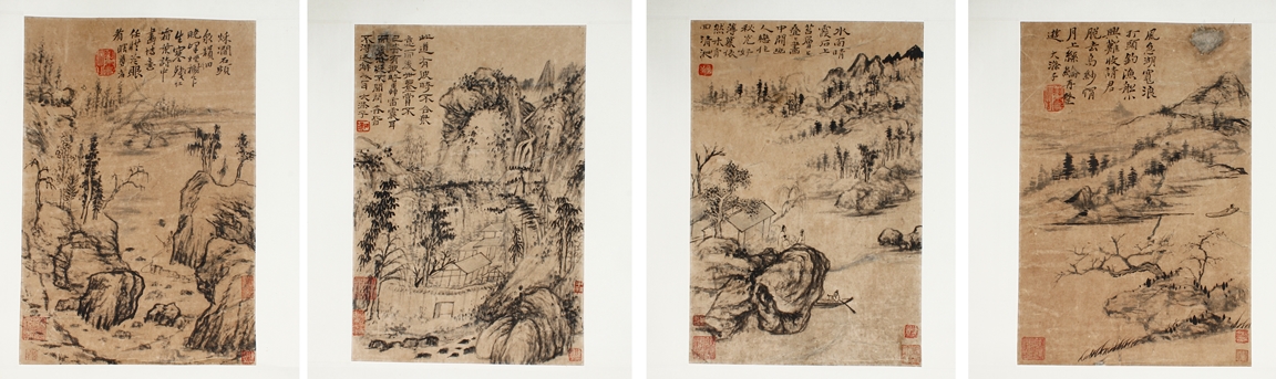 Ink on paper, the set of four paintings depict different landscape scenery surrounding rivers and mountains, with villages, people, and boats, all with colophon, artist signature and mark "Shi Tao" on the top, and additional marks on the bottom.