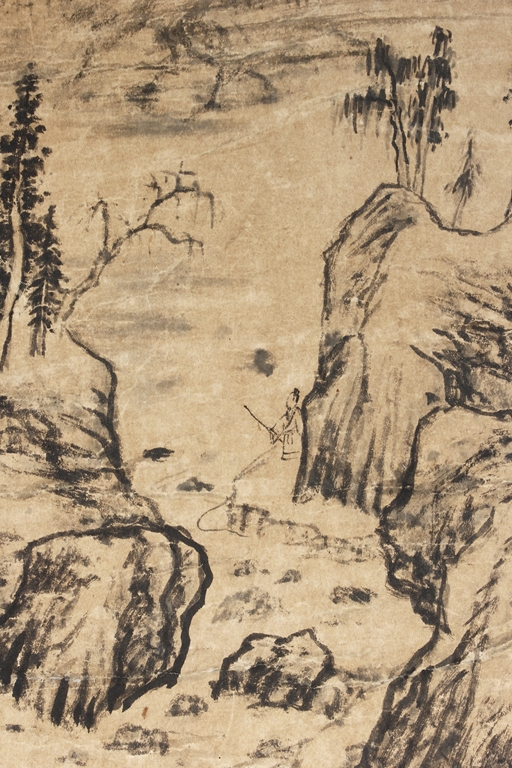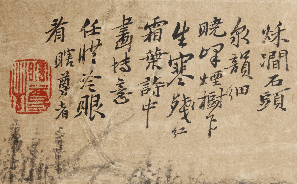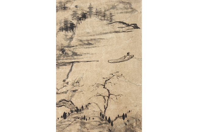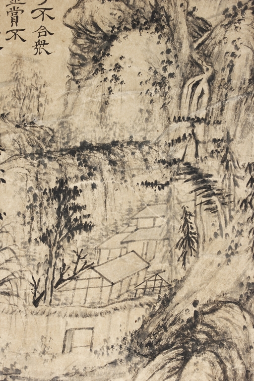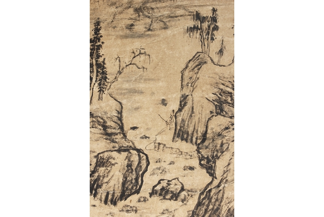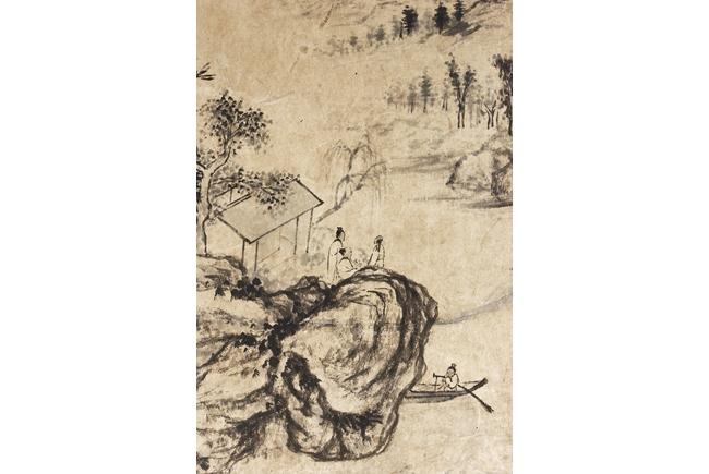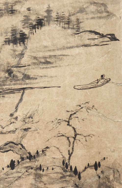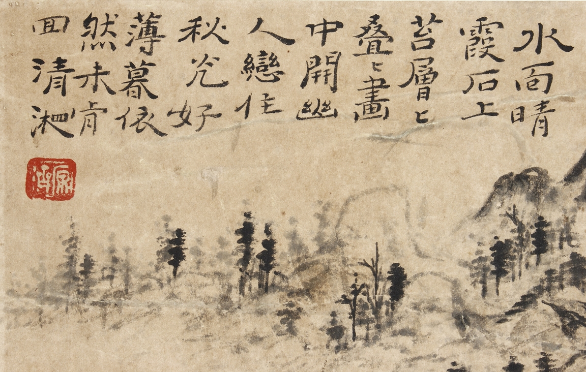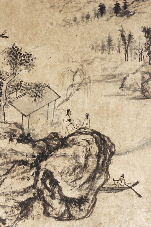 Ink on paper, the set of four paintings depict different landscape scenery surrounding rivers and mountains, with villages, people, and boats, all with colophon, artist signature and mark "Shi Tao" on the top, and additional marks on the bottom.