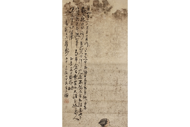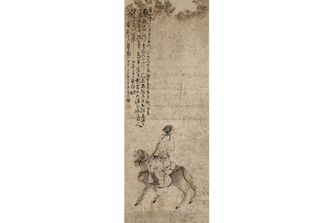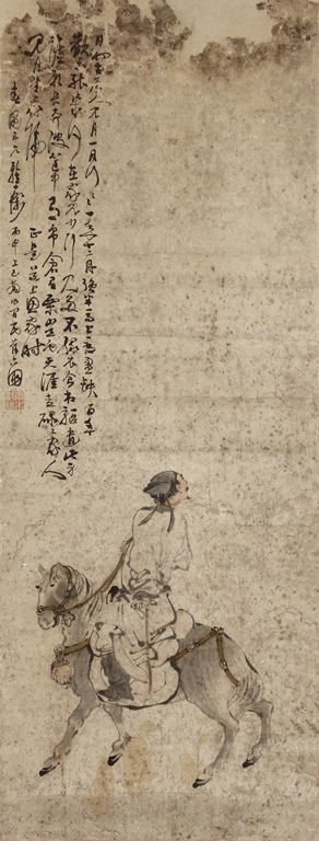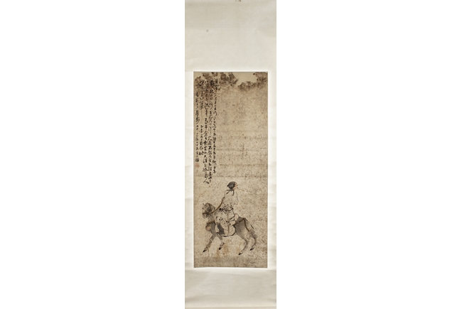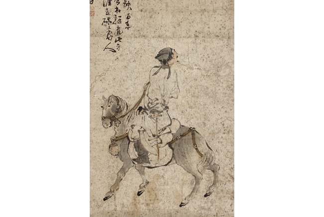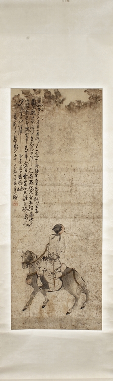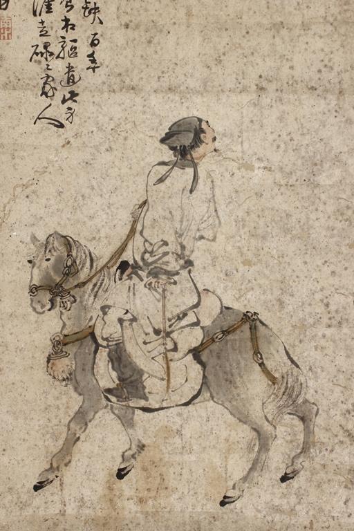 Color and ink on paper, the painting depicts a man riding on a gray horse, looking towards his right side into the distance. Poetry calligraphy, artist signature and mark "Su Liupeng" on the top left corner. Signs of damage on the very top of painting.