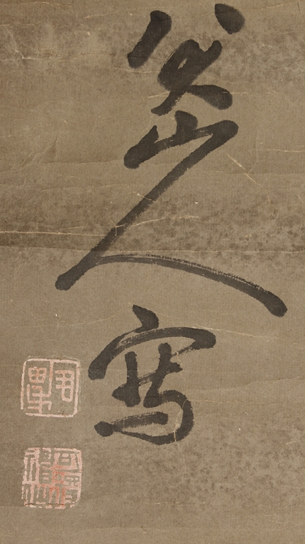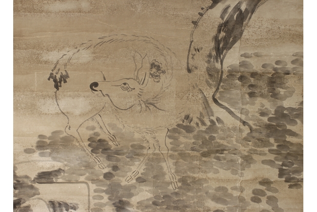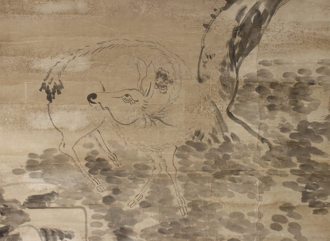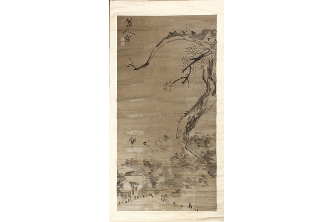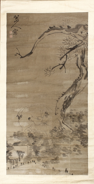 Ink on paper, the painting depicts a lone deer under a pine tree, turning around on top of grassland, artist signature and mark "Ba Da Shan Ren" on top left corner.