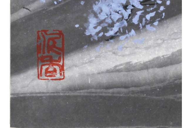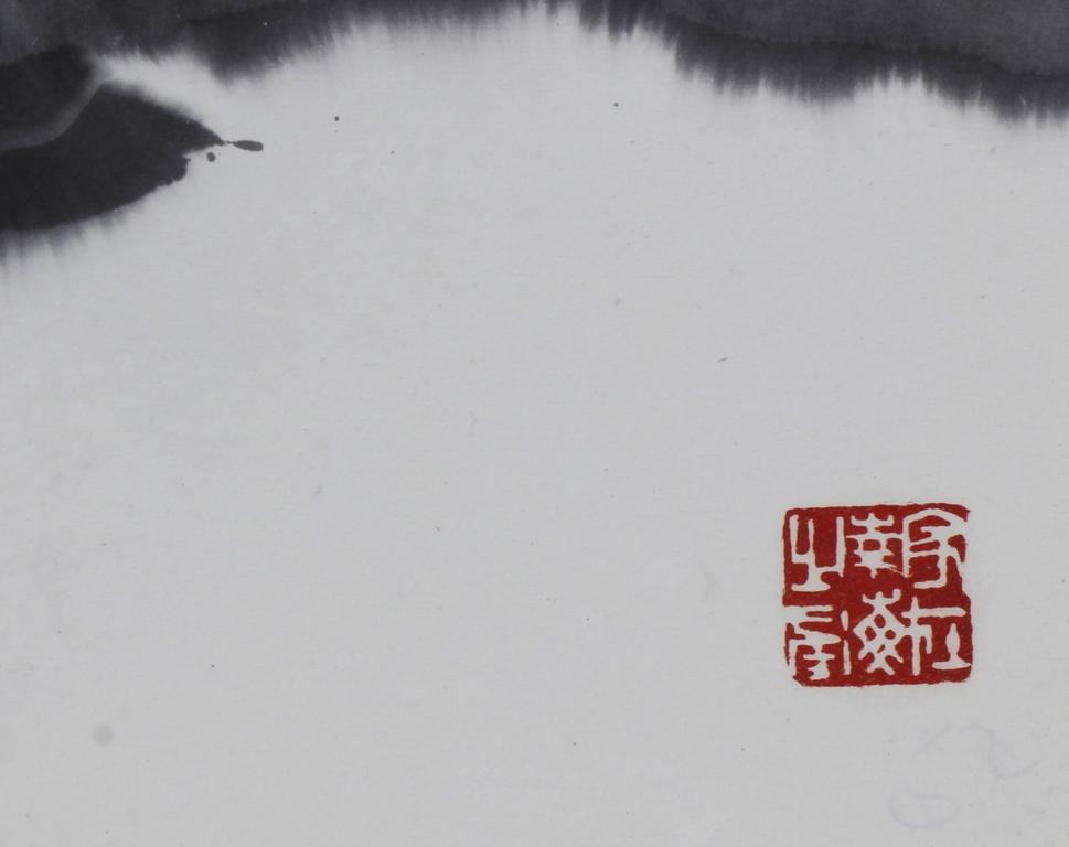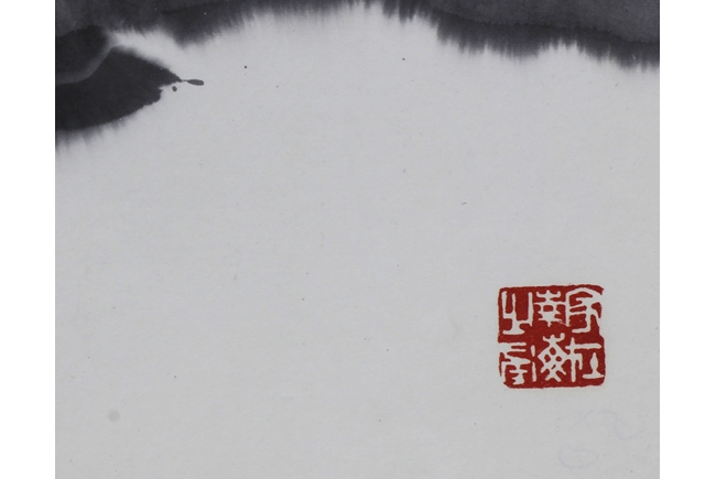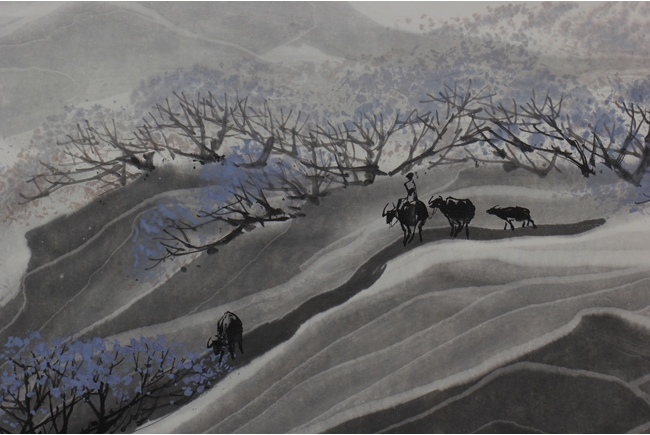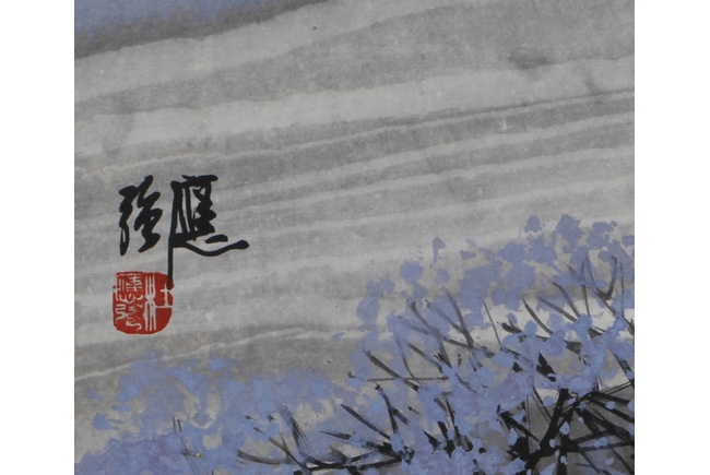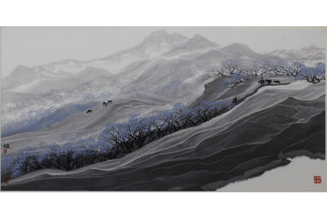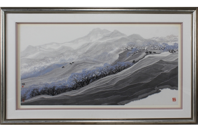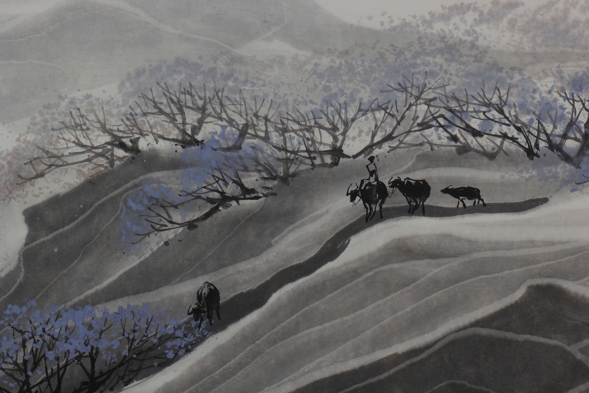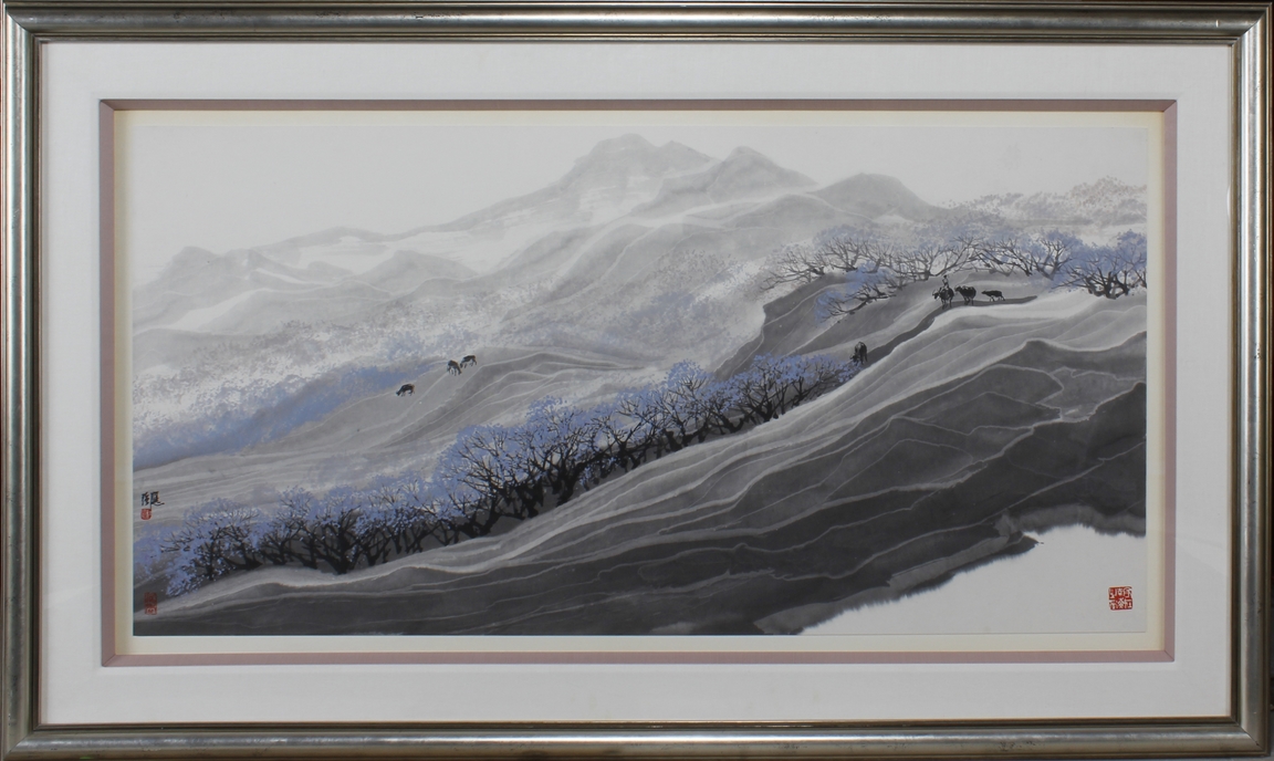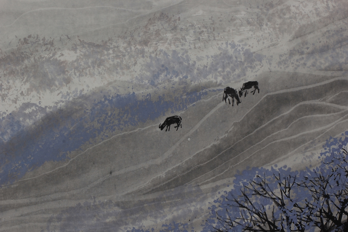 The painting depicts buffalo grazing and resting on the hills. The hills' depth is represented with ink gradient. Artist's signature and seals on the bottom left.